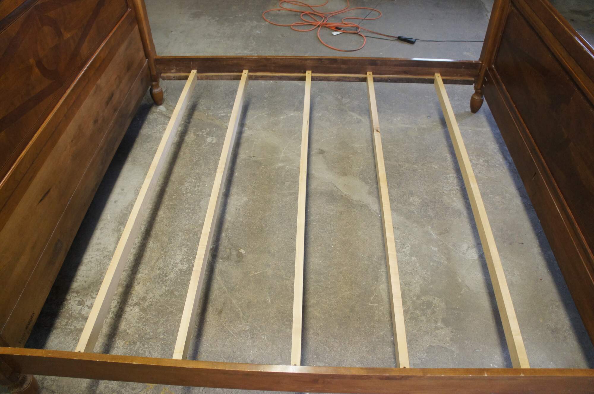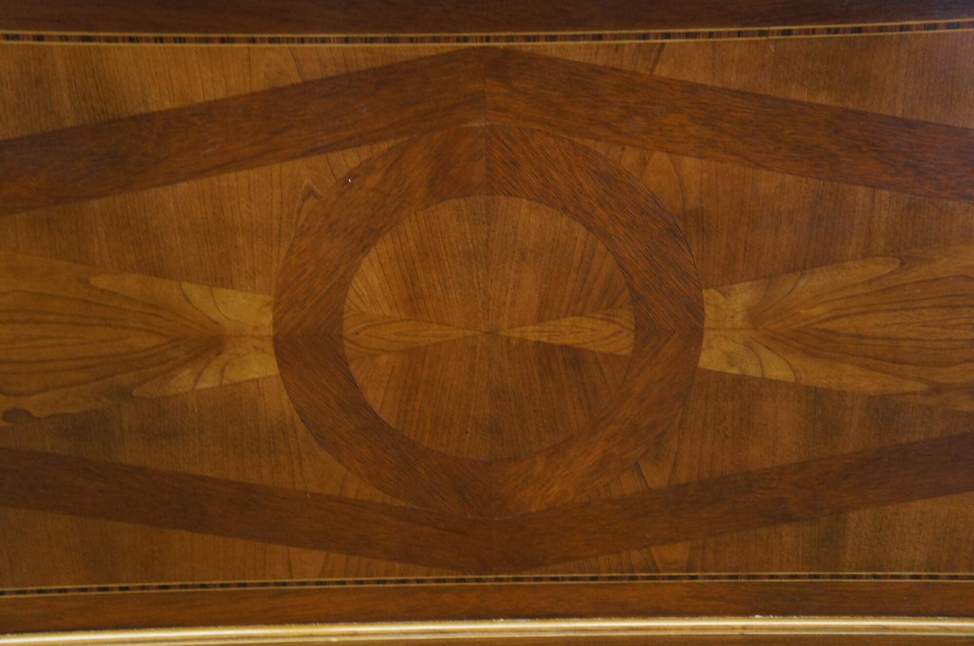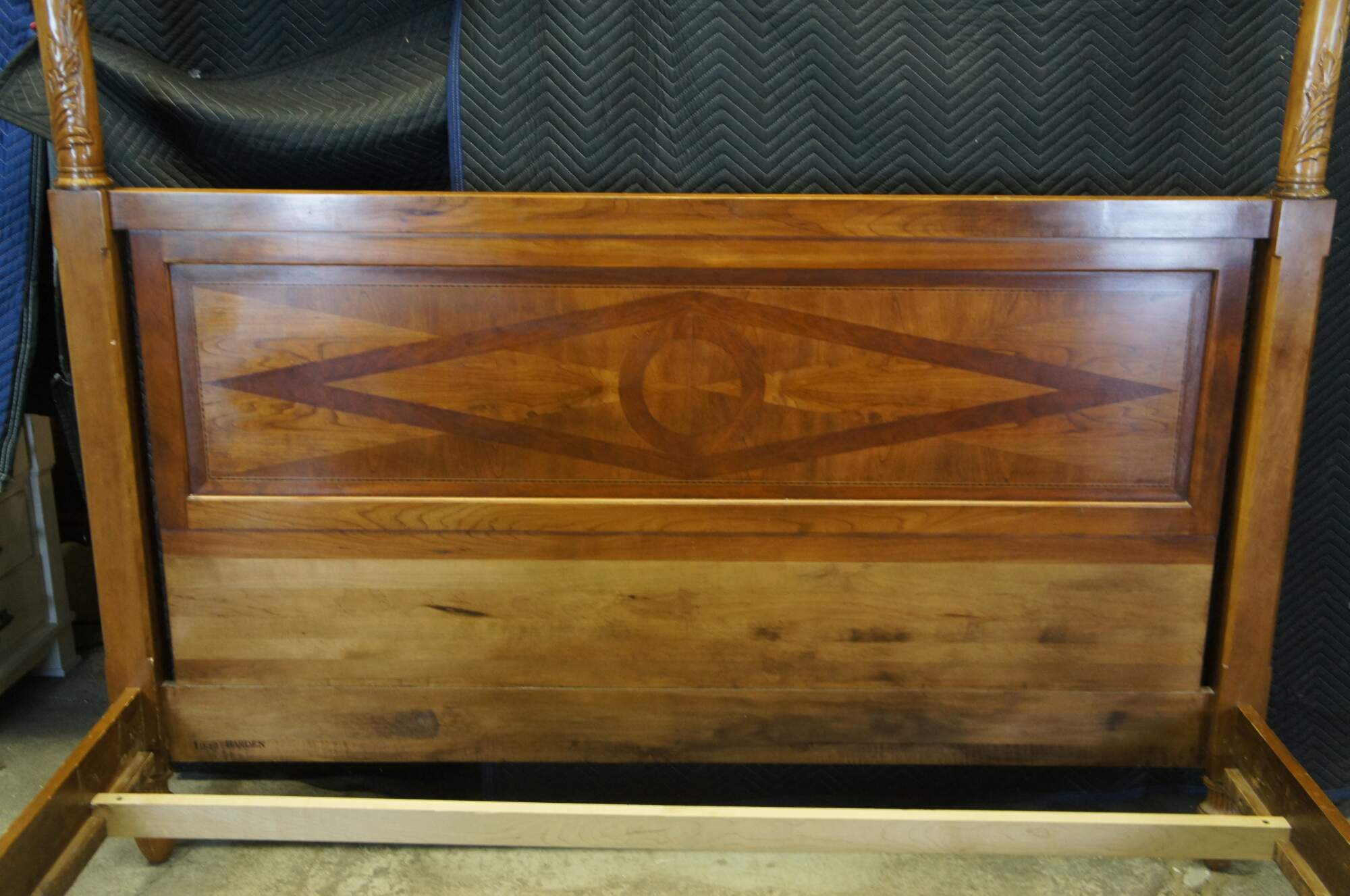 An exceptional King size canopy bed by Harden Furniture; circa 1980s. Drawing inspiration from Italian and Neoclassical styling with a hint of French Empire flare. Made from solid Cherry with marquetry inlaid head and footboards in a diamond pattern with cross banding. The post are neatly carved with a spiraled acanthus and fluted design. The canopy perfectly frames the bed with diamond carved corners, applied ormolu and acorn finials. The frame includes cross rails and is supported by toupie feet. A remarkable example of master craftmanship. Marked Harden 1944.