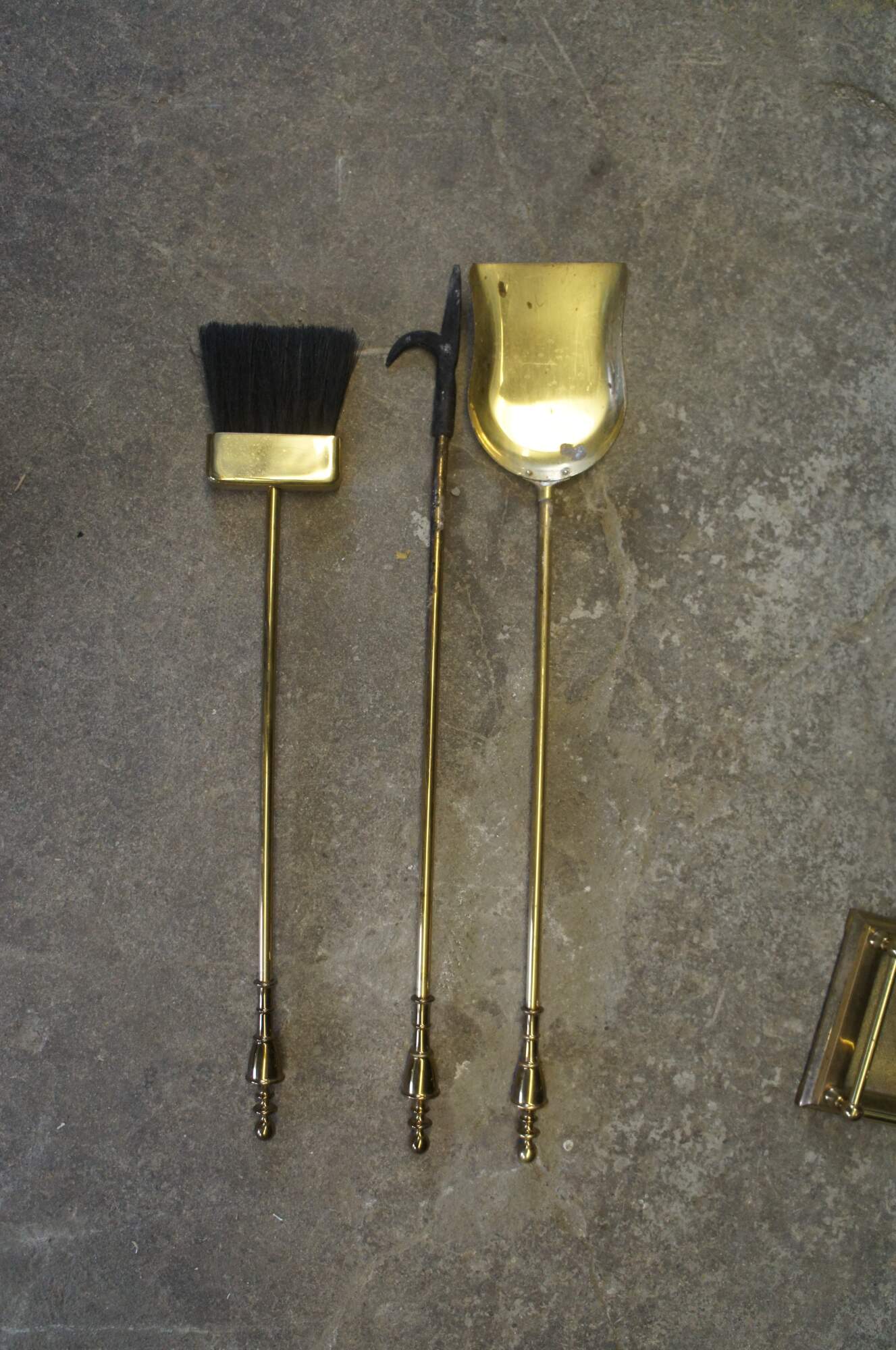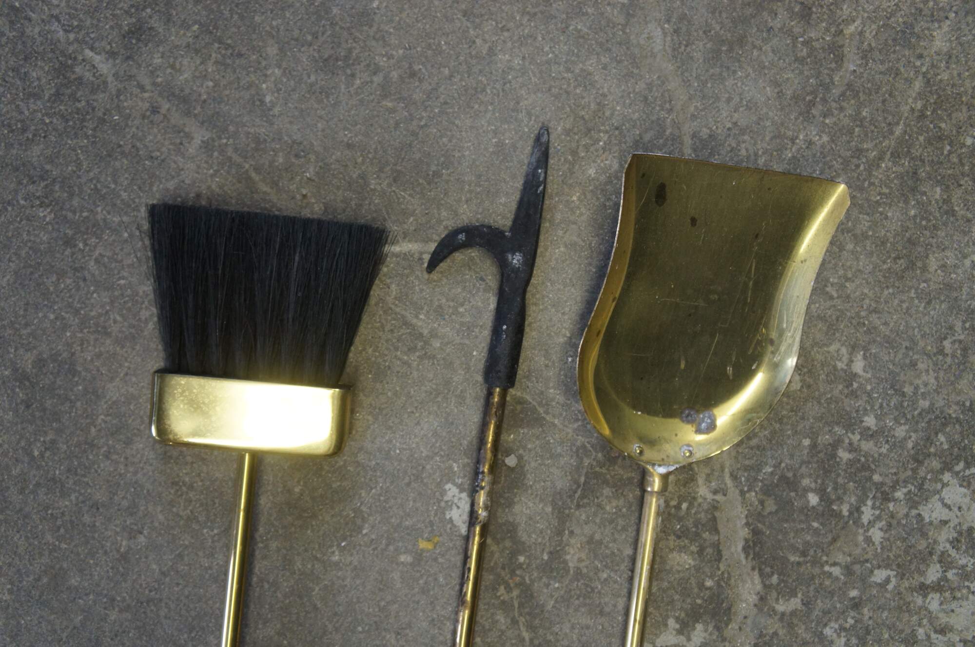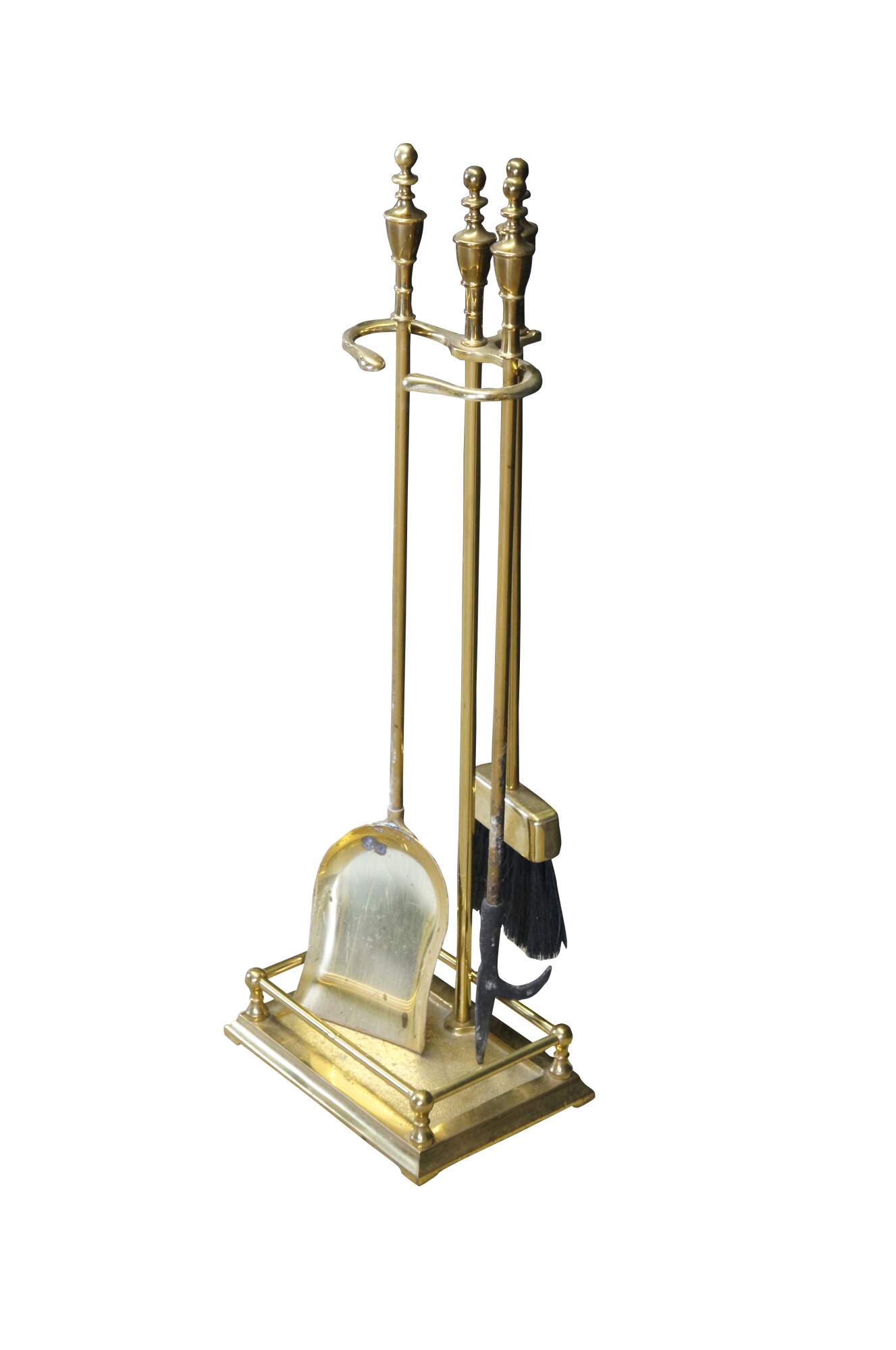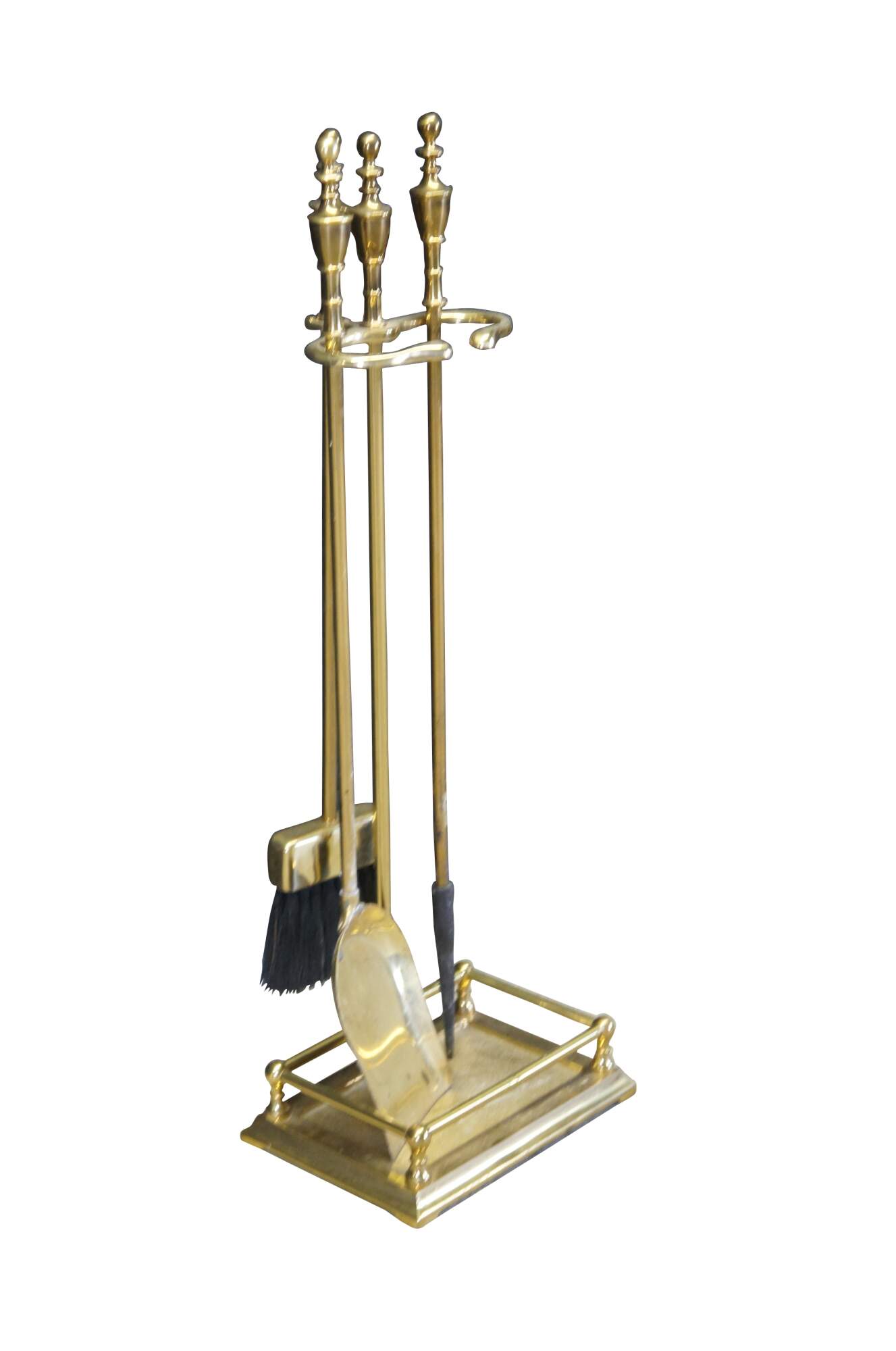 Vintage French Empire style brass fireplace tools. Includes a poker, shovel and brush. Neatly designed with trophy finials for handles.