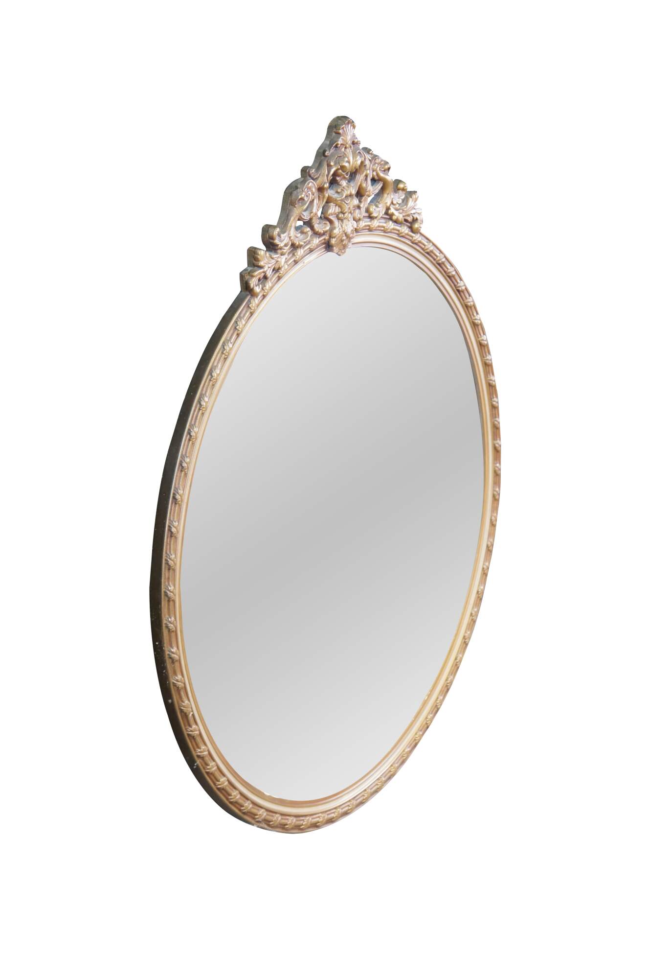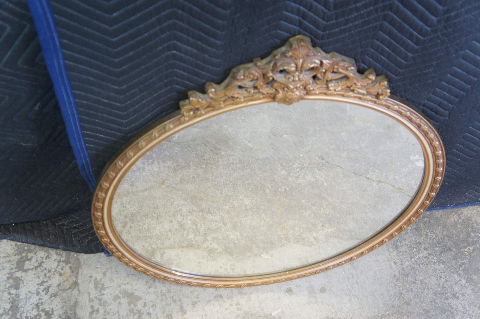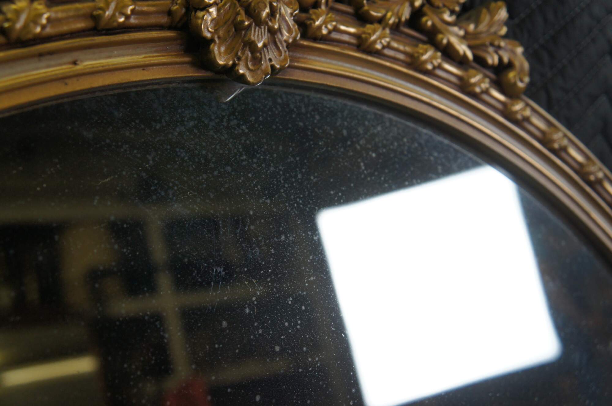 An antique Late Victorian mirror with neoclassical acanthus ribboned motif and ornate scalloped foliate crown. Made from wood with applied gesso.