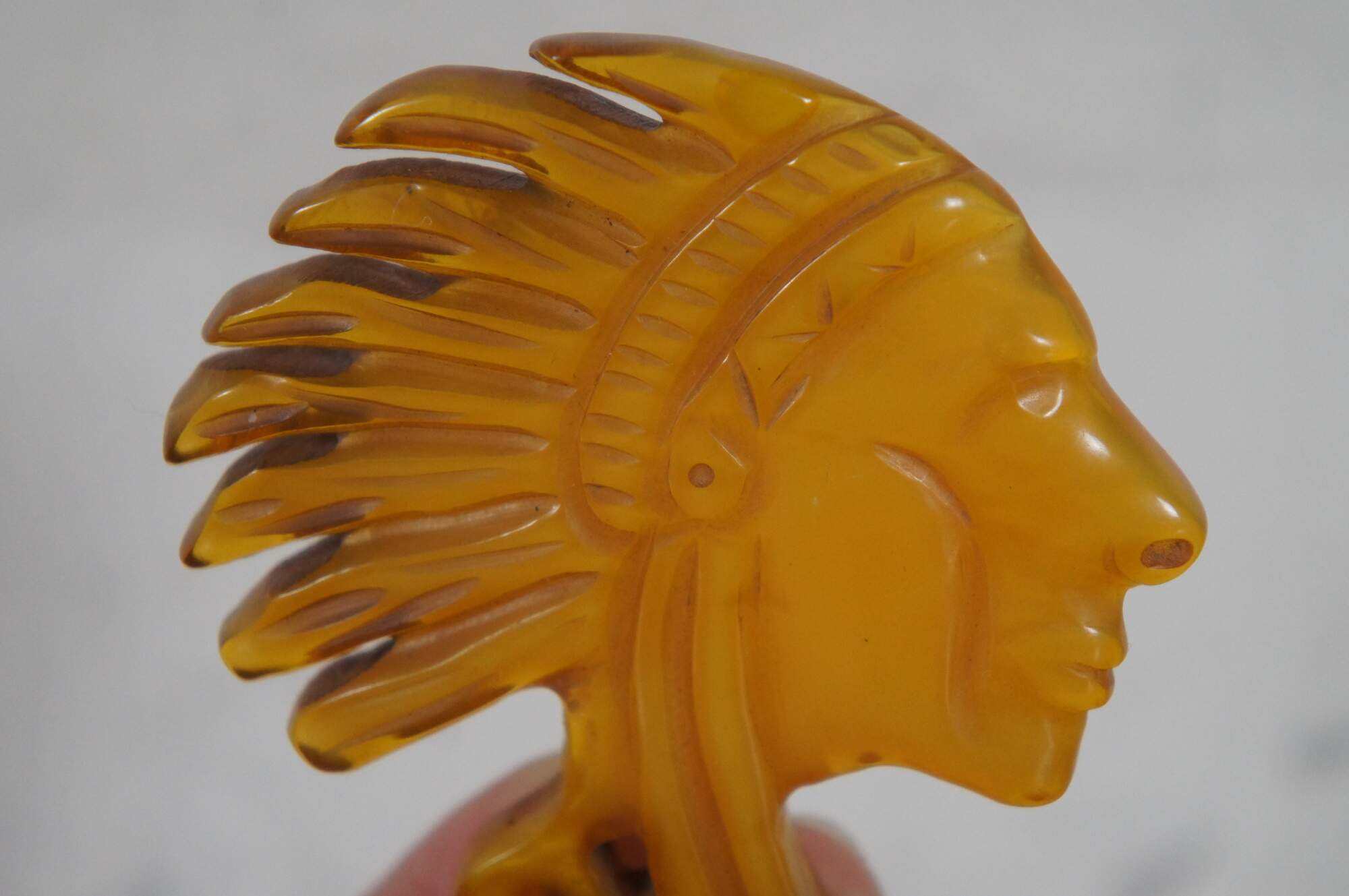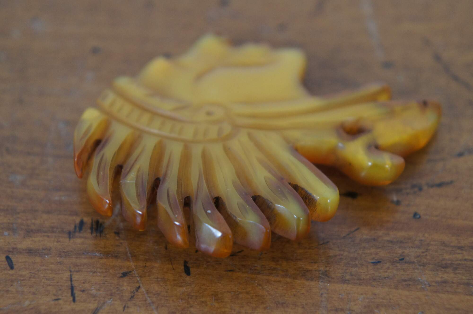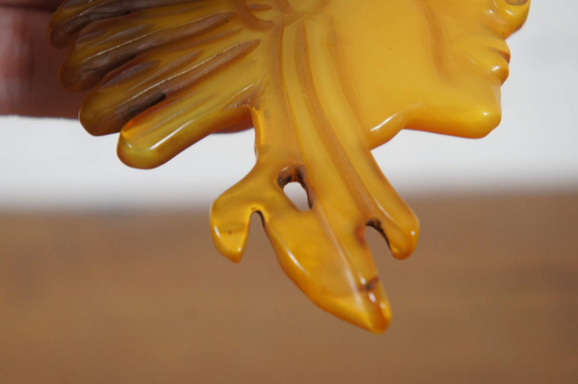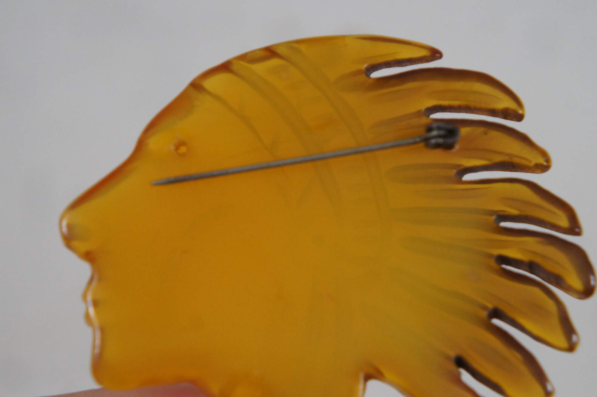 Early to mid 20th century translucent yellow, egg yolk Bakelite pin / brooch carved in the shape of a Native American / “Indian Chief” wearing a feathered headdress. Straight pin back. Swab tested.