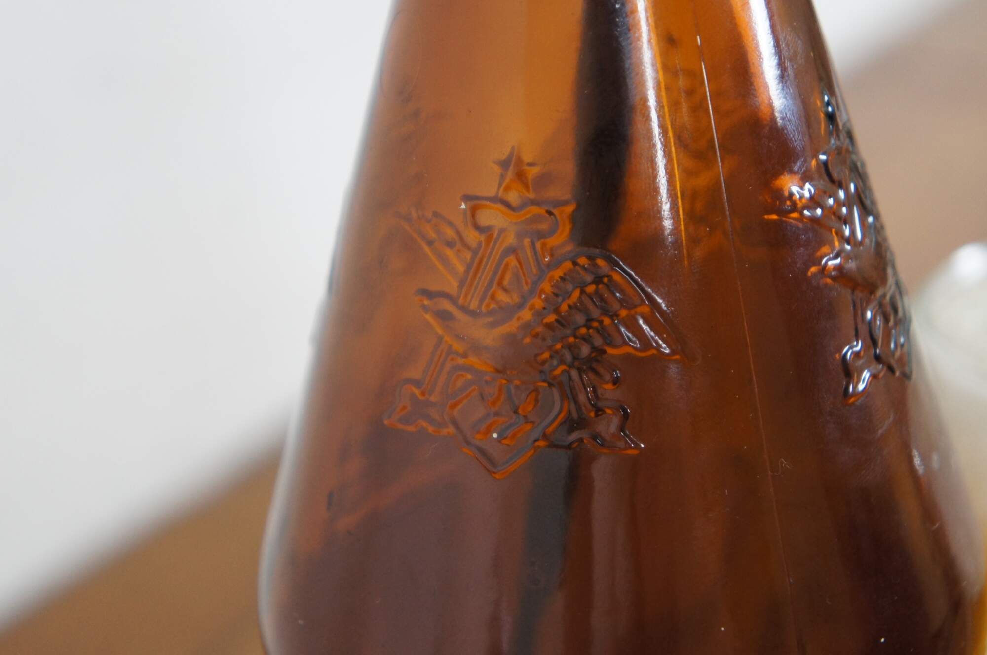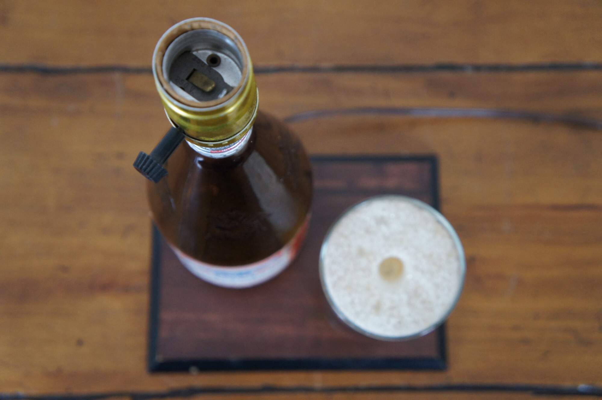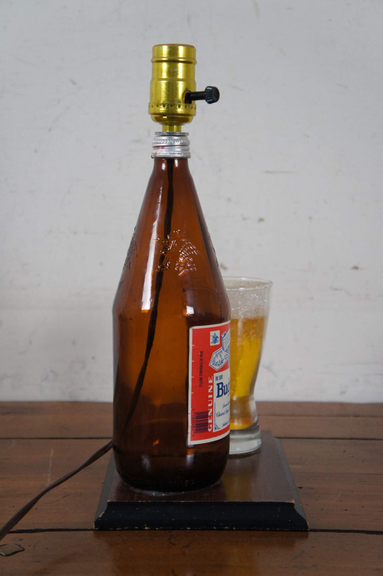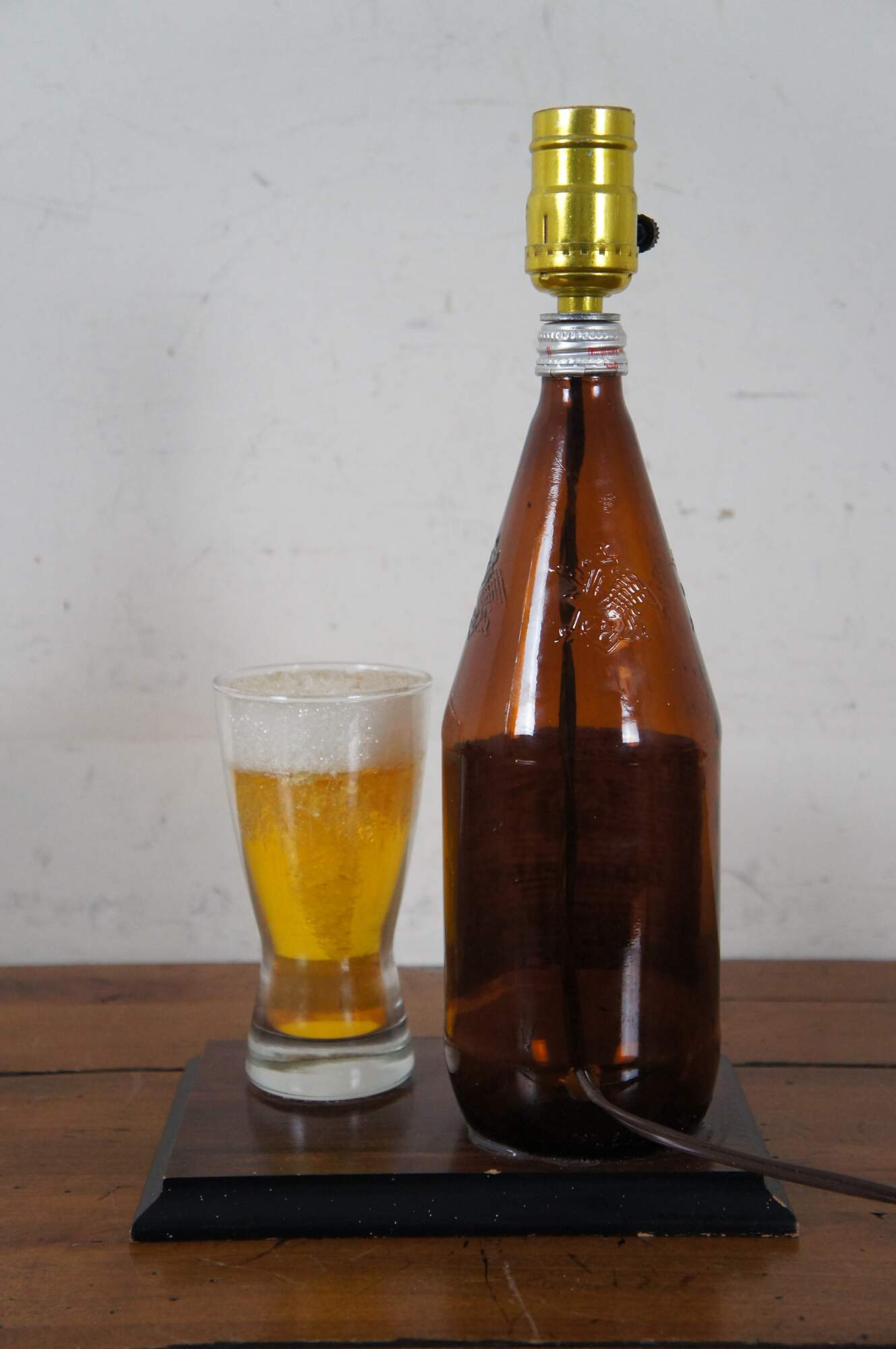 Vintage beer bottle and drinking glass table lamp, crafted from a repurposed Budweiser beer bottle, mounted on a wooden plaque for a base, next to a beer glass filled with amber colored resin “beer” and topped with a frothy Styrofoam “head.” Budweiser Beer is produced by Anheuser-Busch Inc.