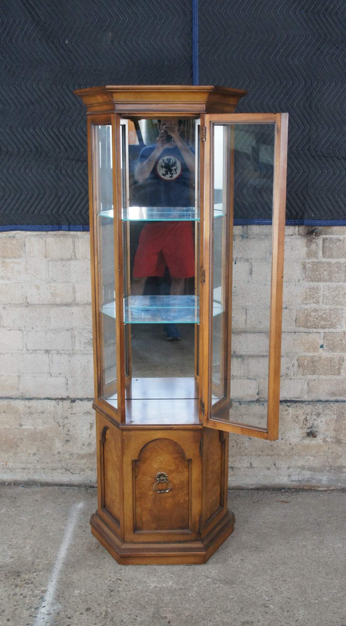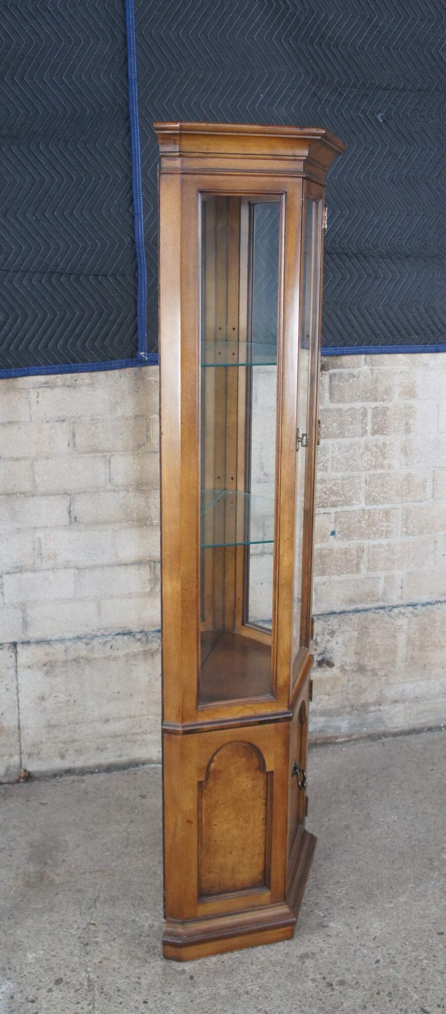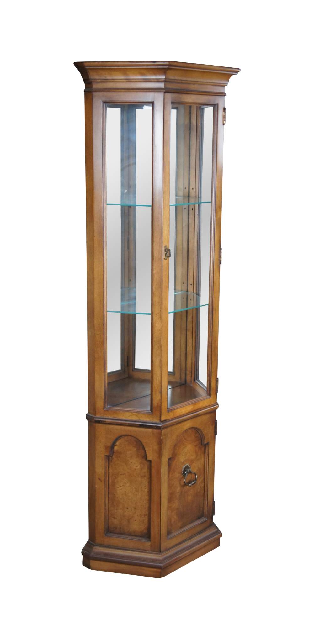 Vintage American of Chicago curio cabinet or display case. Made of walnut featuring a three sided half hexagon design with paneled cabinet base supporting a tall curio cabinet with adjustable tiered shelving.