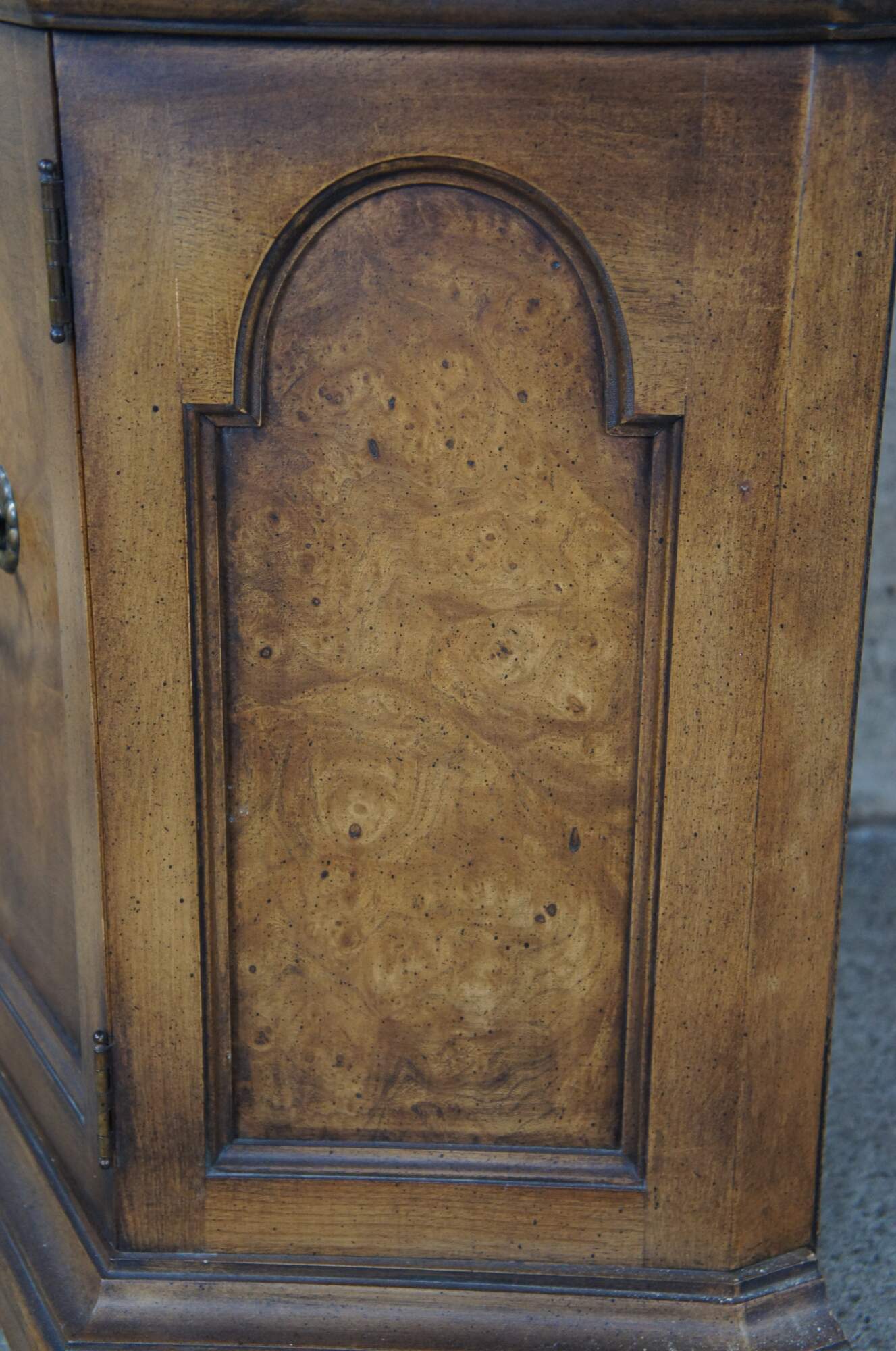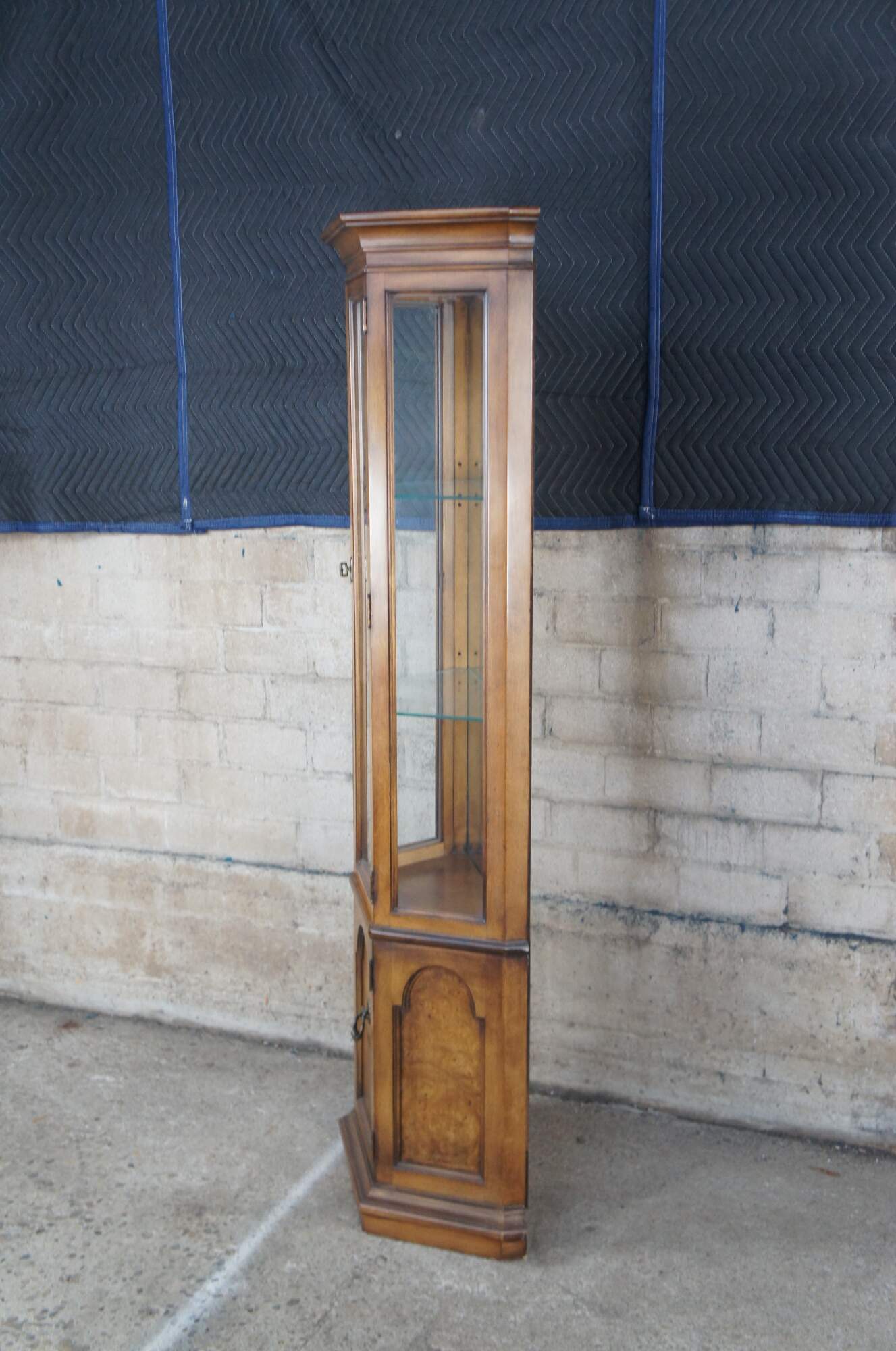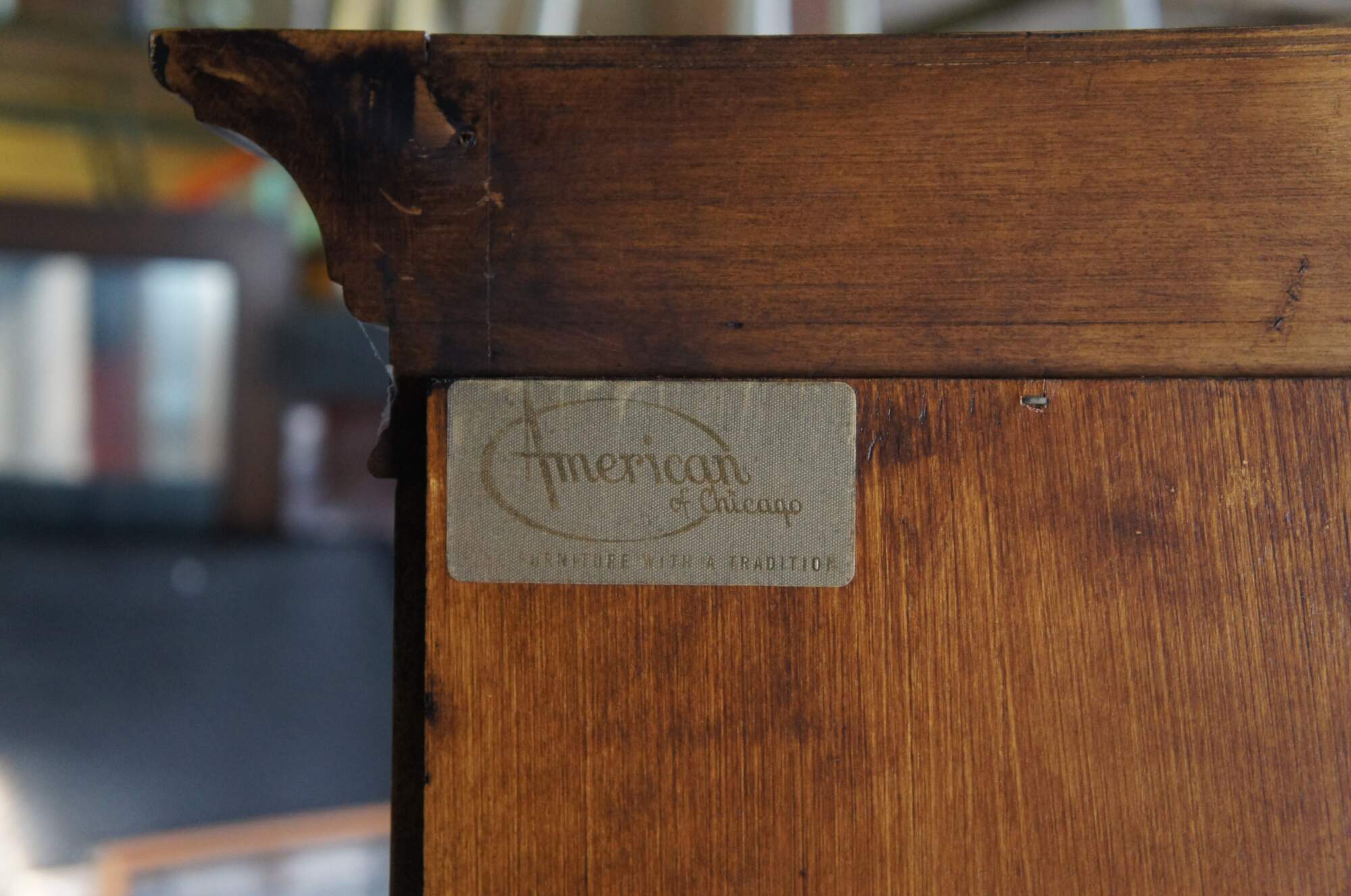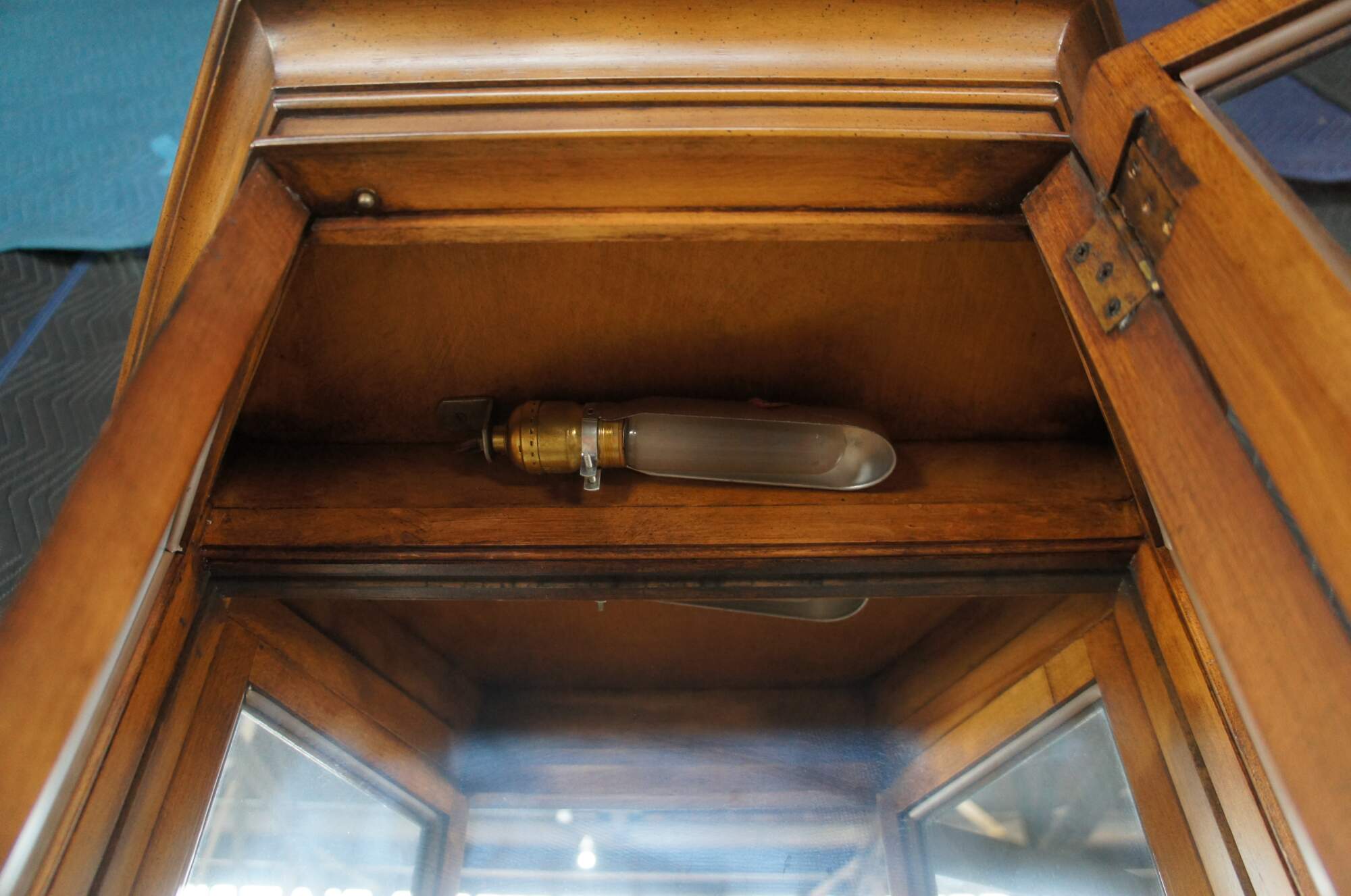 Vintage American of Chicago curio cabinet or display case. Made of walnut featuring a three sided half hexagon design with paneled cabinet base supporting a tall curio cabinet with adjustable tiered shelving.