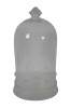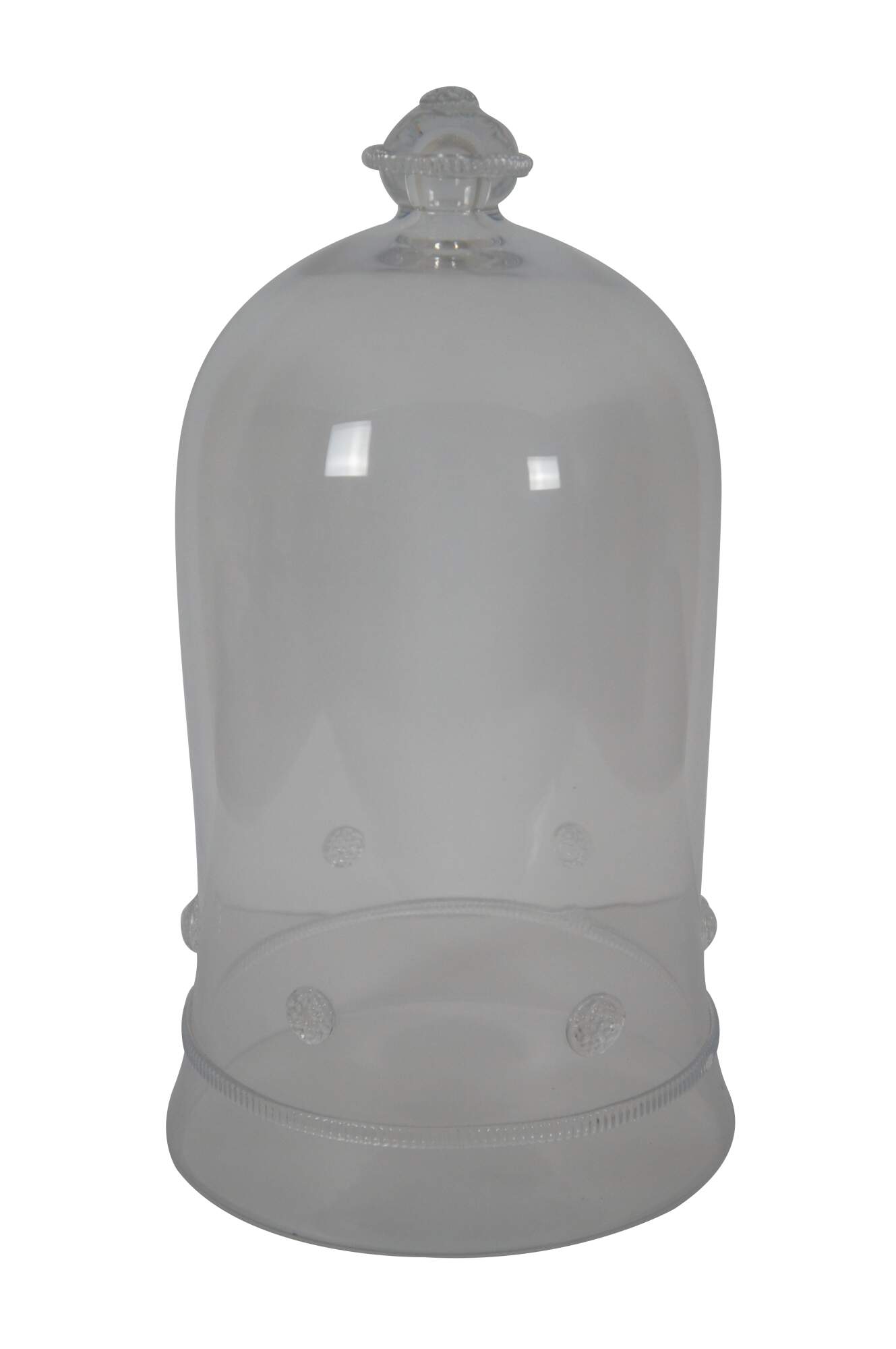 Juliska clear art glass tall dome comver / cloche / bell jar in the Isabella pattern, featuring a ridged band around the base and studded with six beaded medallions. Brand hand etched at base.