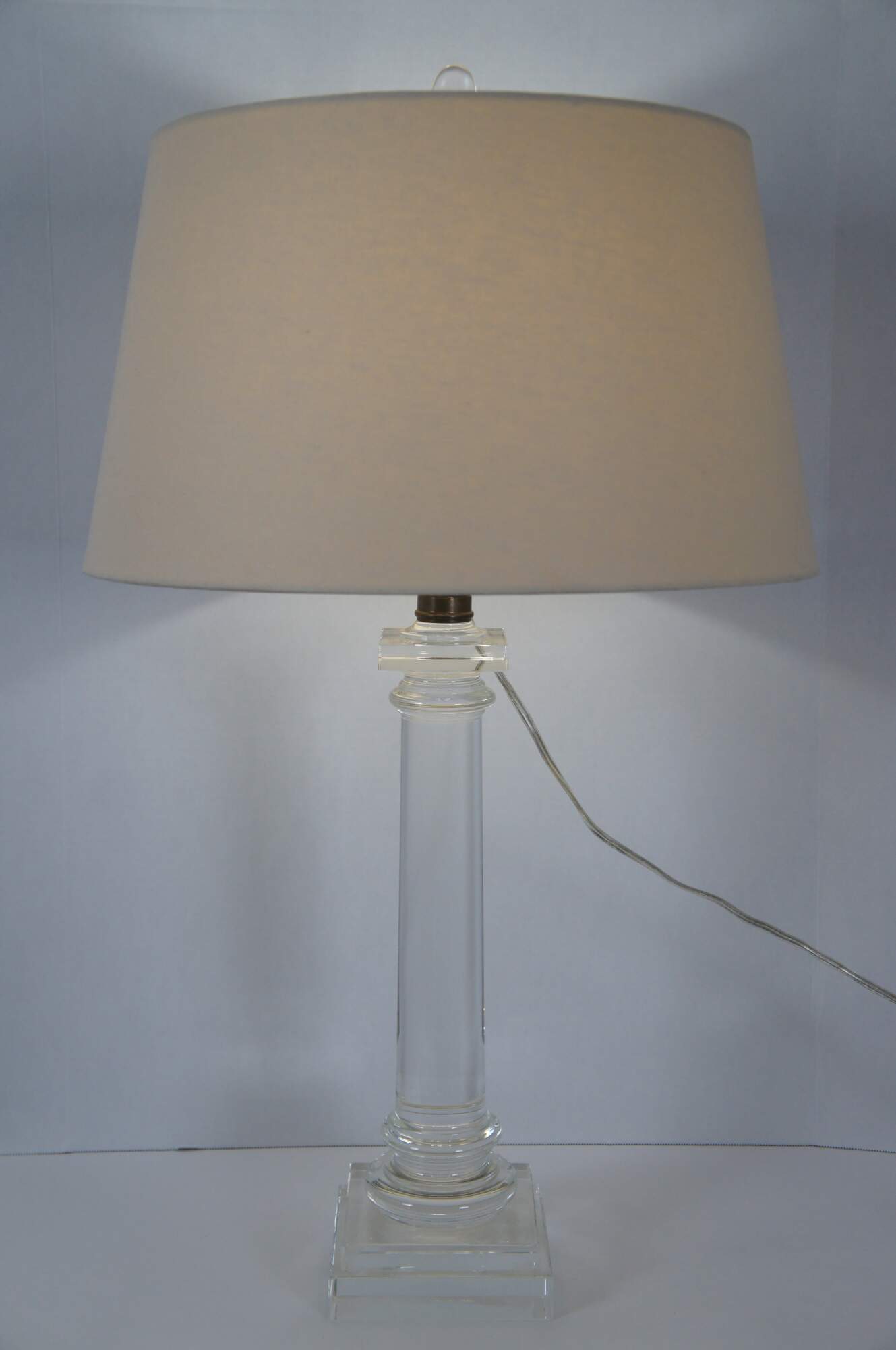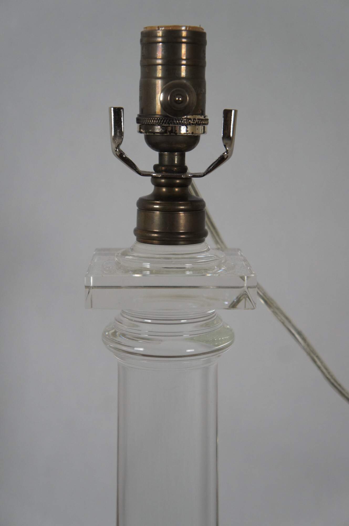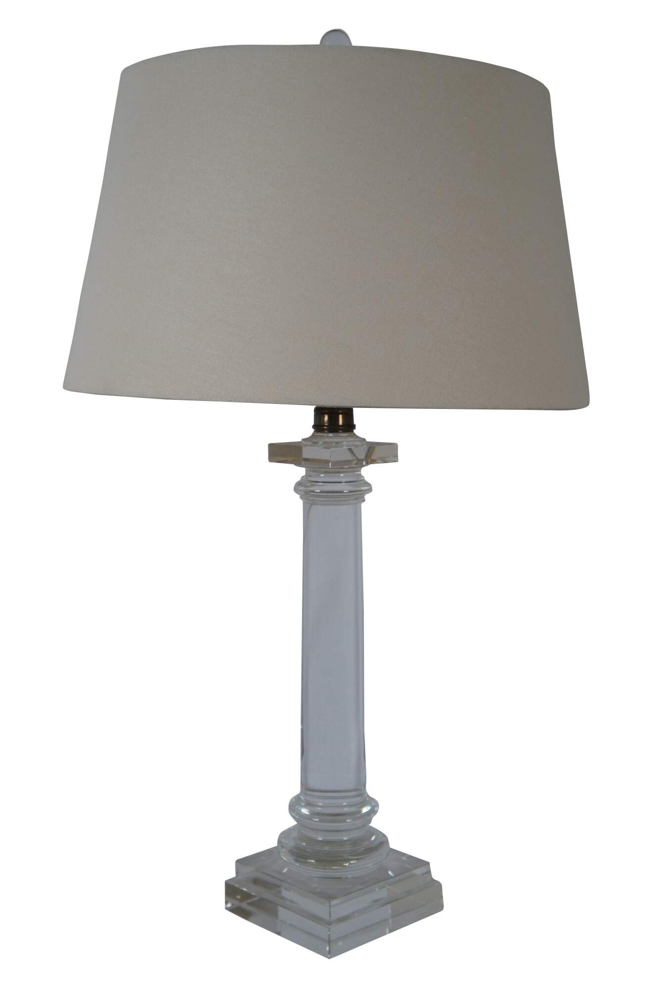 Visual Comfort Neoclassical clear crystal table lamp in the shape of a Corinthian column / pillar. Includes an off-white linen shade by Tanner Kenzie and droplet shaped lucite finial. Circa 2007.