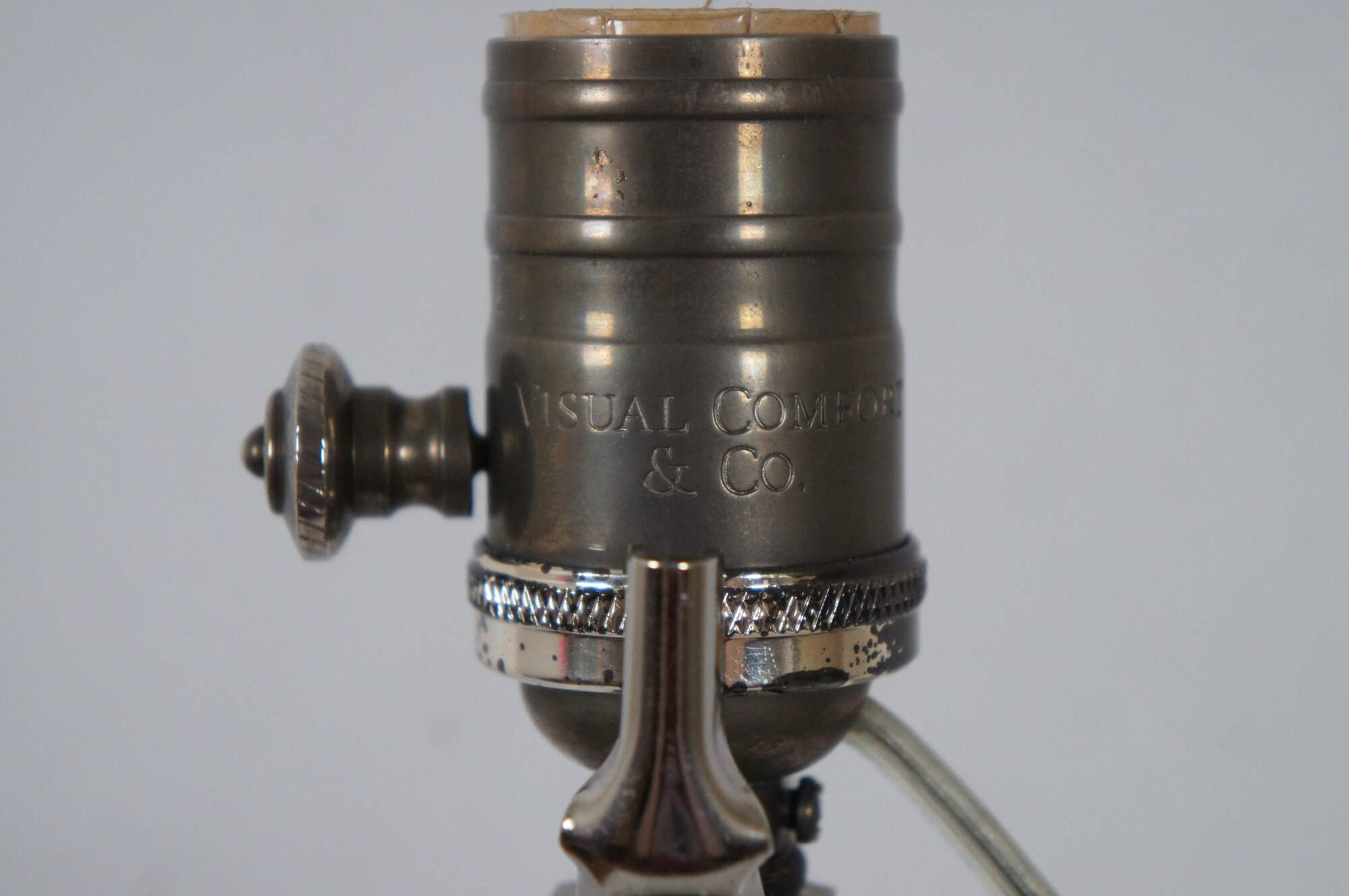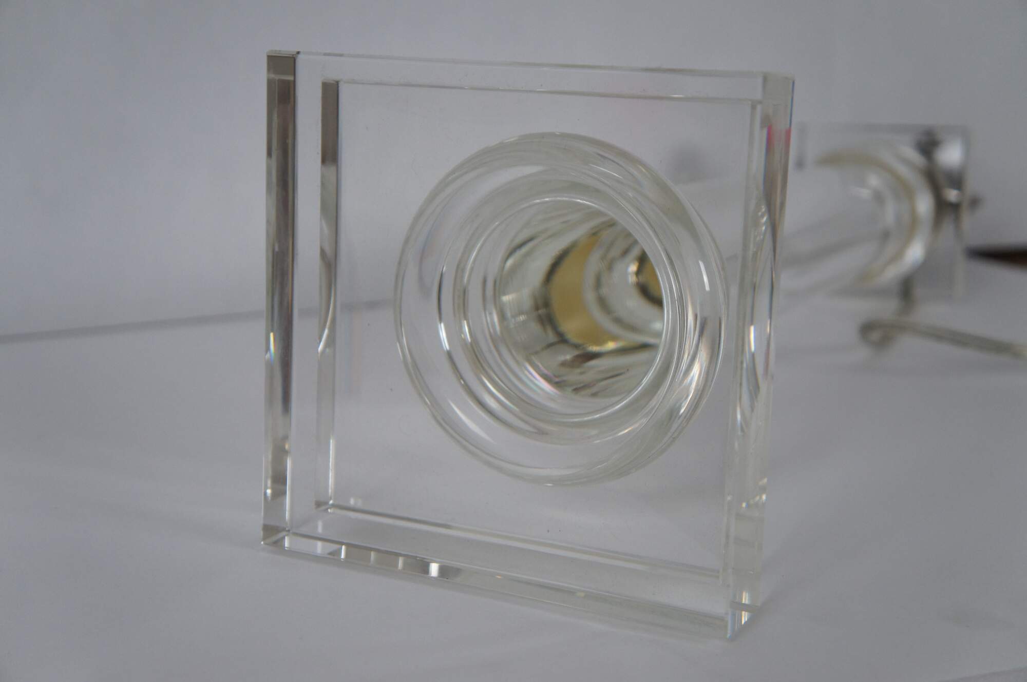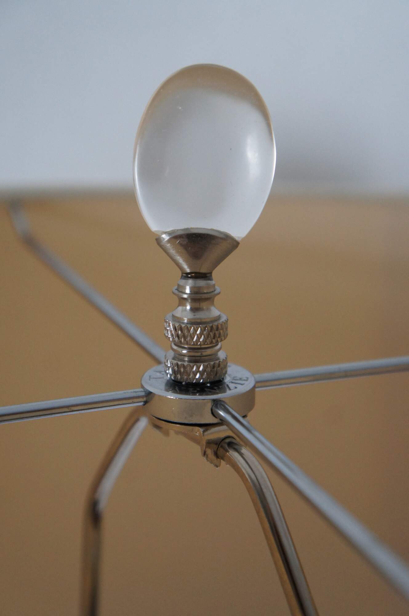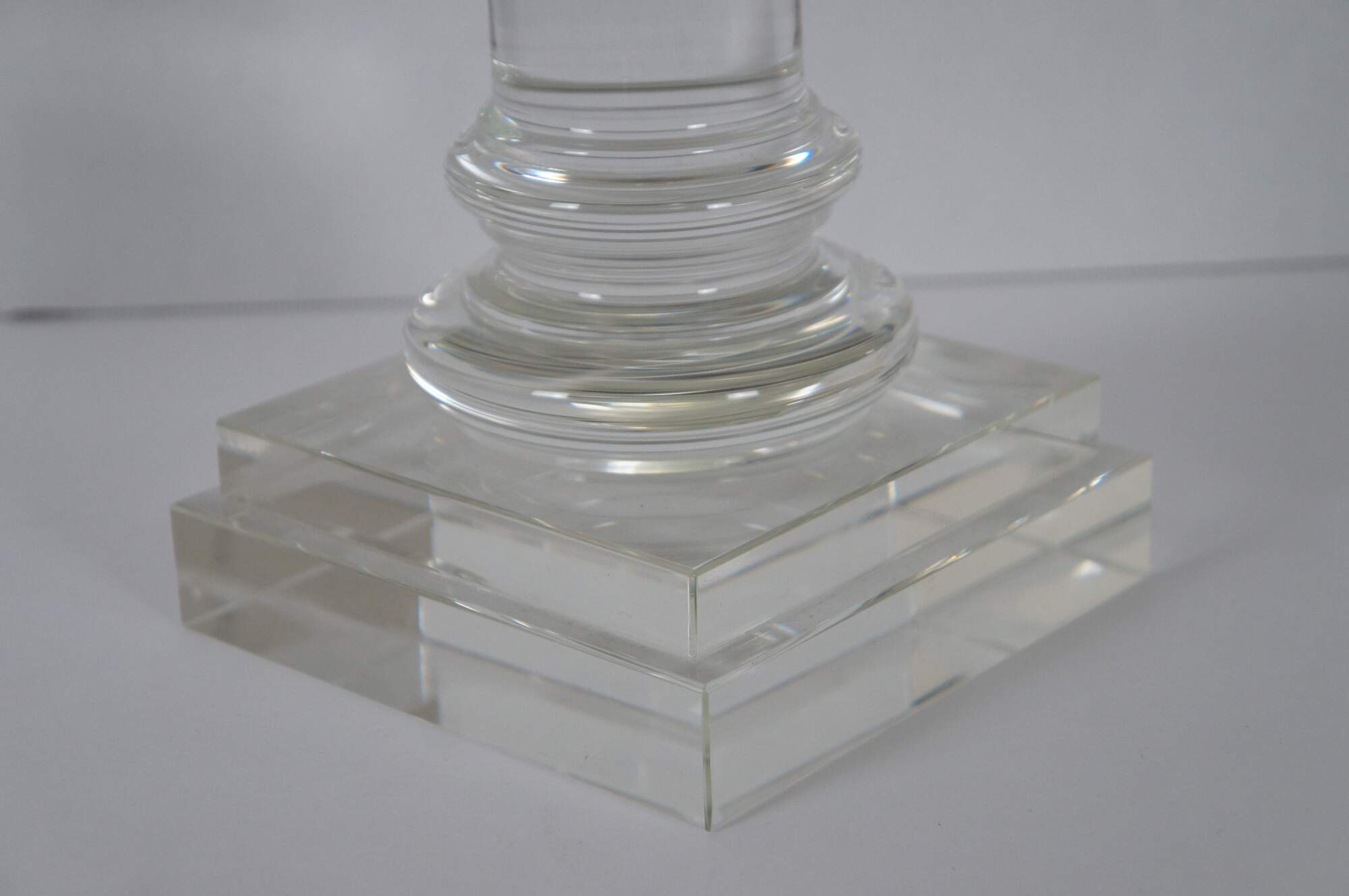 Visual Comfort Neoclassical clear crystal table lamp in the shape of a Corinthian column / pillar. Includes an off-white linen shade by Tanner Kenzie and droplet shaped lucite finial. Circa 2007.