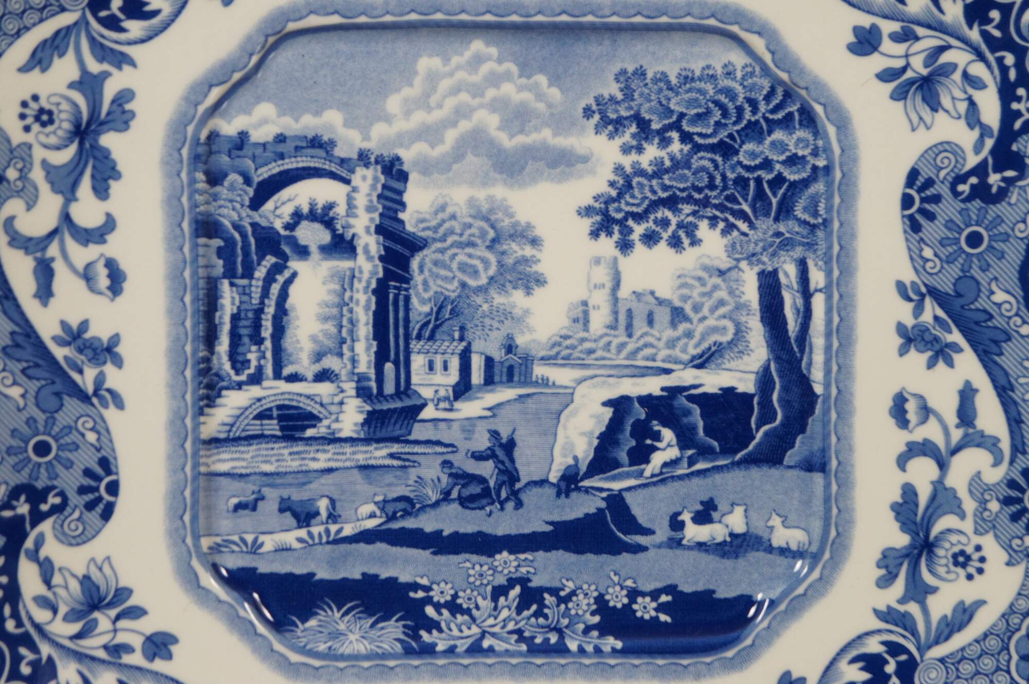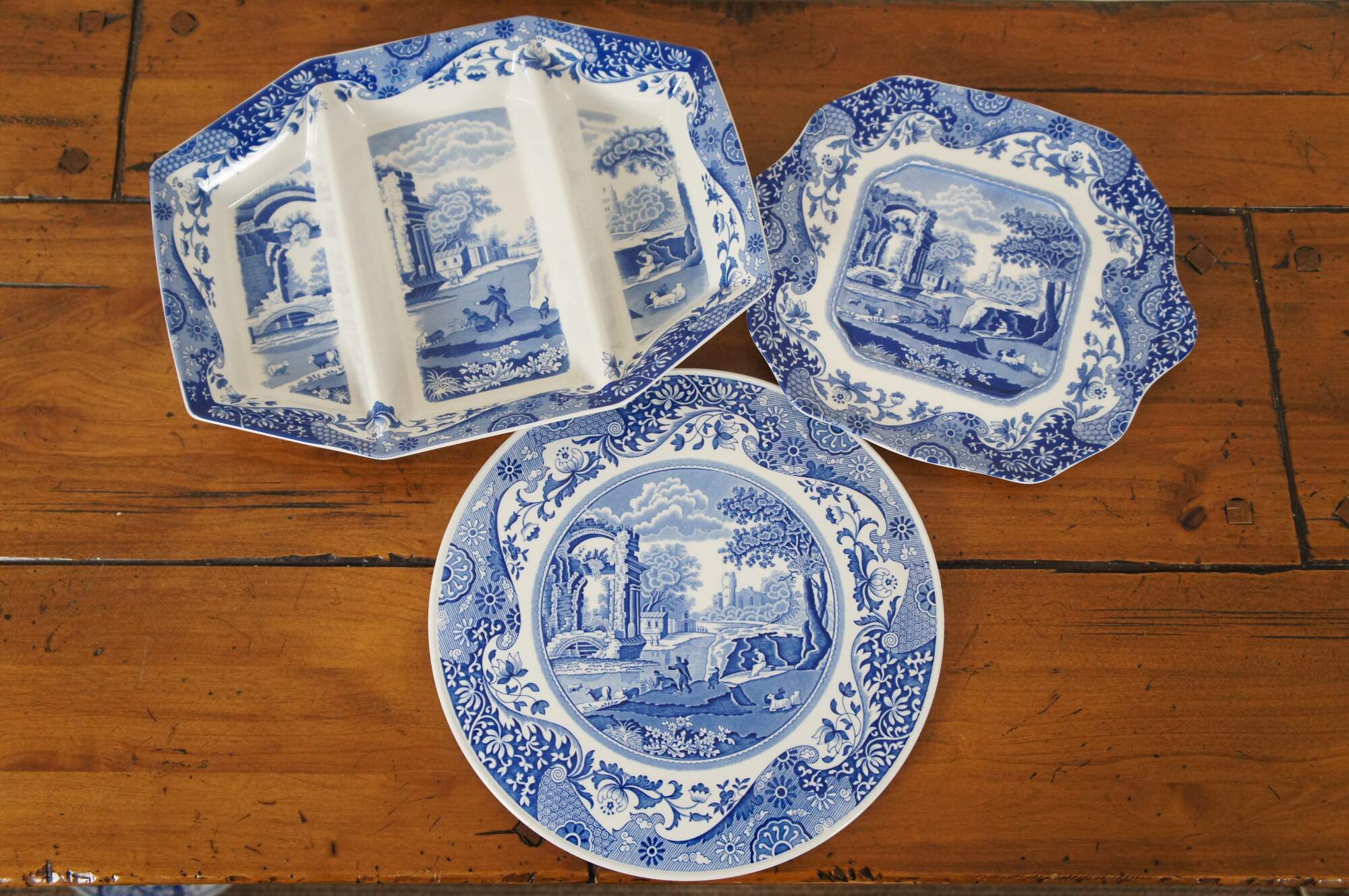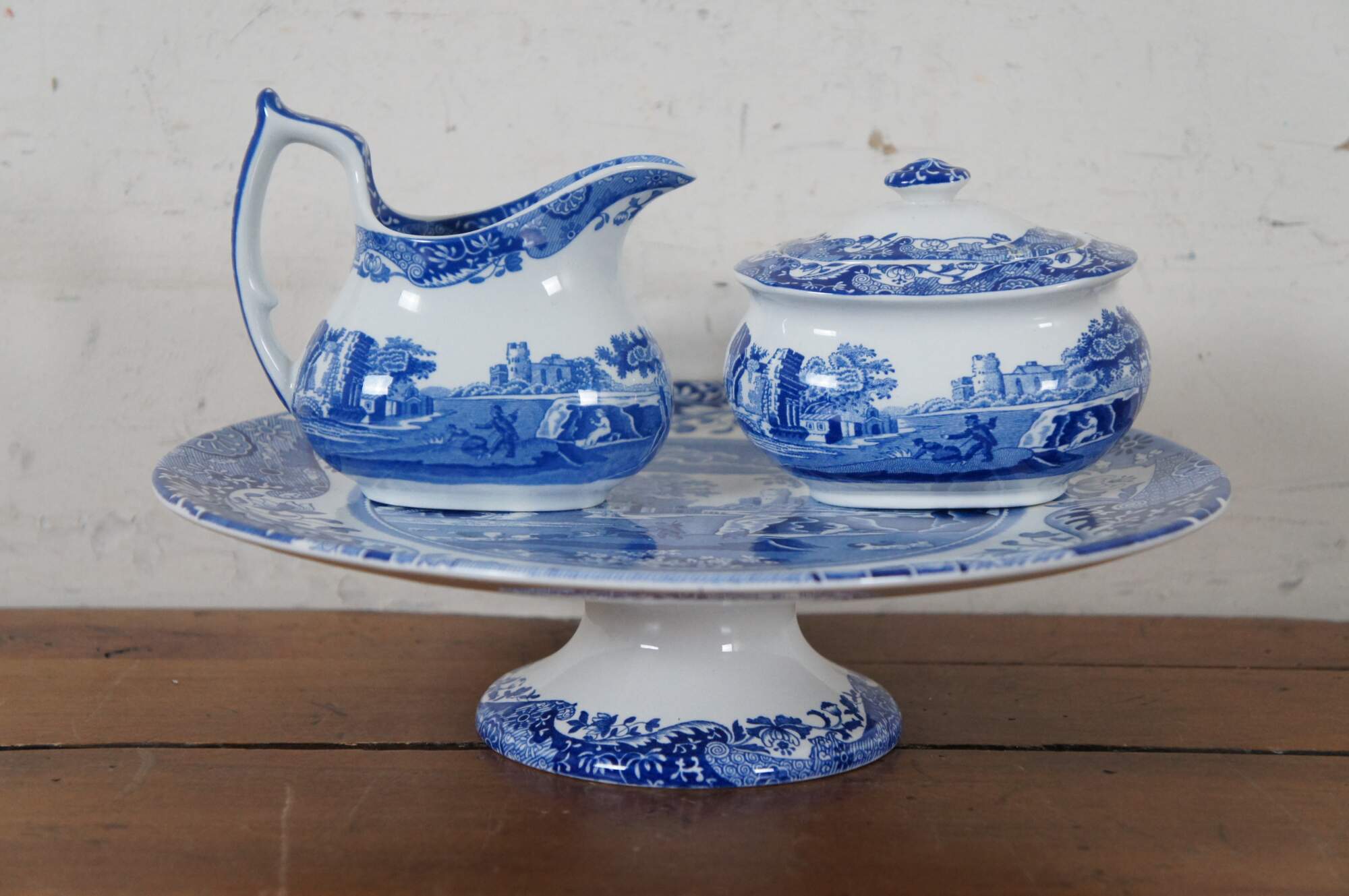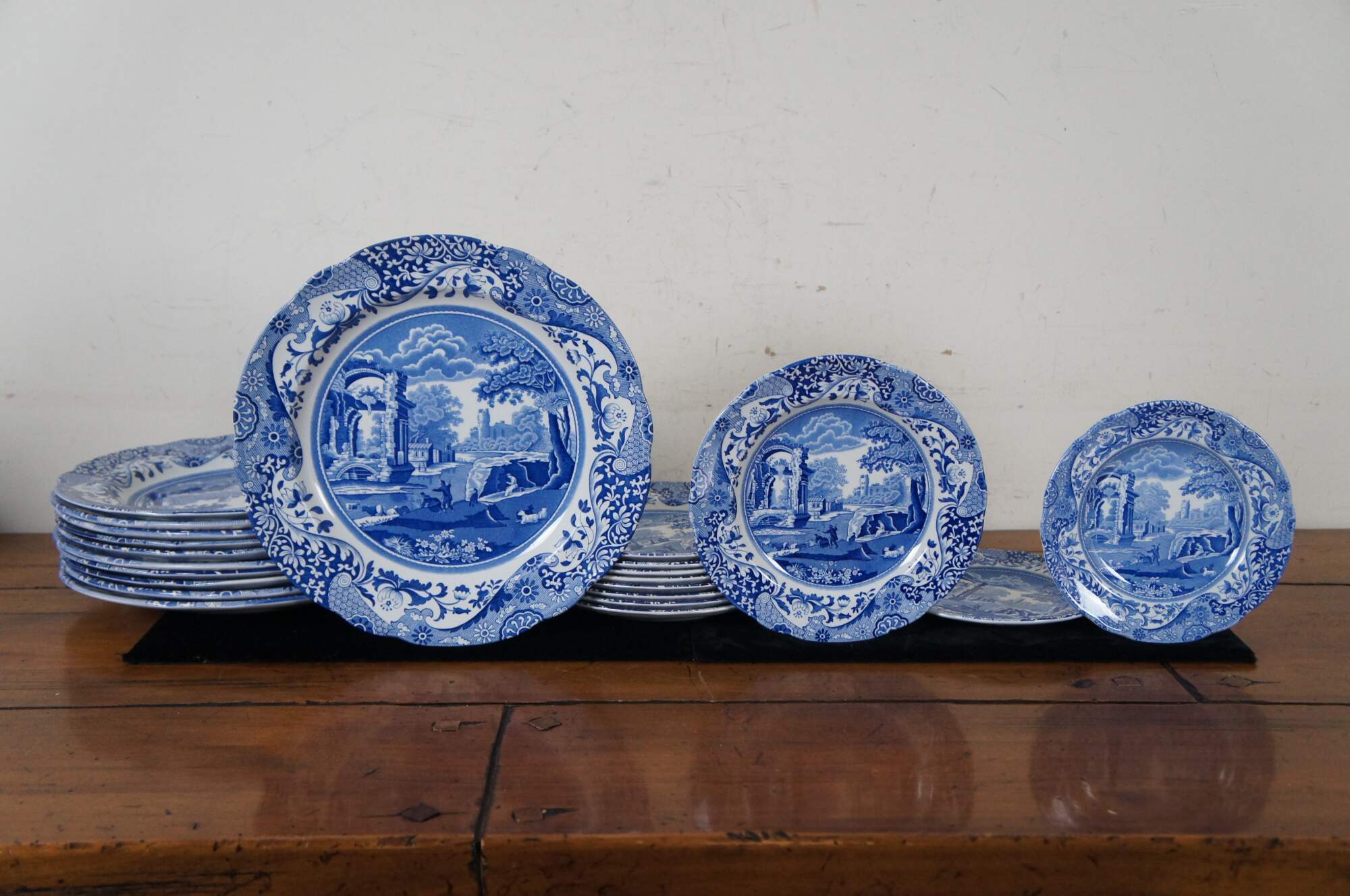 55 piece Spode dinnerware china set in the Blue Italian pattern. “The iconic Blue Italian was launched in 1816 and in production ever since. Featuring a finely detailed 18th century Imari Oriental border encompassing a scene inspired by the Italian countryside, this blue and white collection is a timeless classic.” Made in England. Dishwasher, Freezer and Microwave Safe.