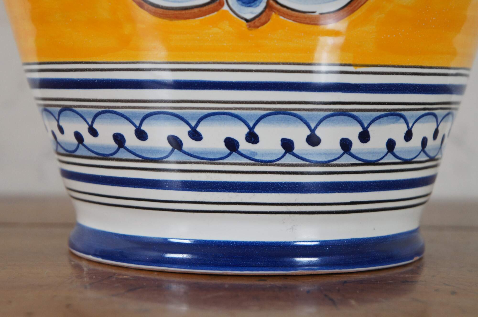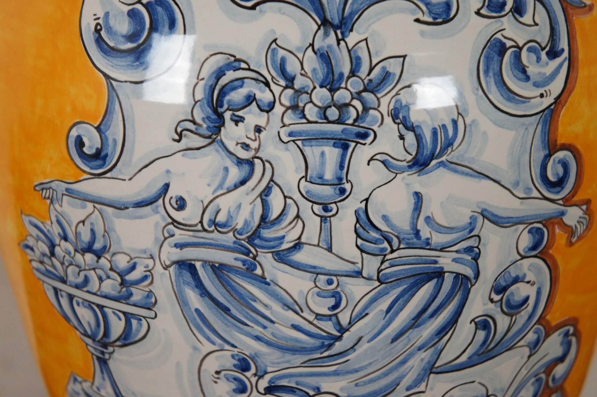 Vintage folk art pottery ginger jar / lidded vase / urn, hand painted in yellow with blue and white borders and a central motif of two dancing female figures dancing around urns of fruit and flowers. Signed “El Carmen – Foilan Talavera Spain” on base.