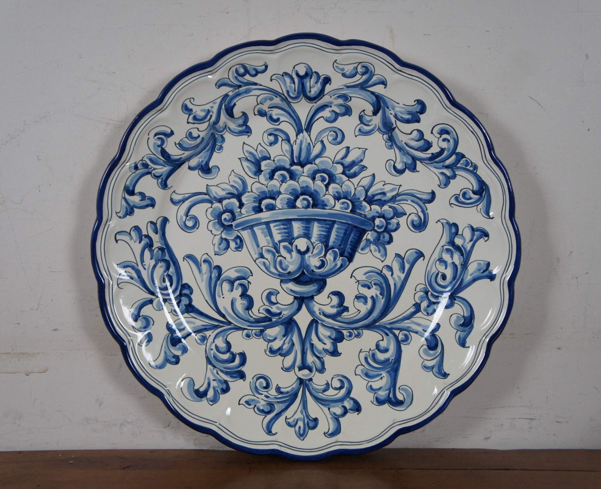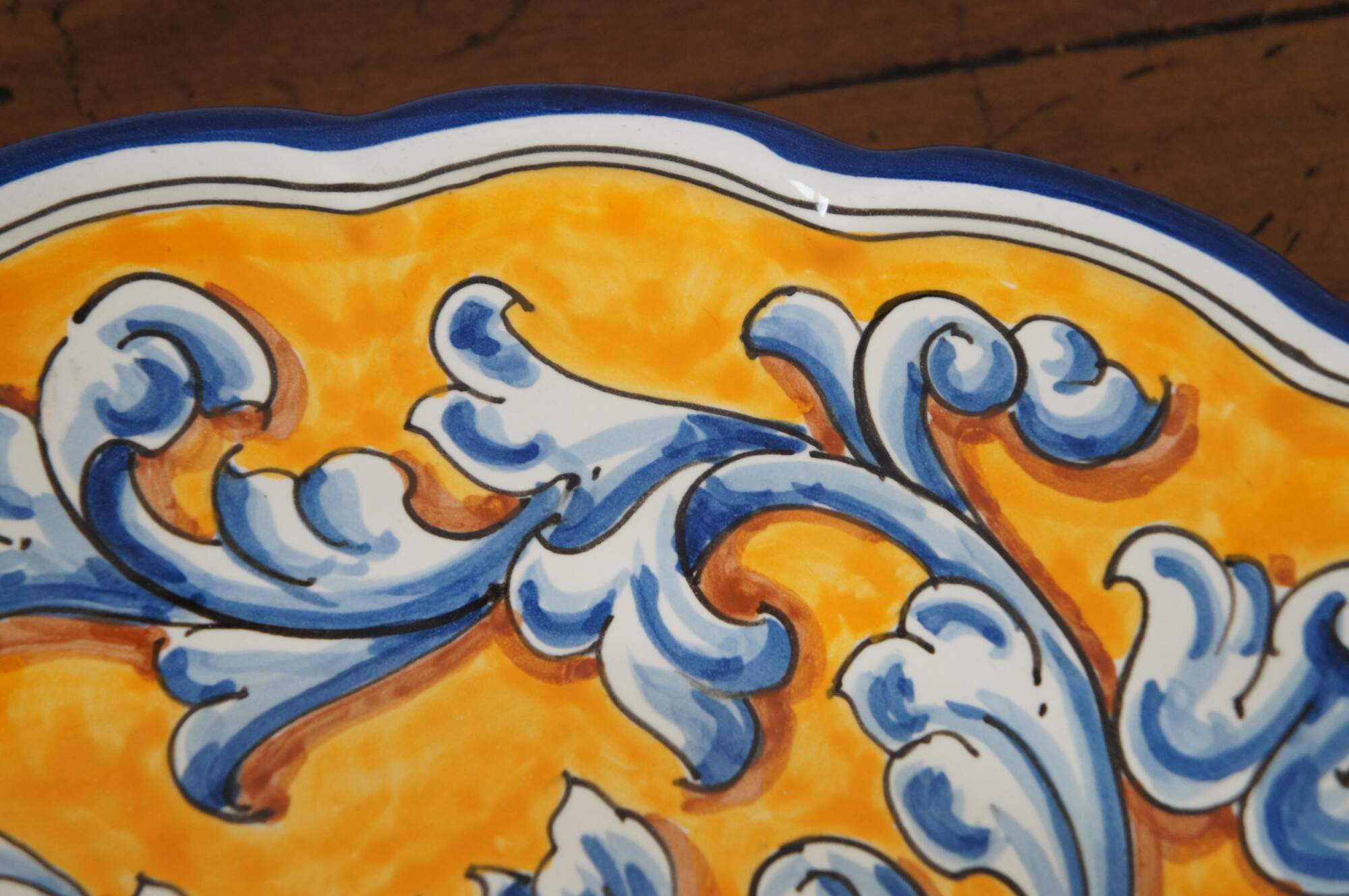 Set of 5 vintage Mexican / Spanish folk art pottery platters / chargers by J.A. Froilan. All platters are the same size, round with lightly scalloped edges and drilled holes in the back edge for wall hanging / display. All feature slightly differeing designs in a harmonious motif of vases / baskets filled with flowers / fruit and surrounded with swirling leaves. Two are in simple blue and white, and three feature yellow-orange backgrounds.