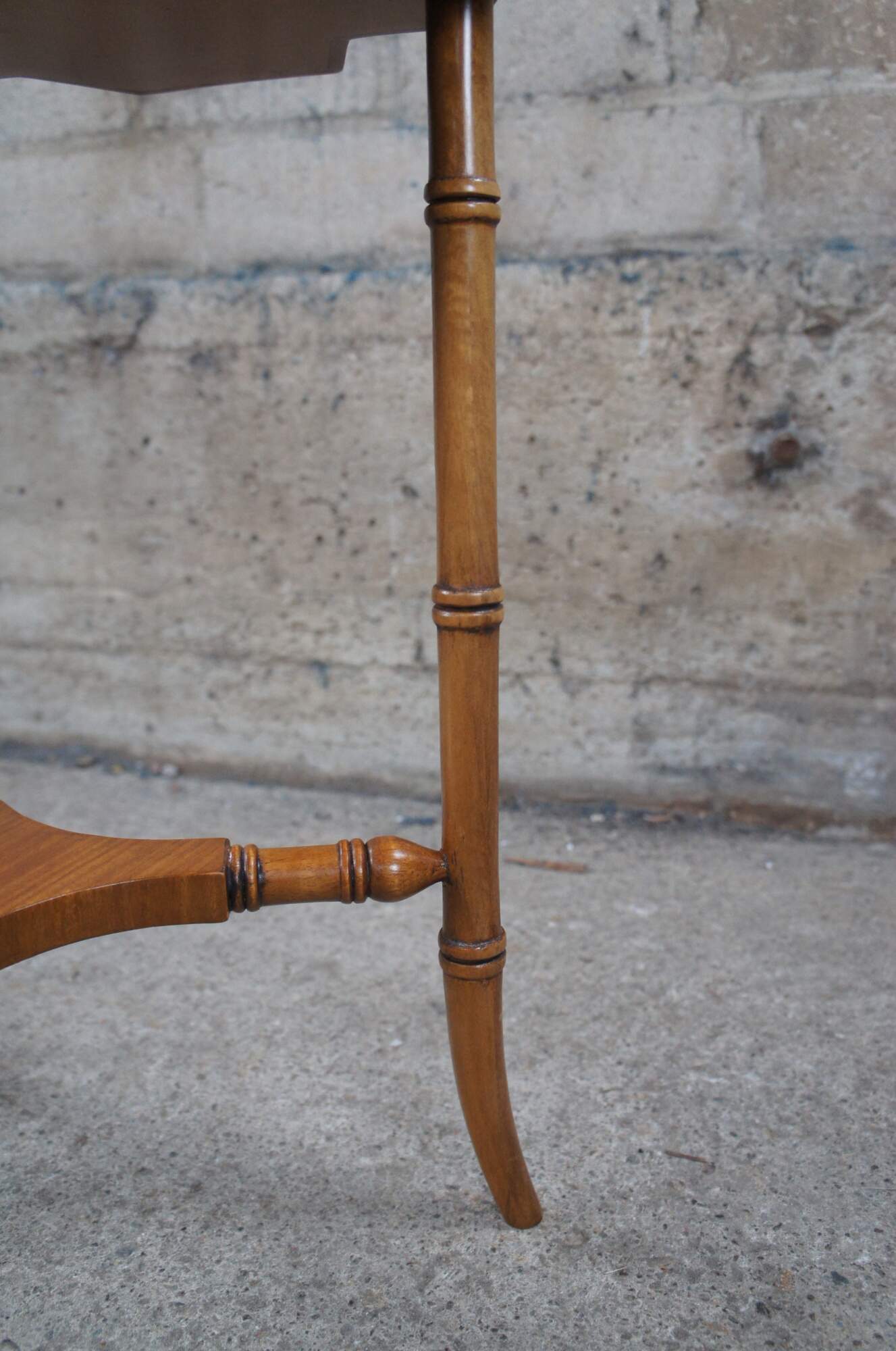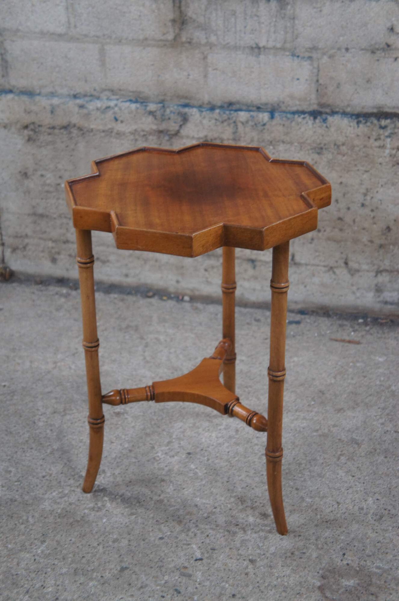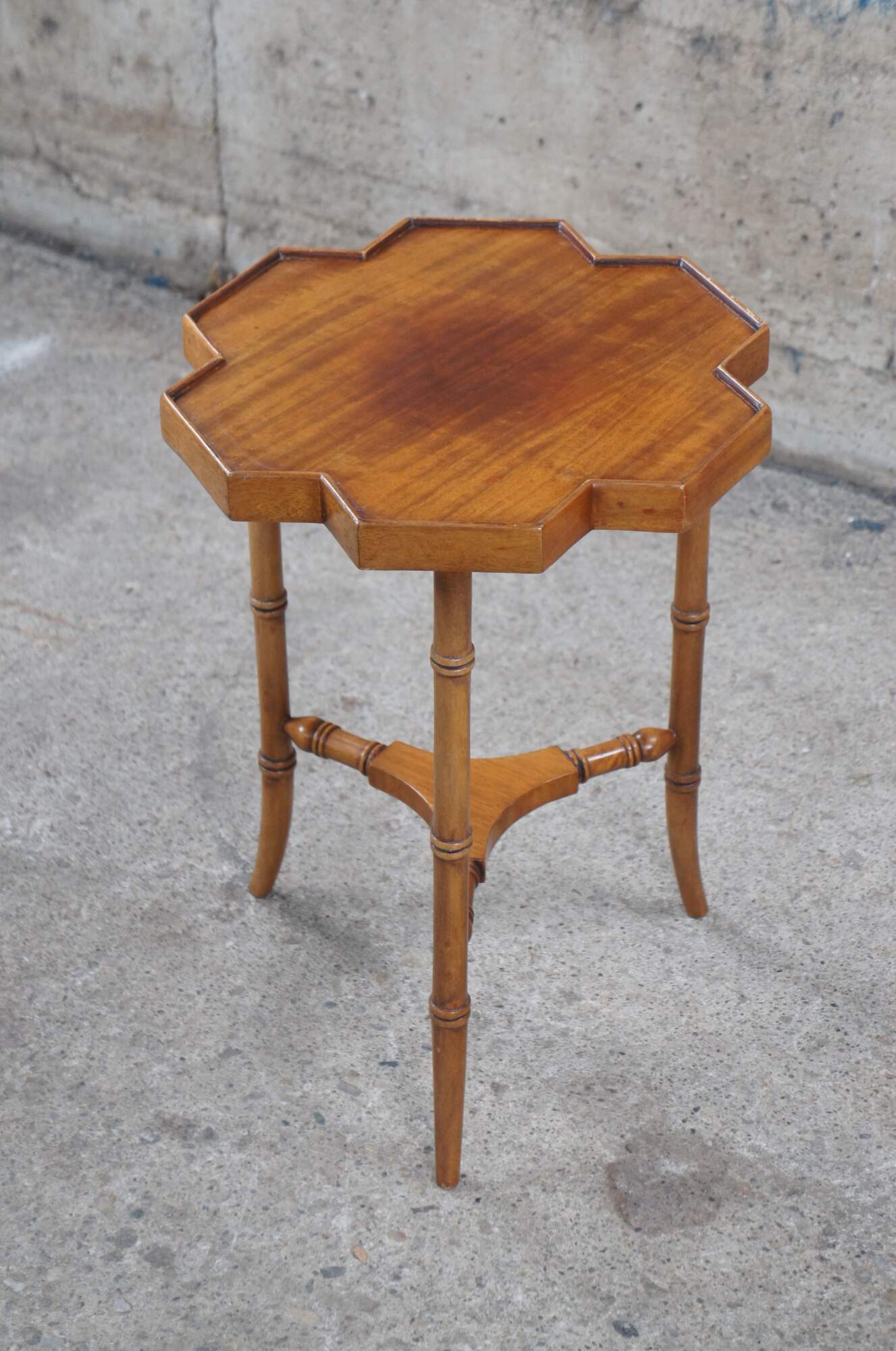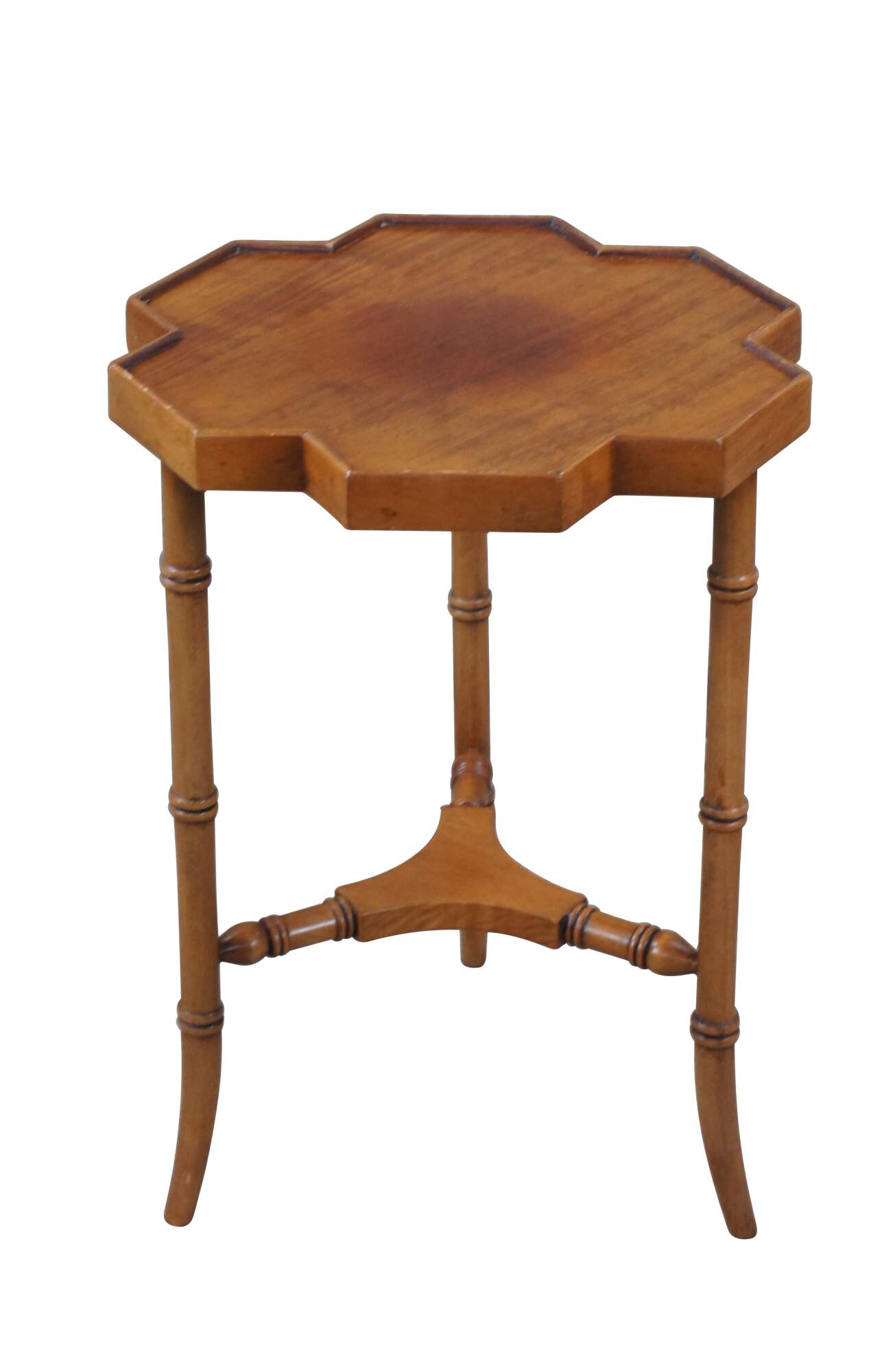 Handmade martini side table by Maitland Smith Ltd, circa 1990s. Features an inset honeycomb top over faux bamboo legs connected by a tripod stretcher. Made from solid mahogany.