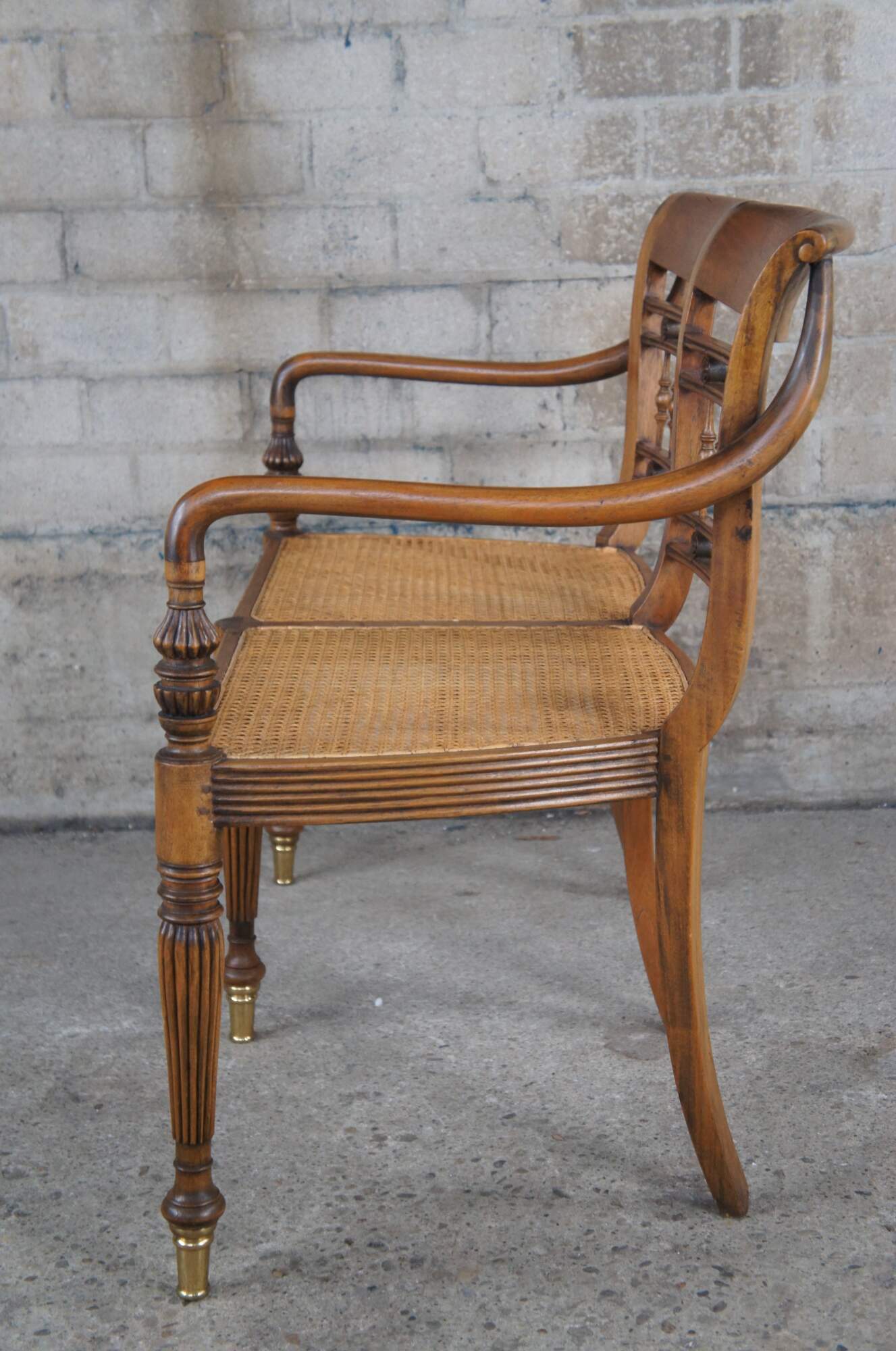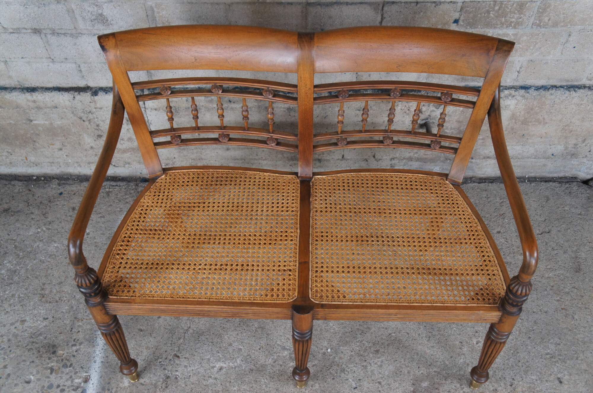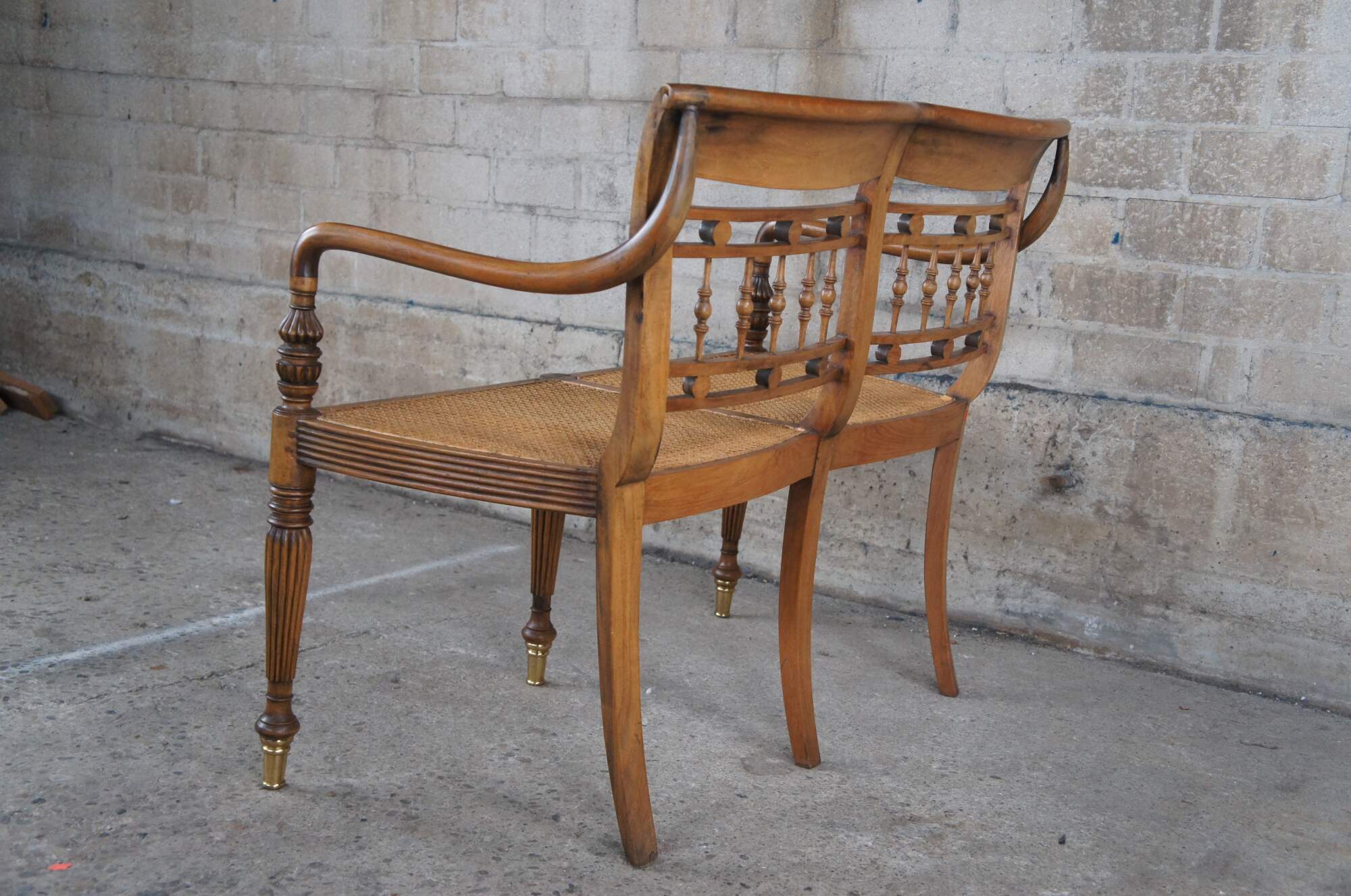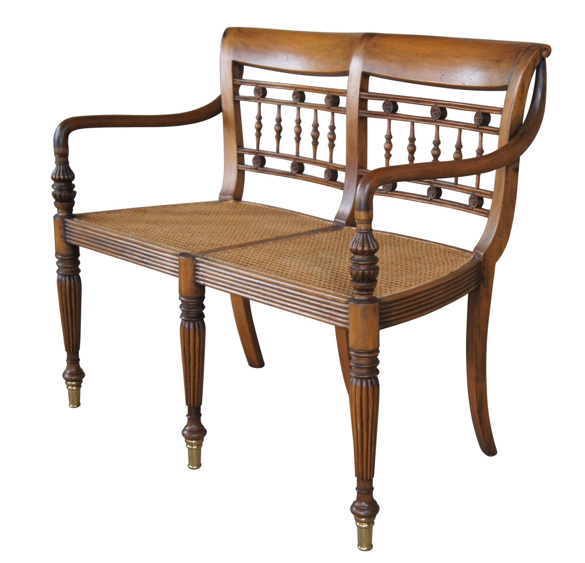 Vintage Pierce Martin British Colonial Regency Plantation bench. Made of mahogany featuring caned seat with piereced spindel and floral medallion back support, sloped arms, caned seats, and fluted tapered legs with brass capped feet.