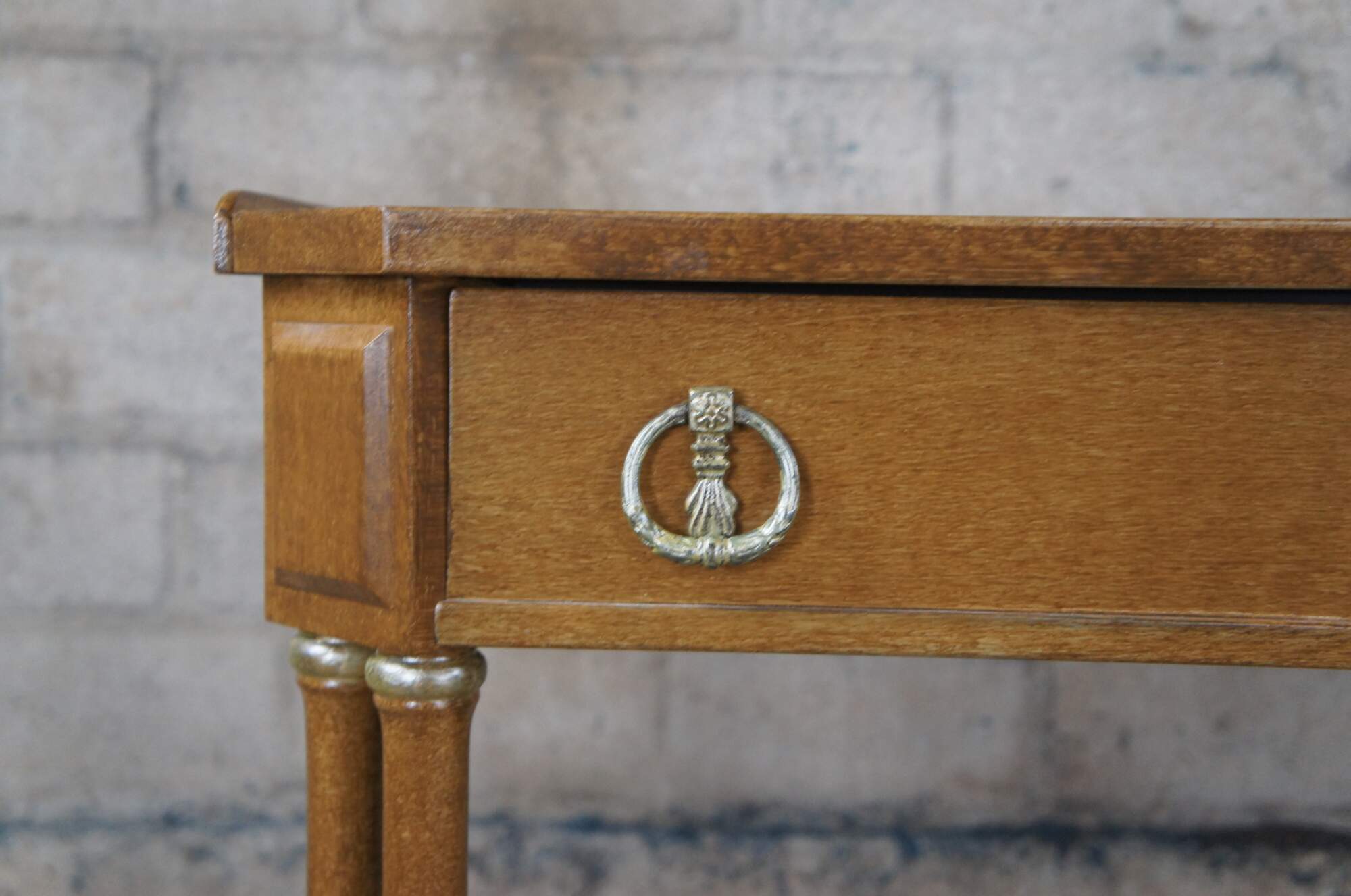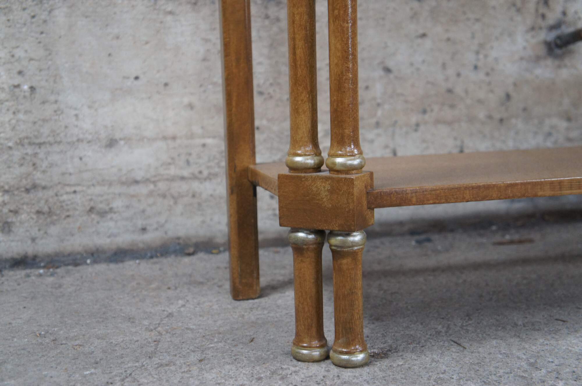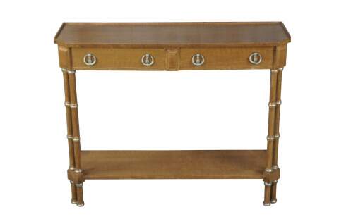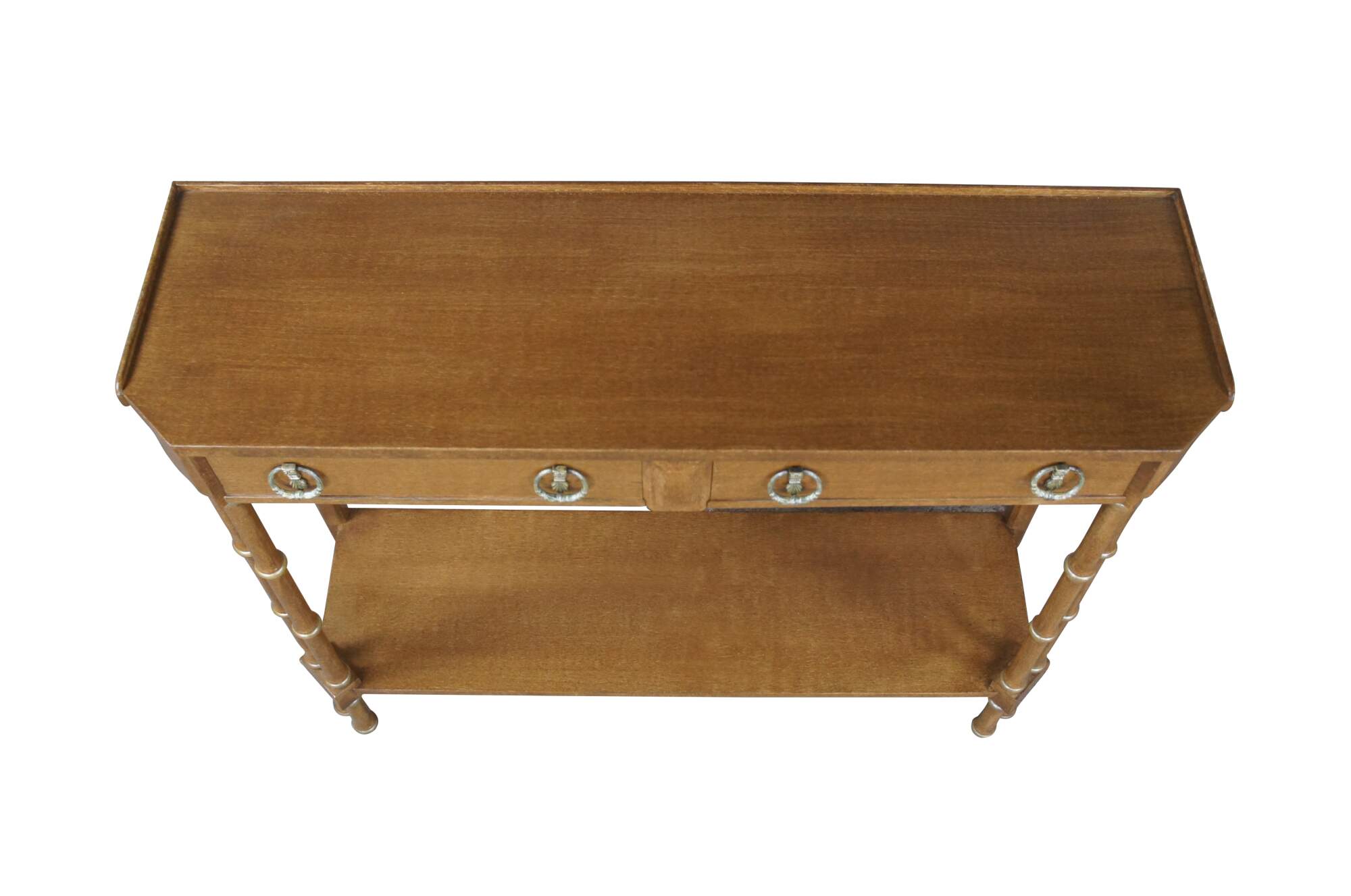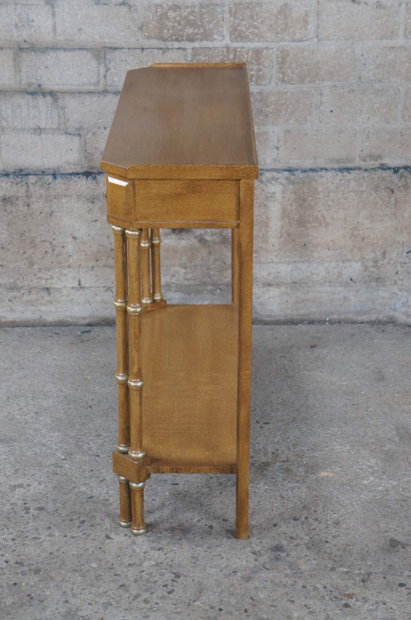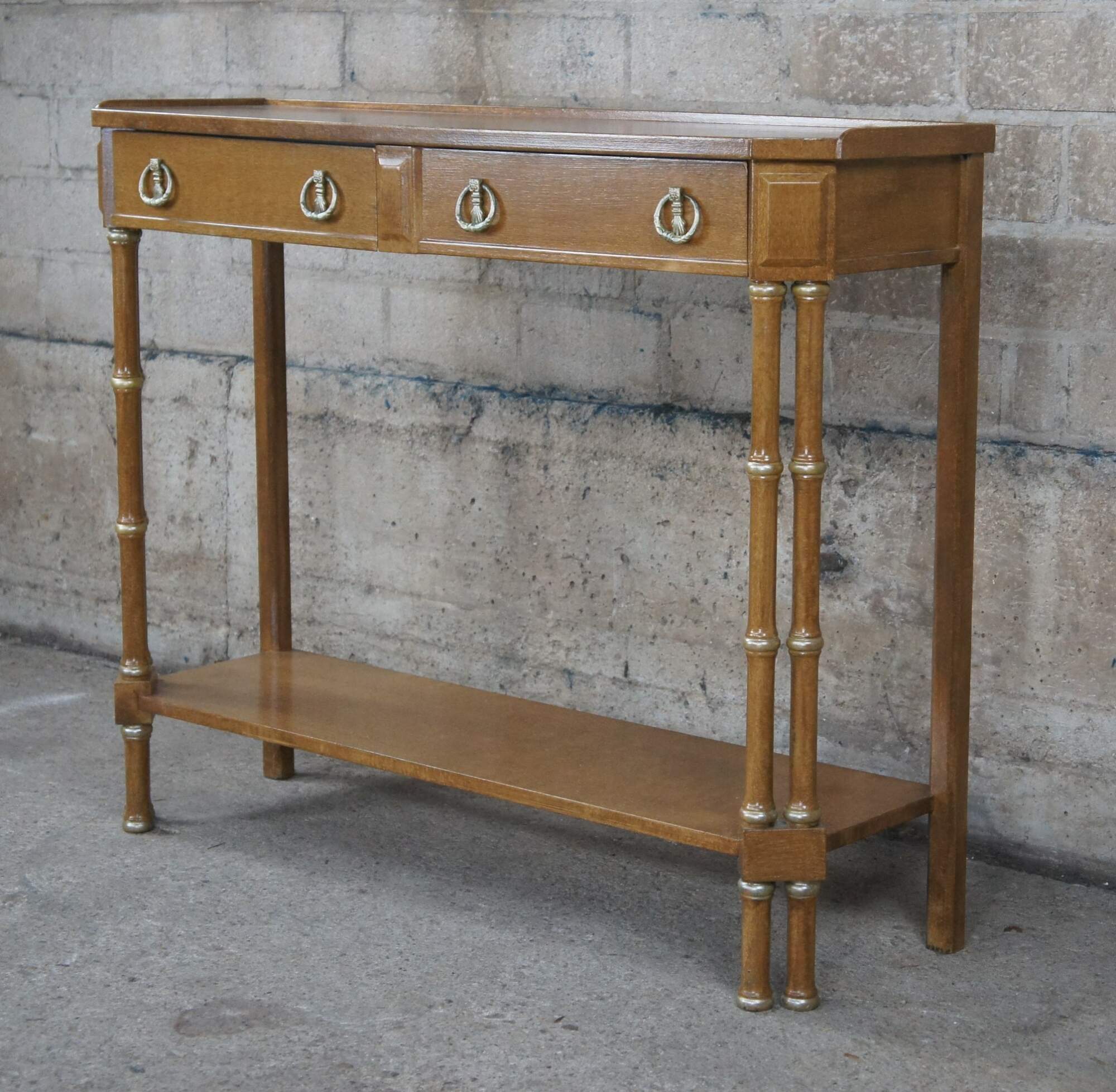 Vintage Campaign style tiered console or entry table featuring a slender profile with upper gallery over two drawers with Neoclassical brass hardware, supported by faux bamboo legs.
