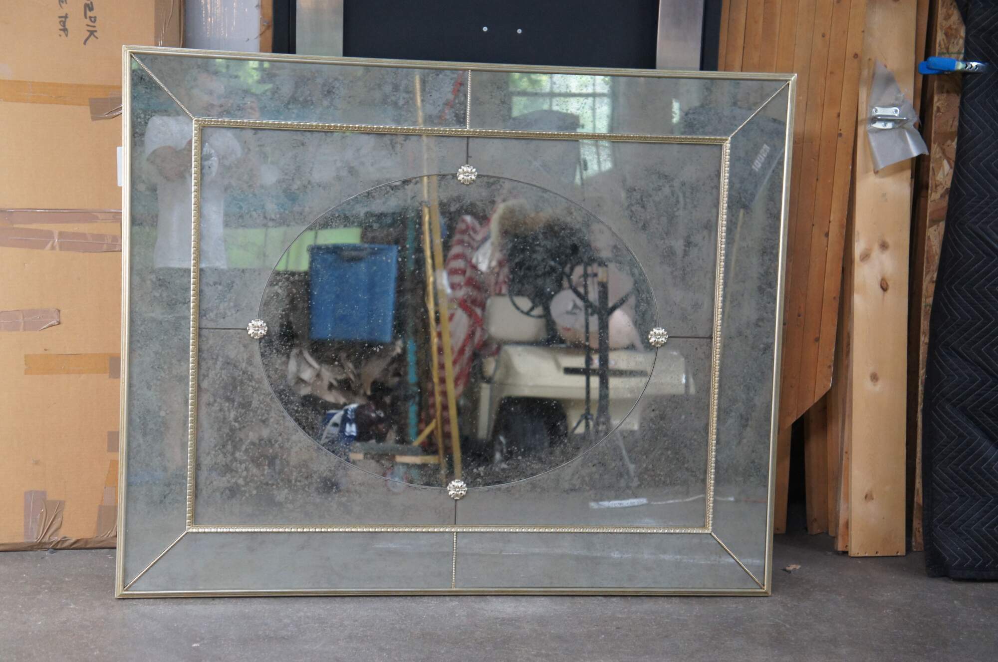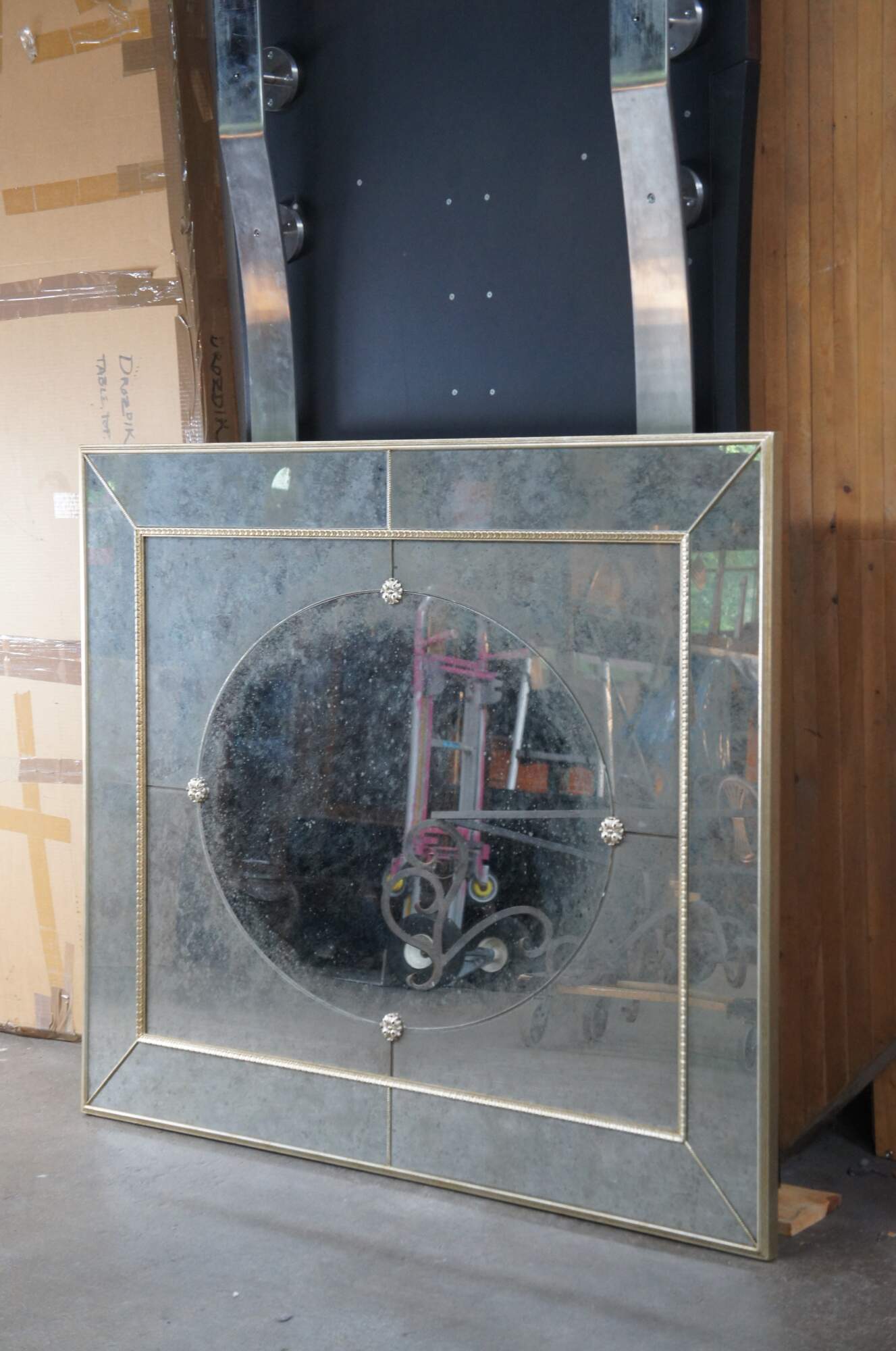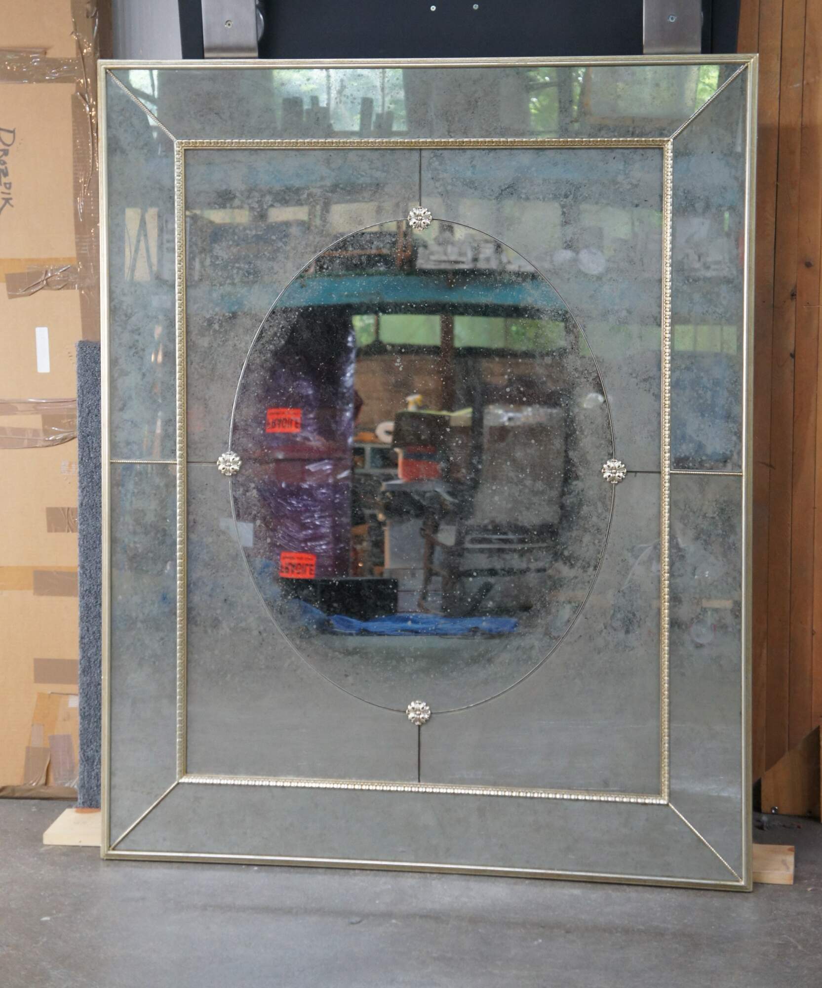 Vintage wall, hall, vanity or overmantel mirror featuring Venetian styling with antiqued hazy glass and silver medallion accents. Made in Canada.