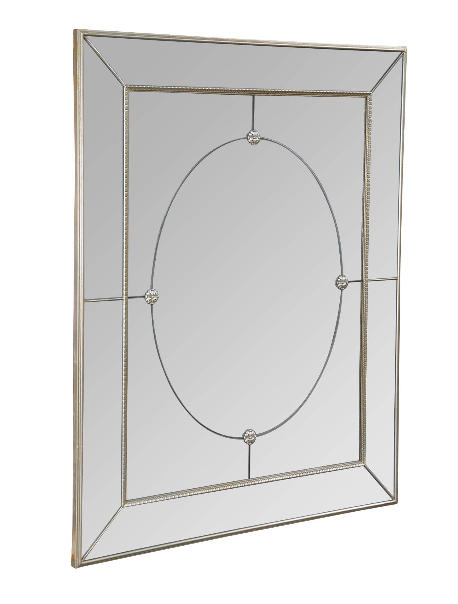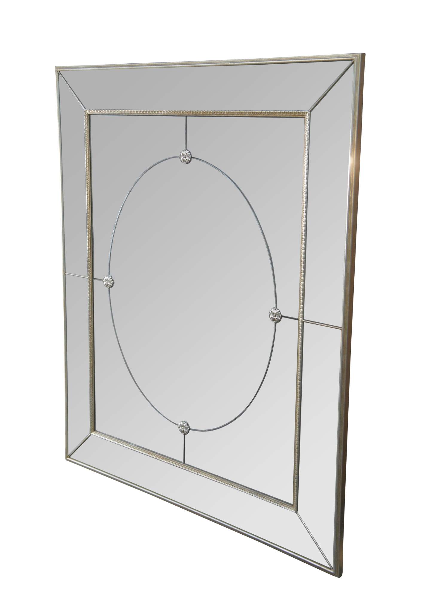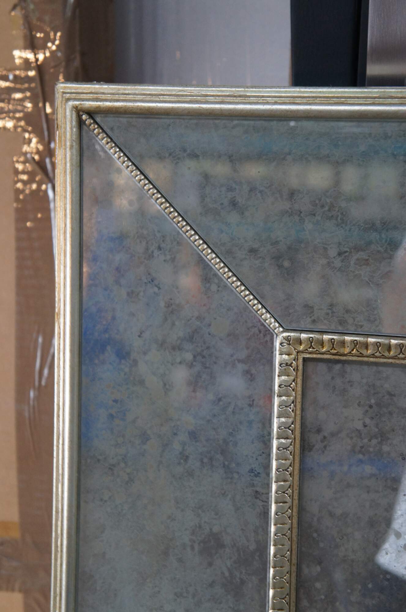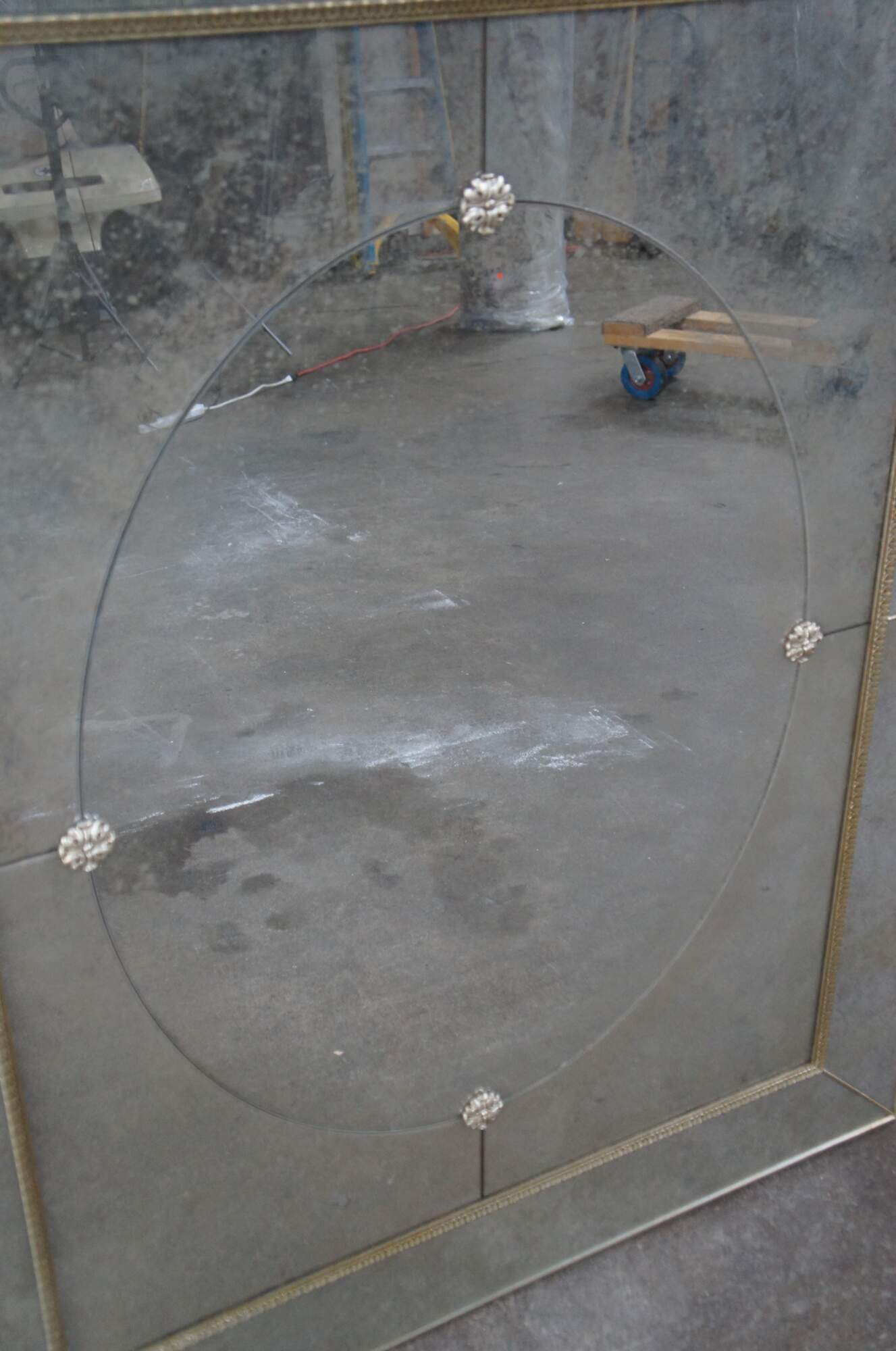 Vintage wall, hall, vanity or overmantel mirror featuring Venetian styling with antiqued hazy glass and silver medallion accents. Made in Canada.
