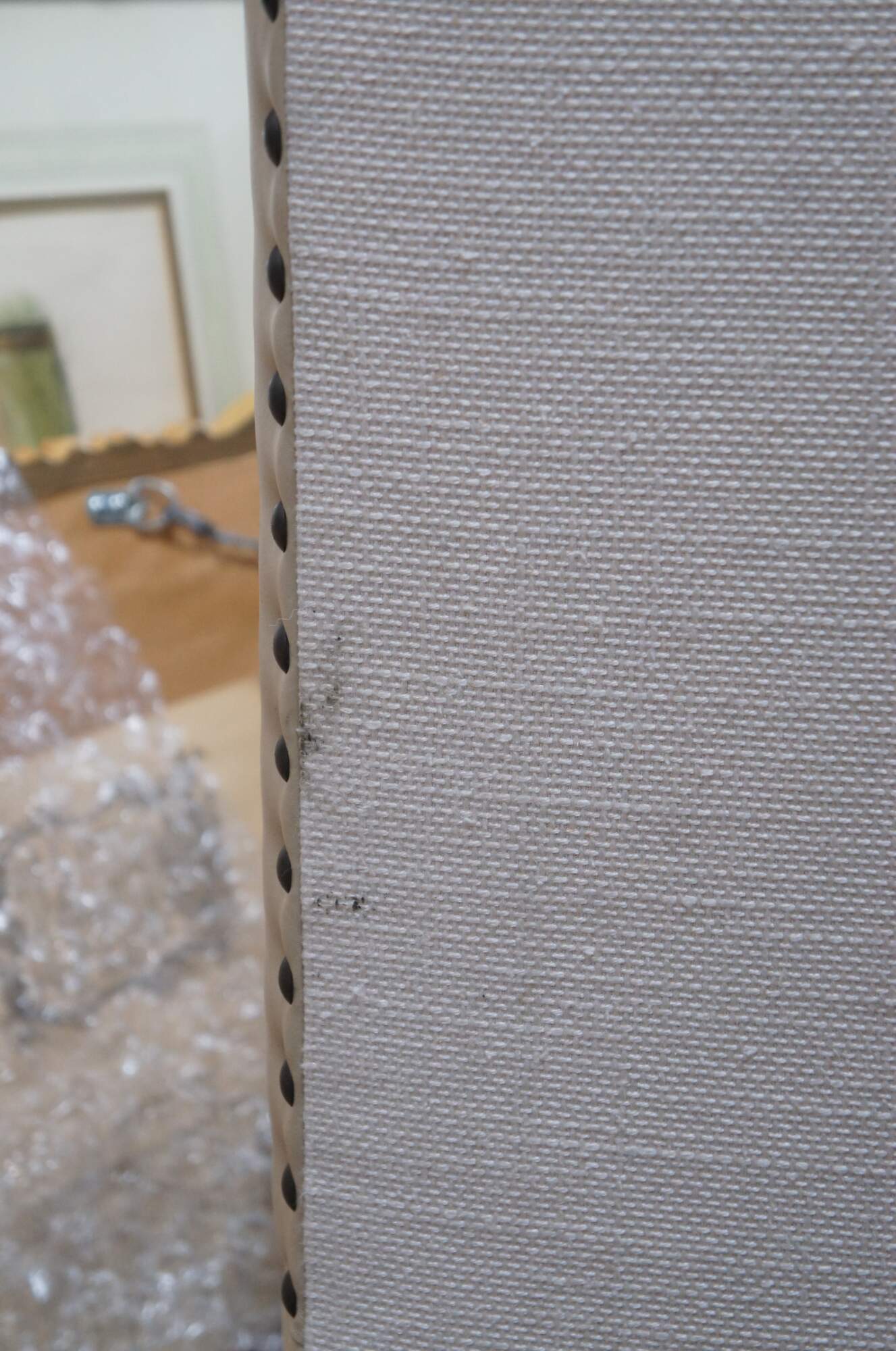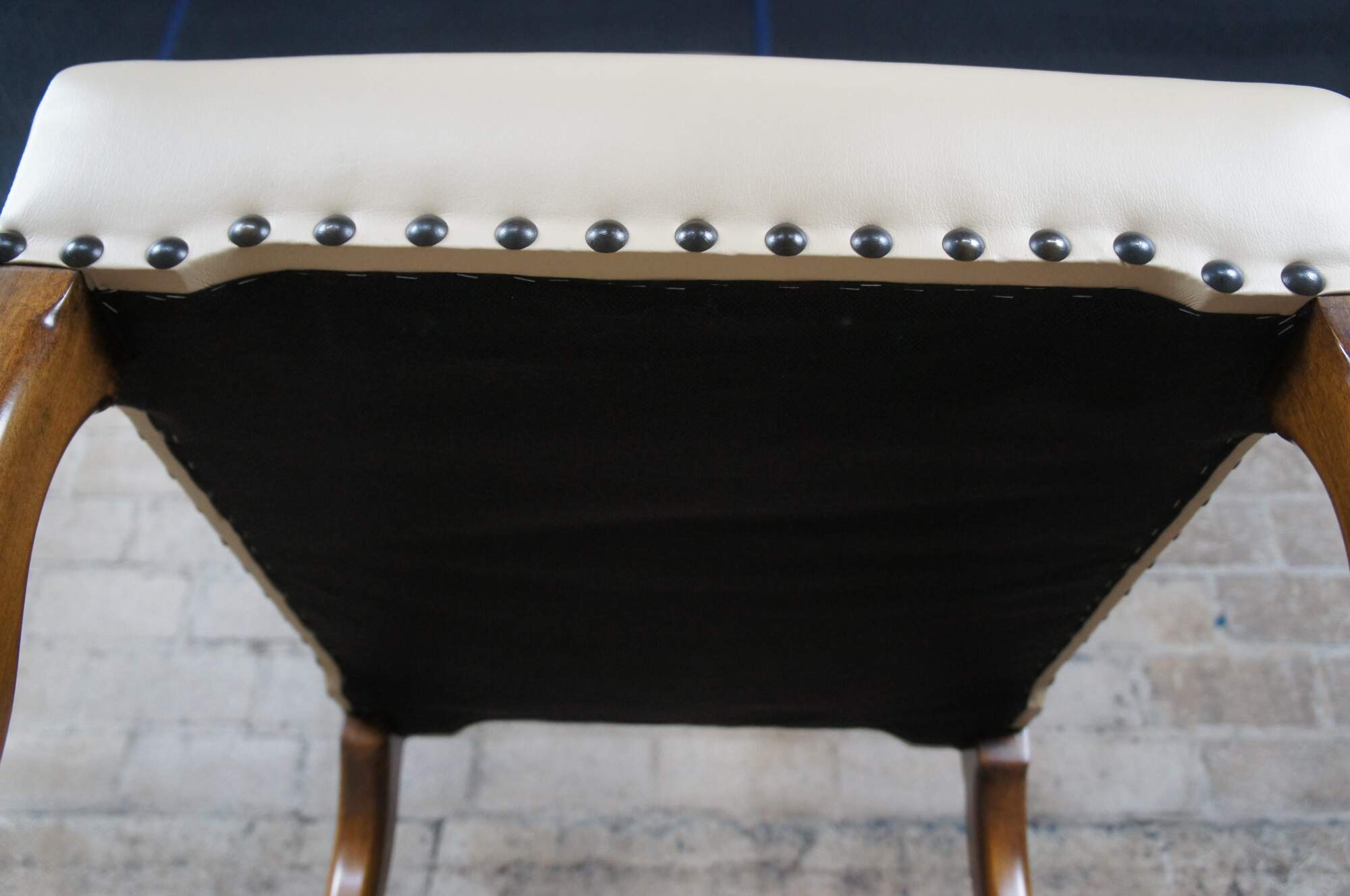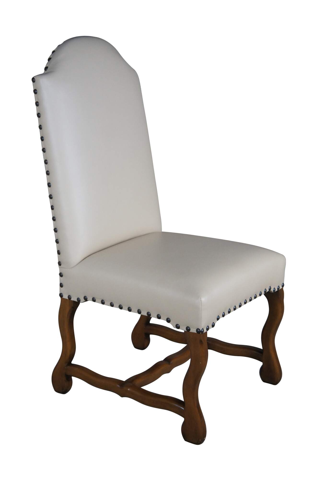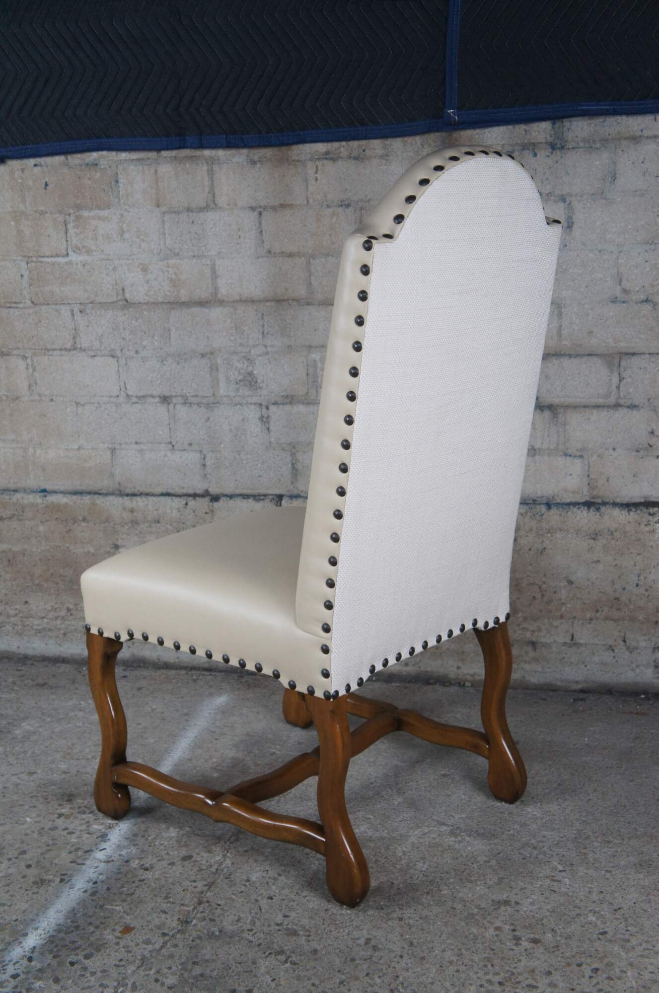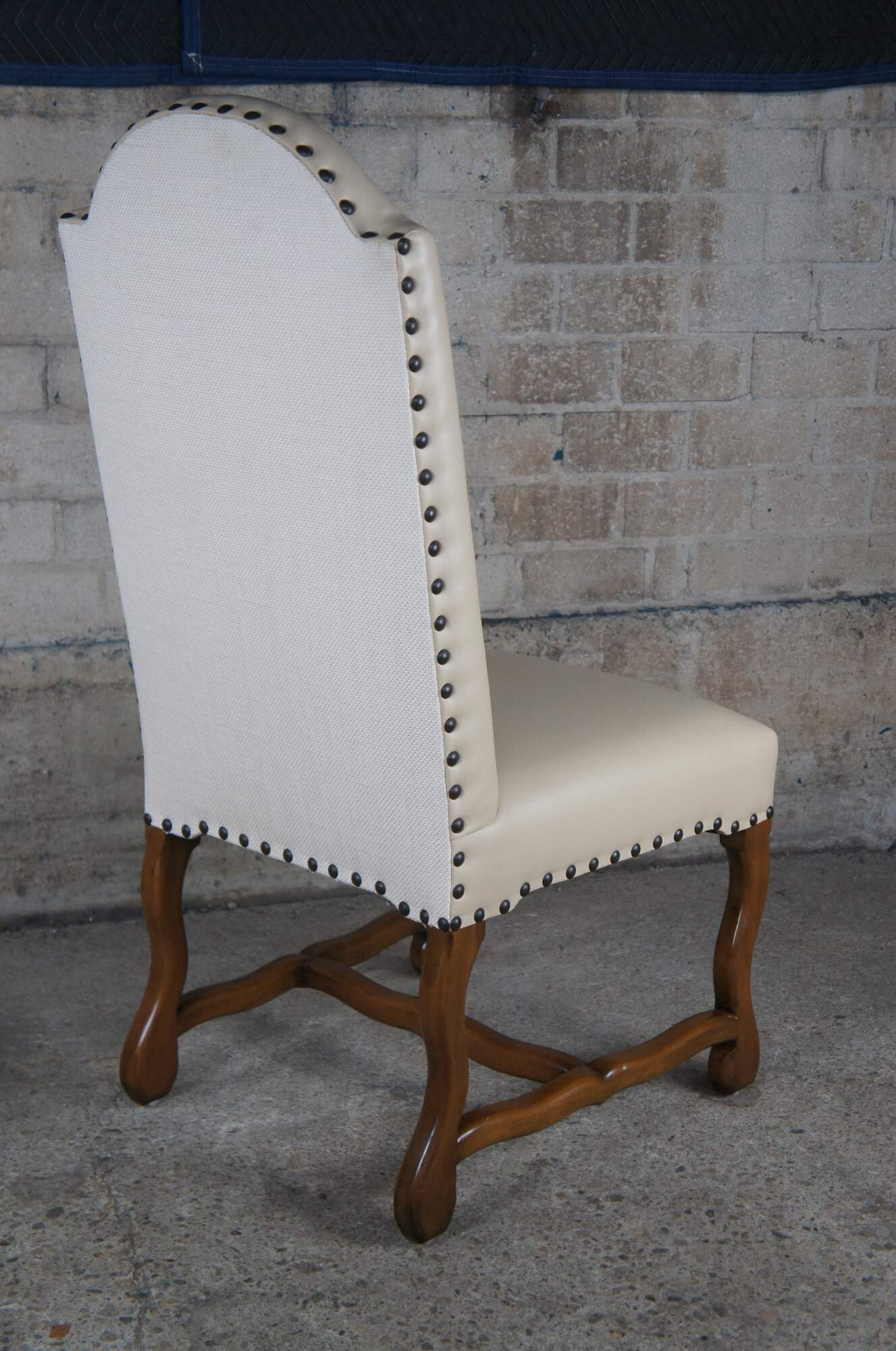 Six Spanish Revival Modern dining chairs featuring domed top with leather seat accented with nailhead trim and linen back, supported by serpentine legs connected by H stretcher.
