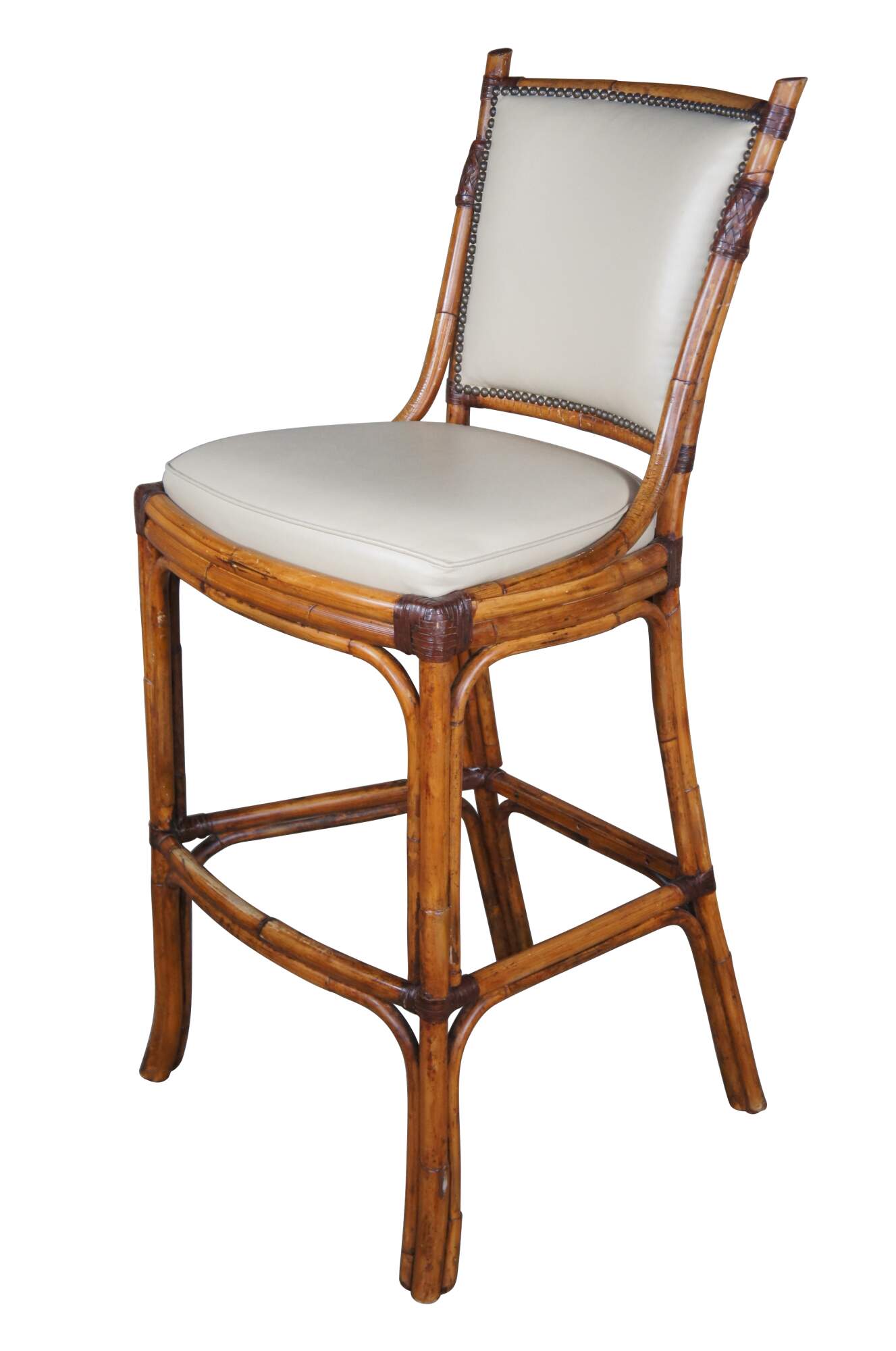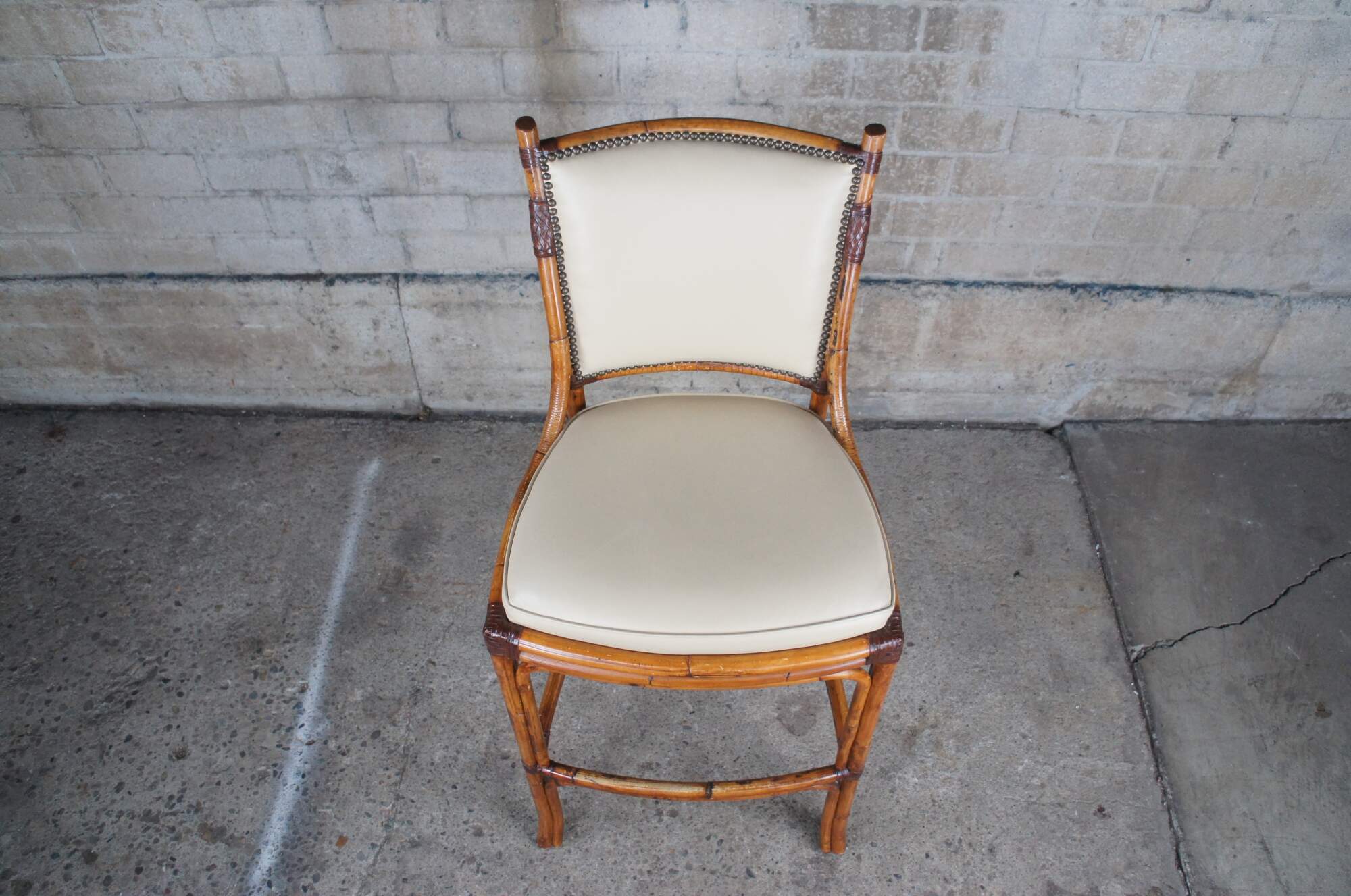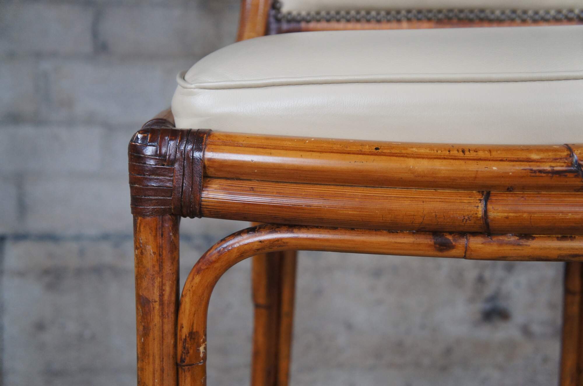 Vintage set of three Pierce Martin barstools featuring faux bamboo and rattan frame with foot rest, leather seat, nailhead trim and linen back.