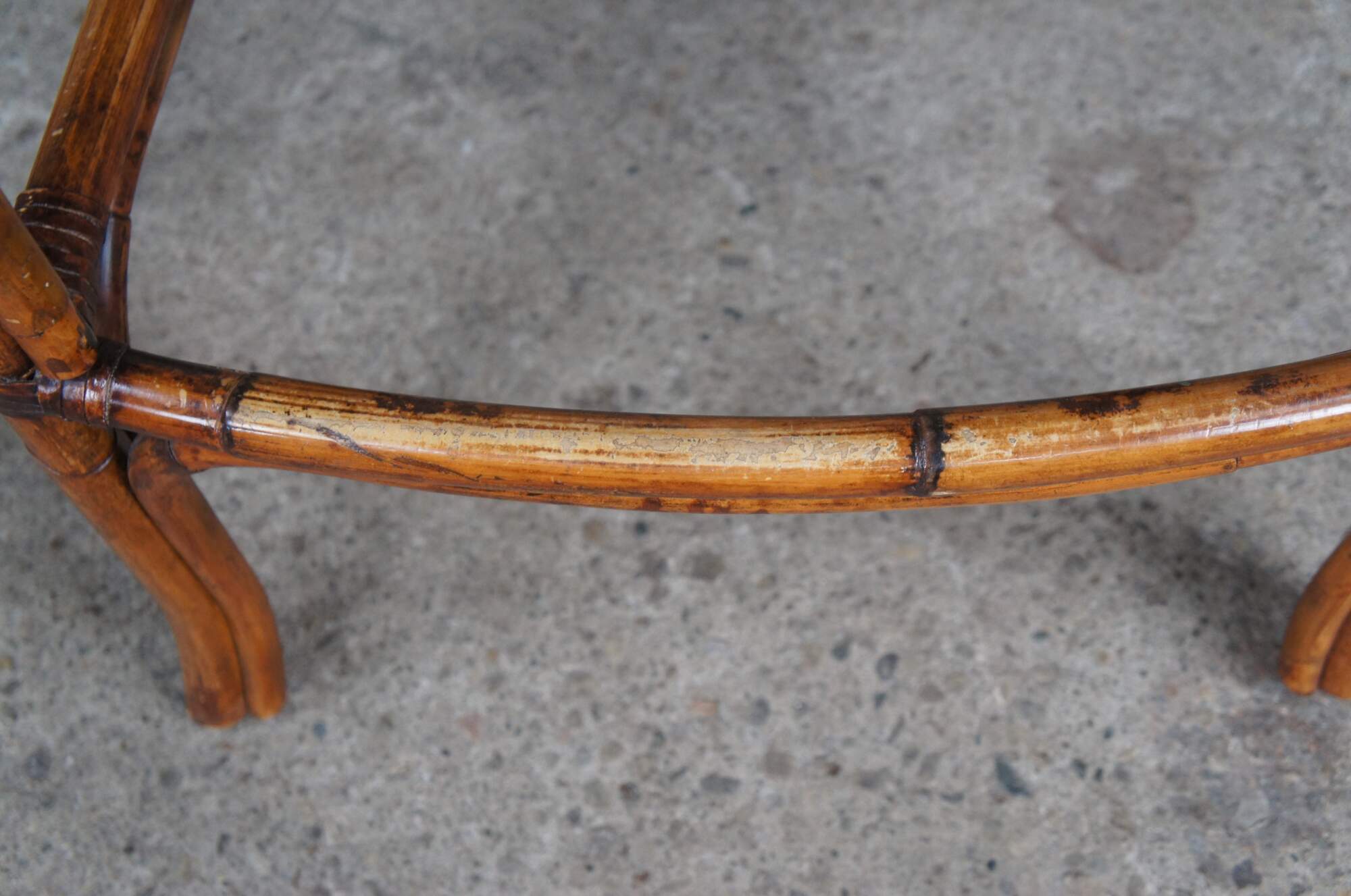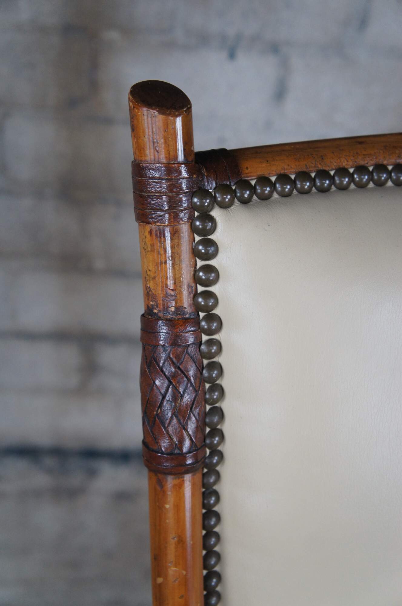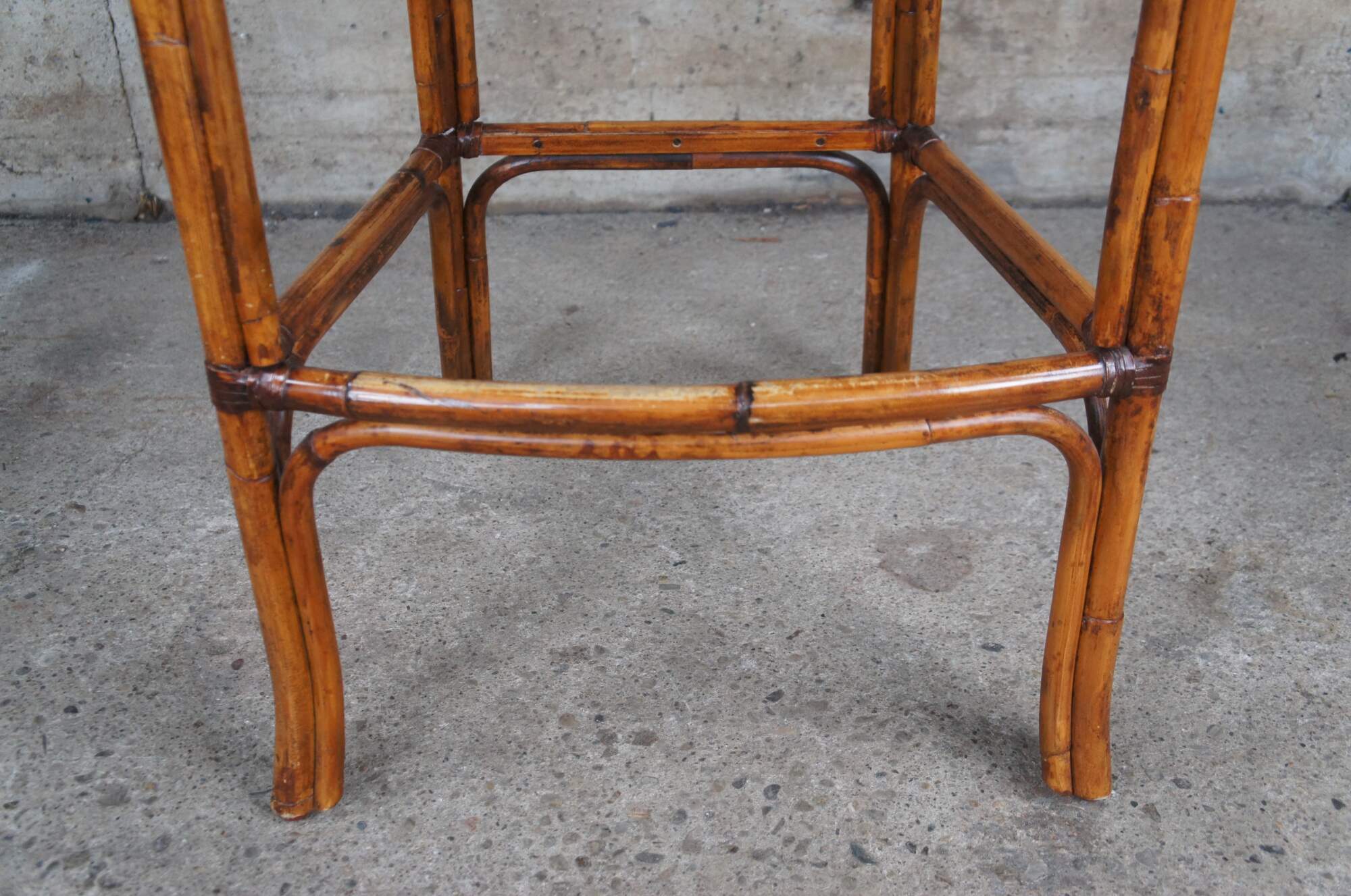 Vintage set of three Pierce Martin barstools featuring faux bamboo and rattan frame with foot rest, leather seat, nailhead trim and linen back.