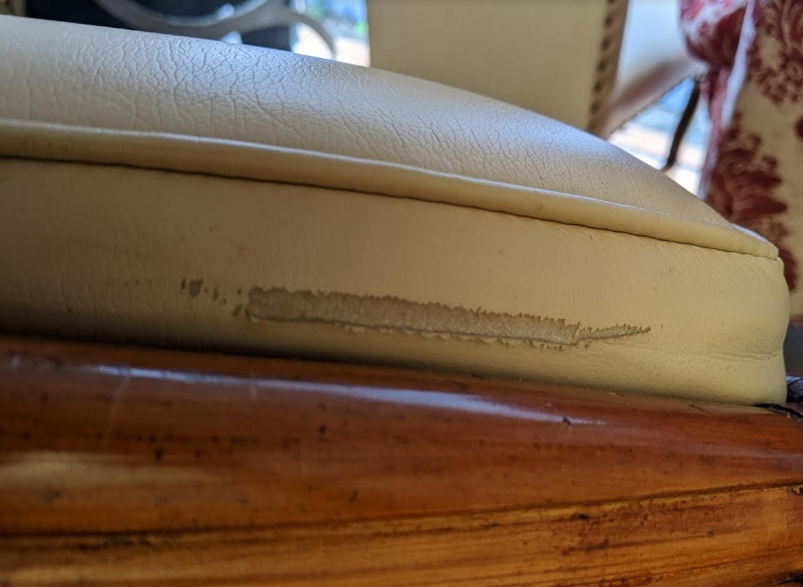 Good overall condition, wear and distressing commensurate with age and use, finish loss, marking, small tear along side of one seat.