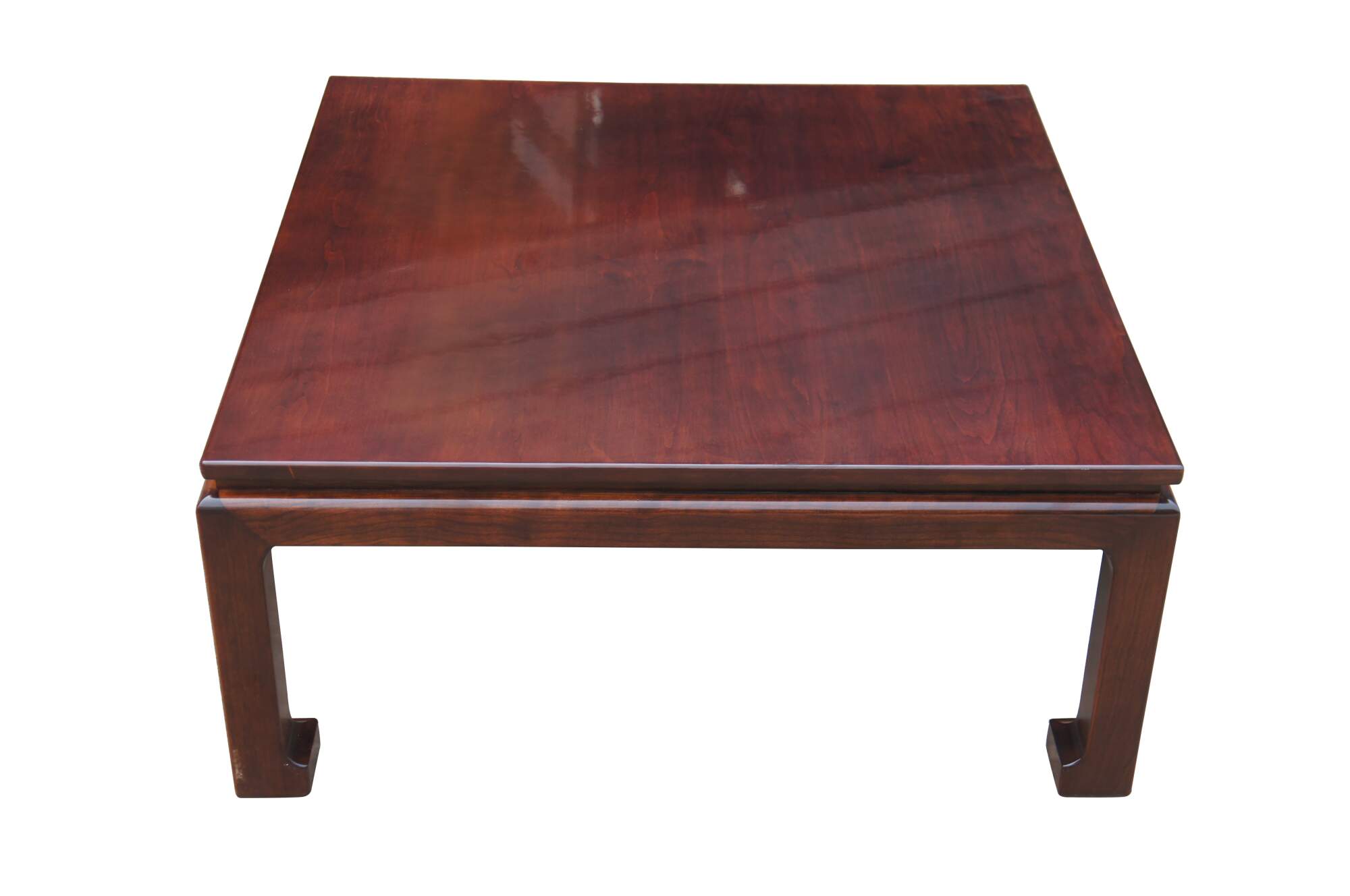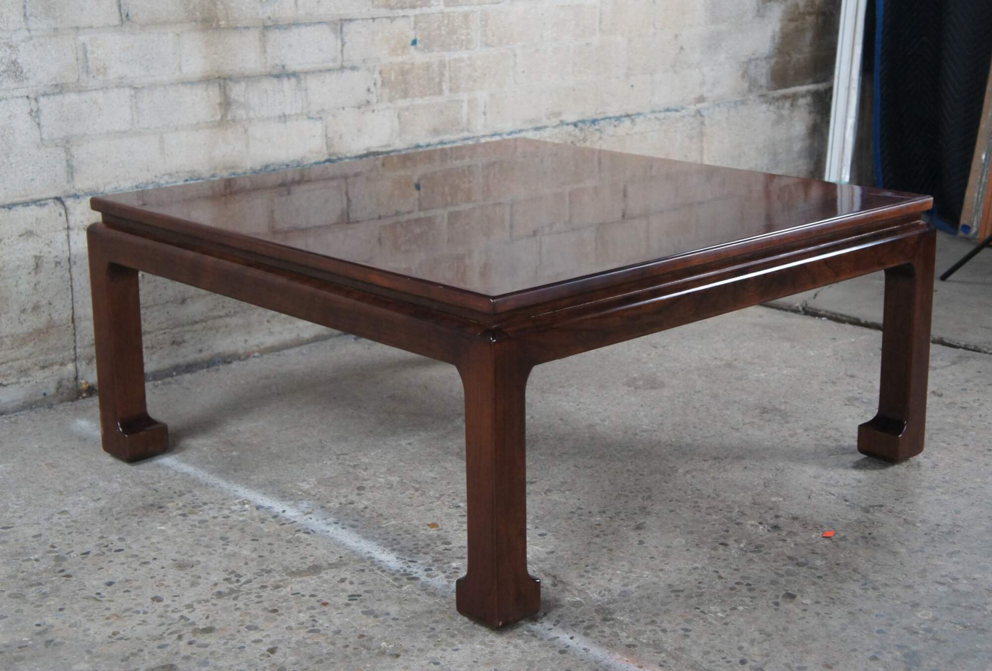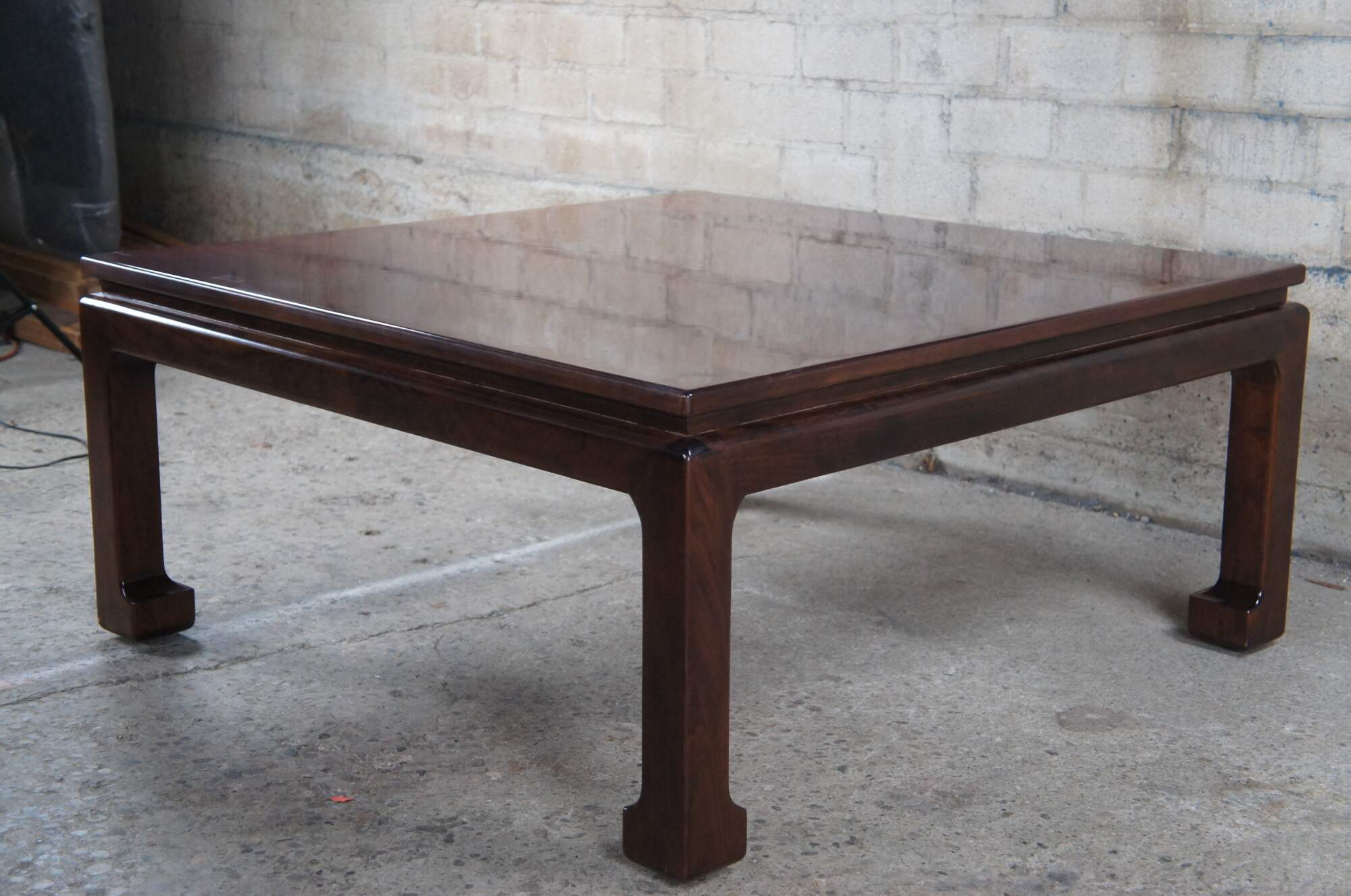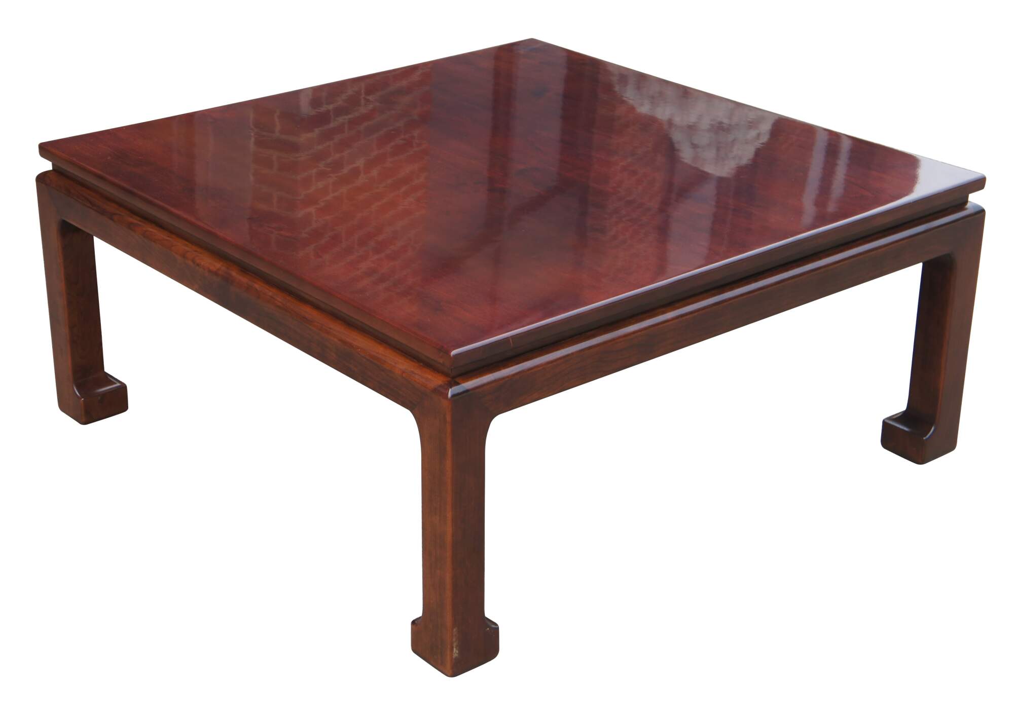 A beautiful Chinoiserie coffee table. Made from rosewood in classic Ming form with a square top over straight legs with inward flared feet. Brass plate along underside Marked NW.