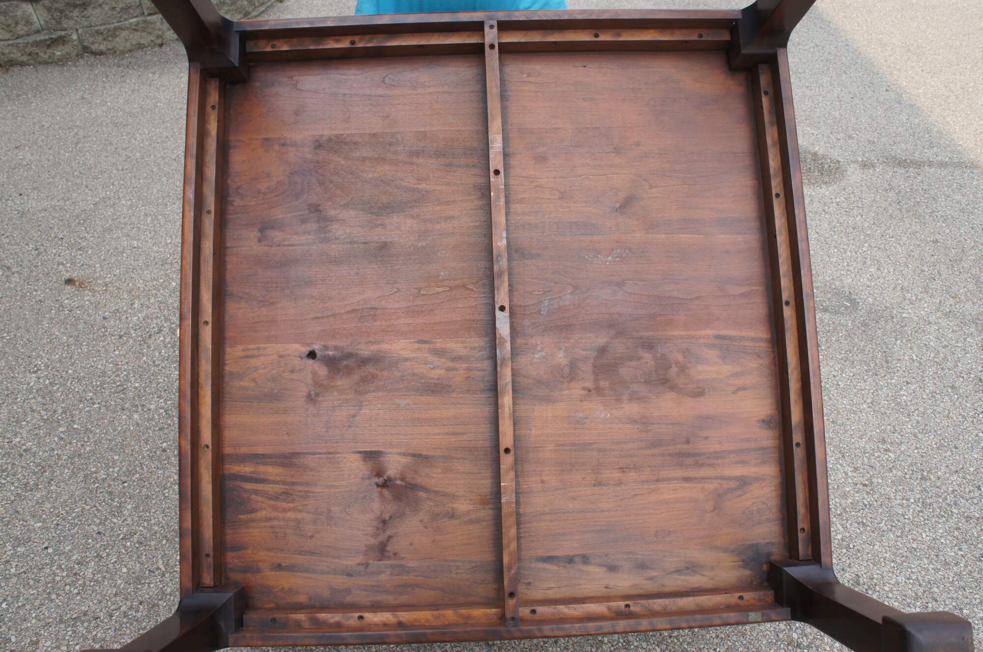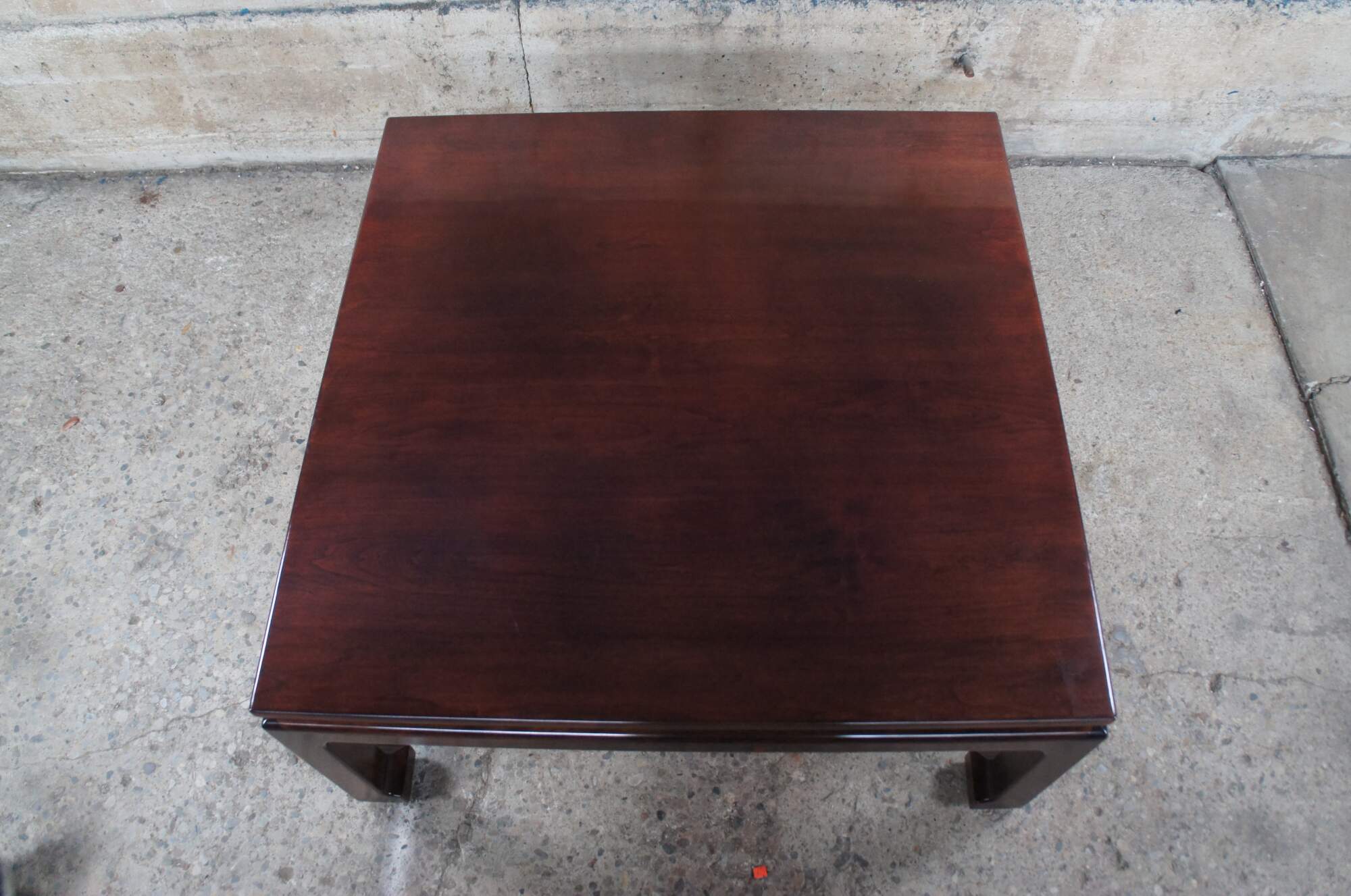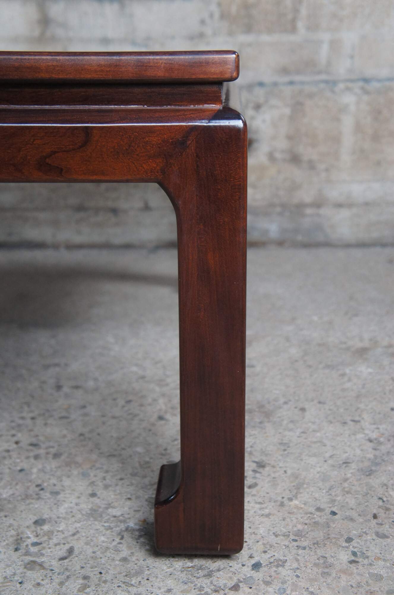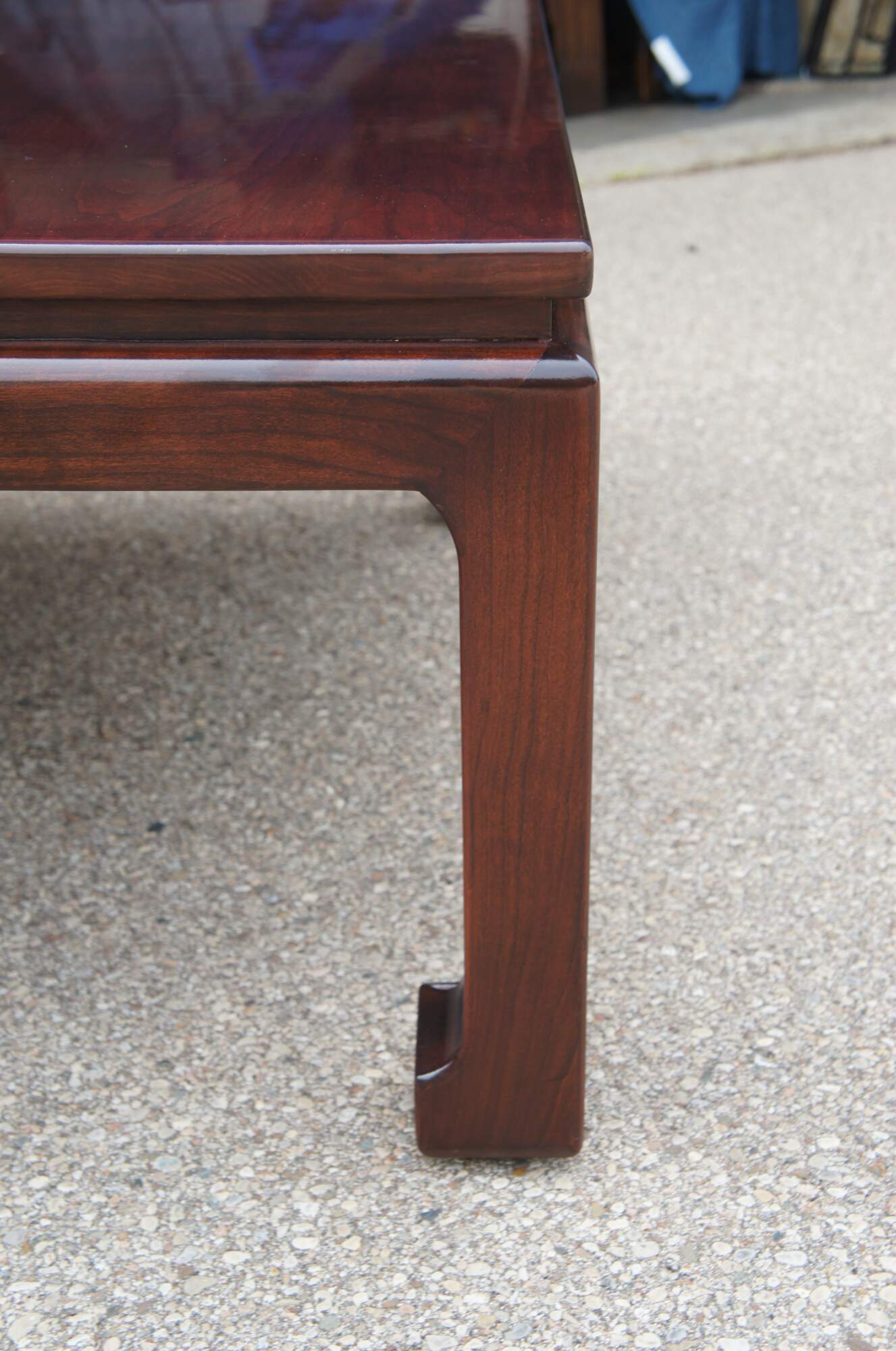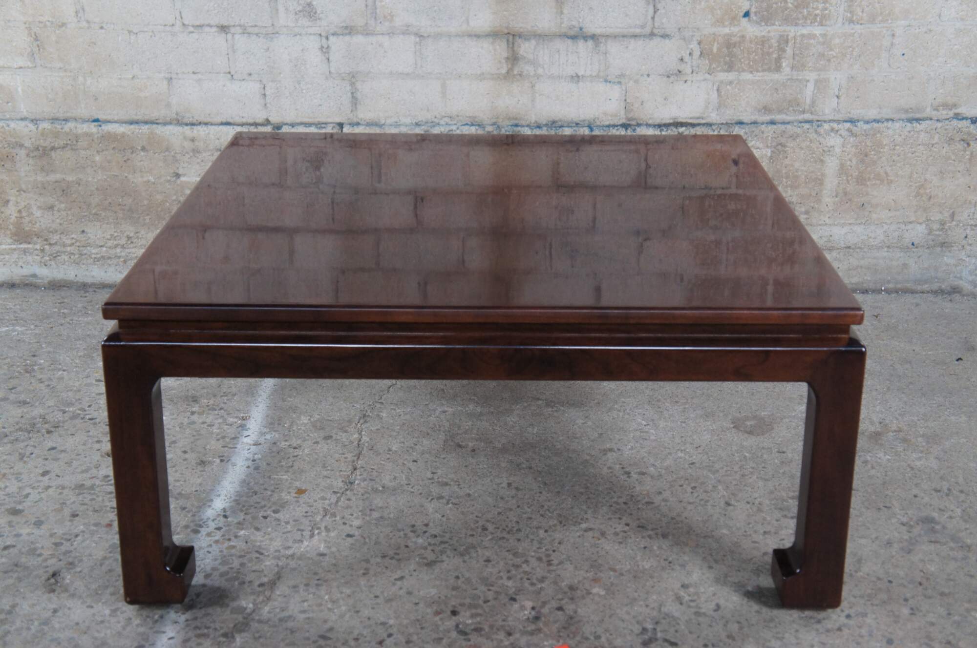A beautiful Chinoiserie coffee table. Made from rosewood in classic Ming form with a square top over straight legs with inward flared feet. Brass plate along underside Marked NW.