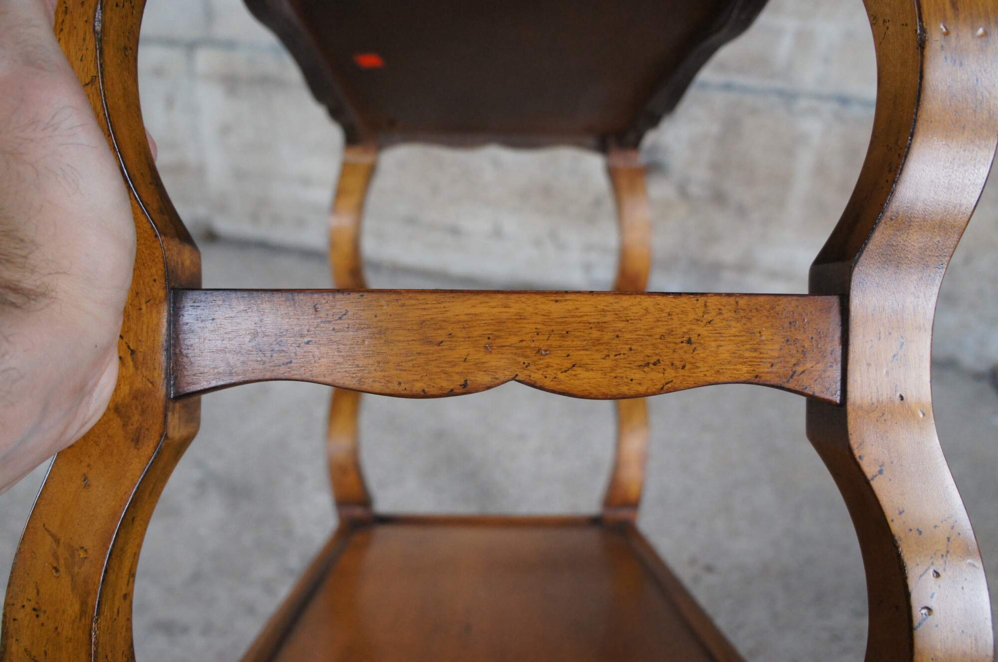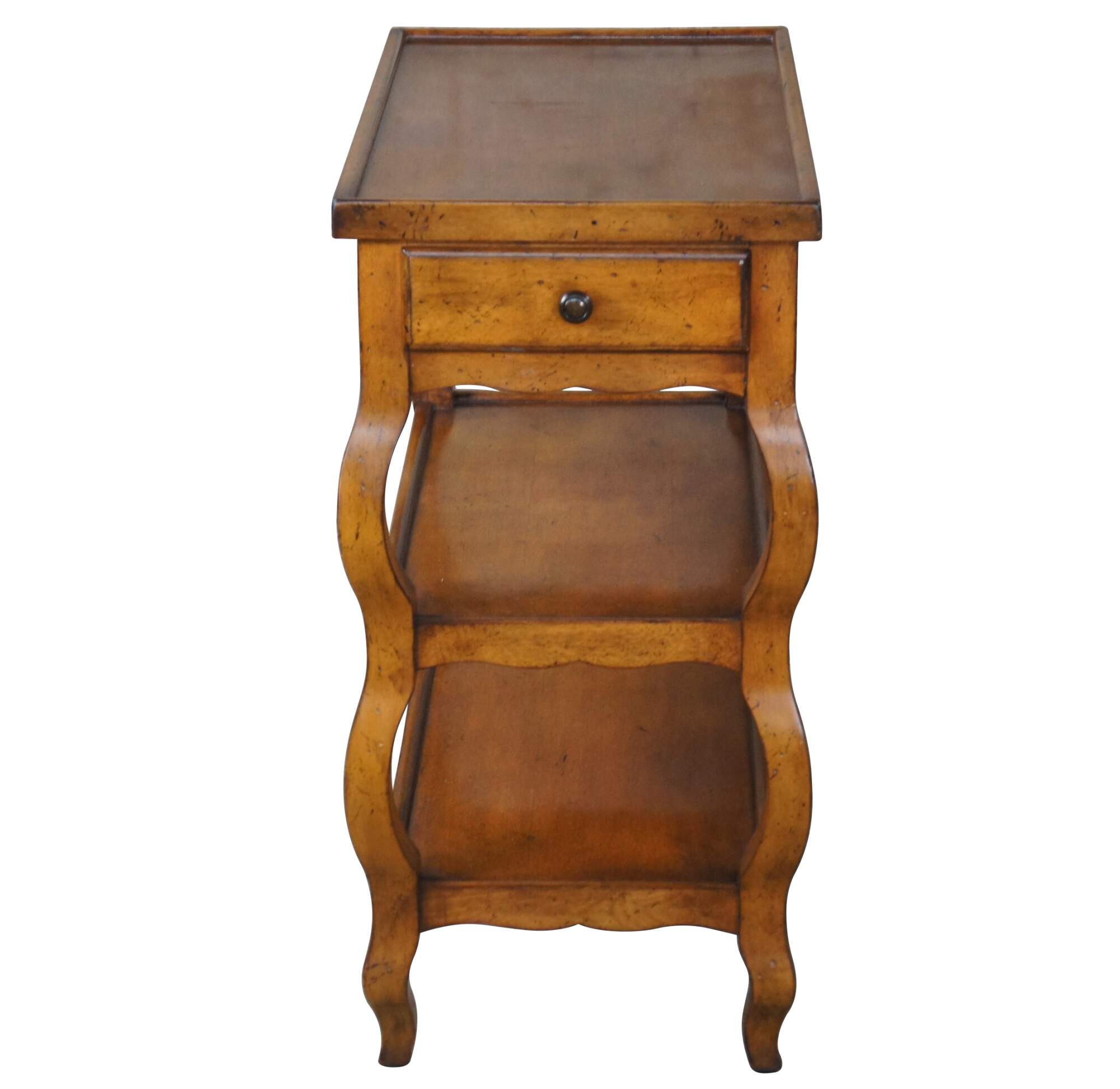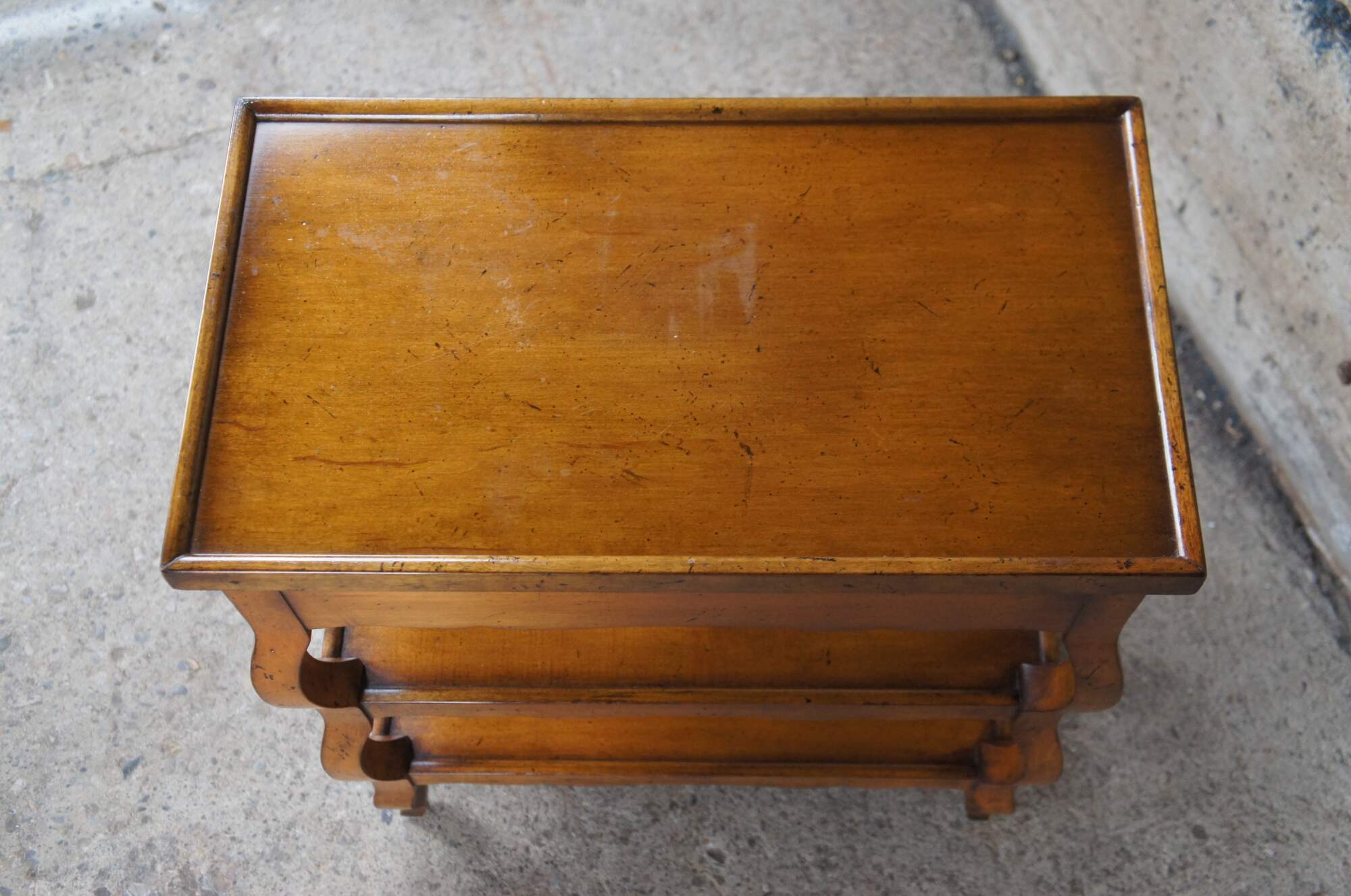 Vintage Baker Furniture Milling Road Collection side table. Made of walnut featuring a three tier design with serpentine accents, one drawer and gallery surface.