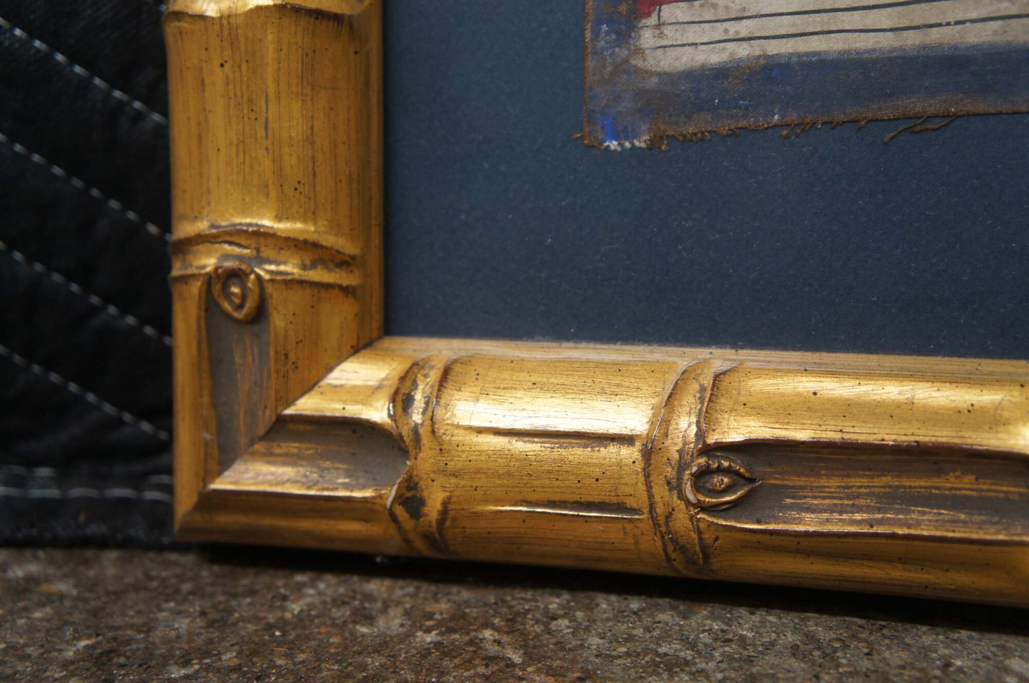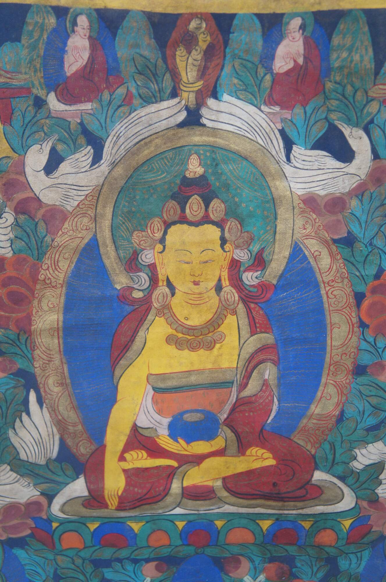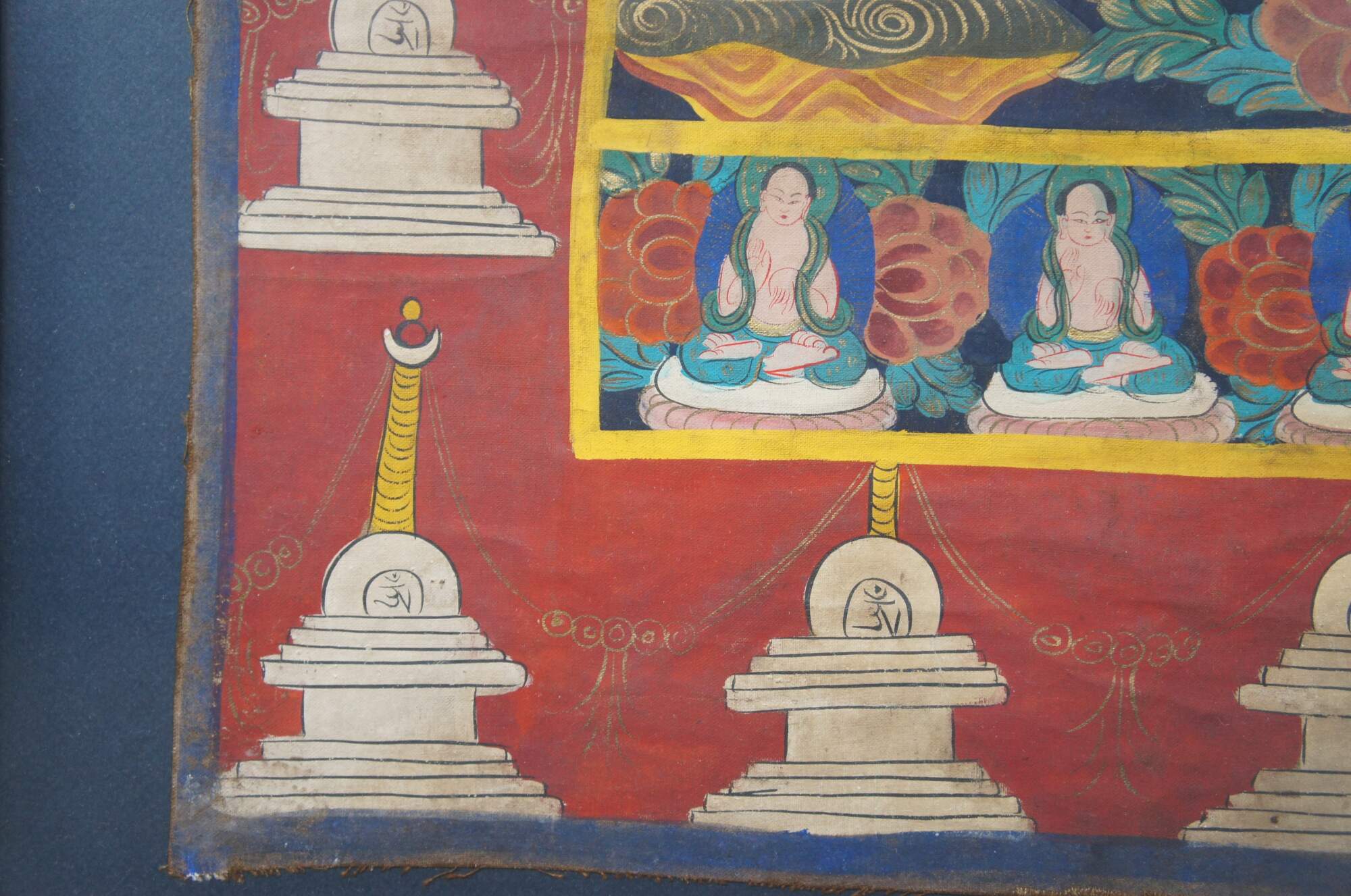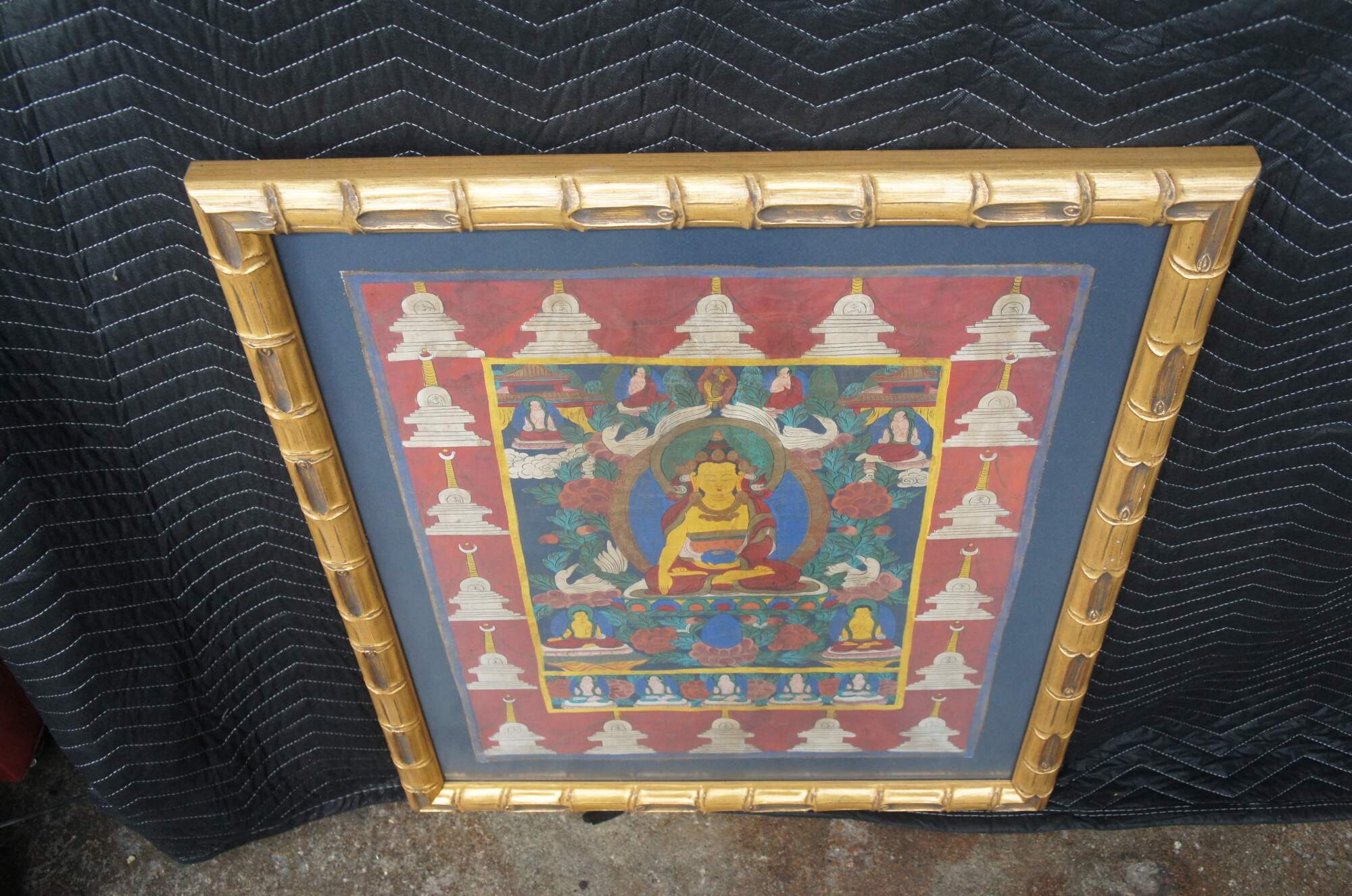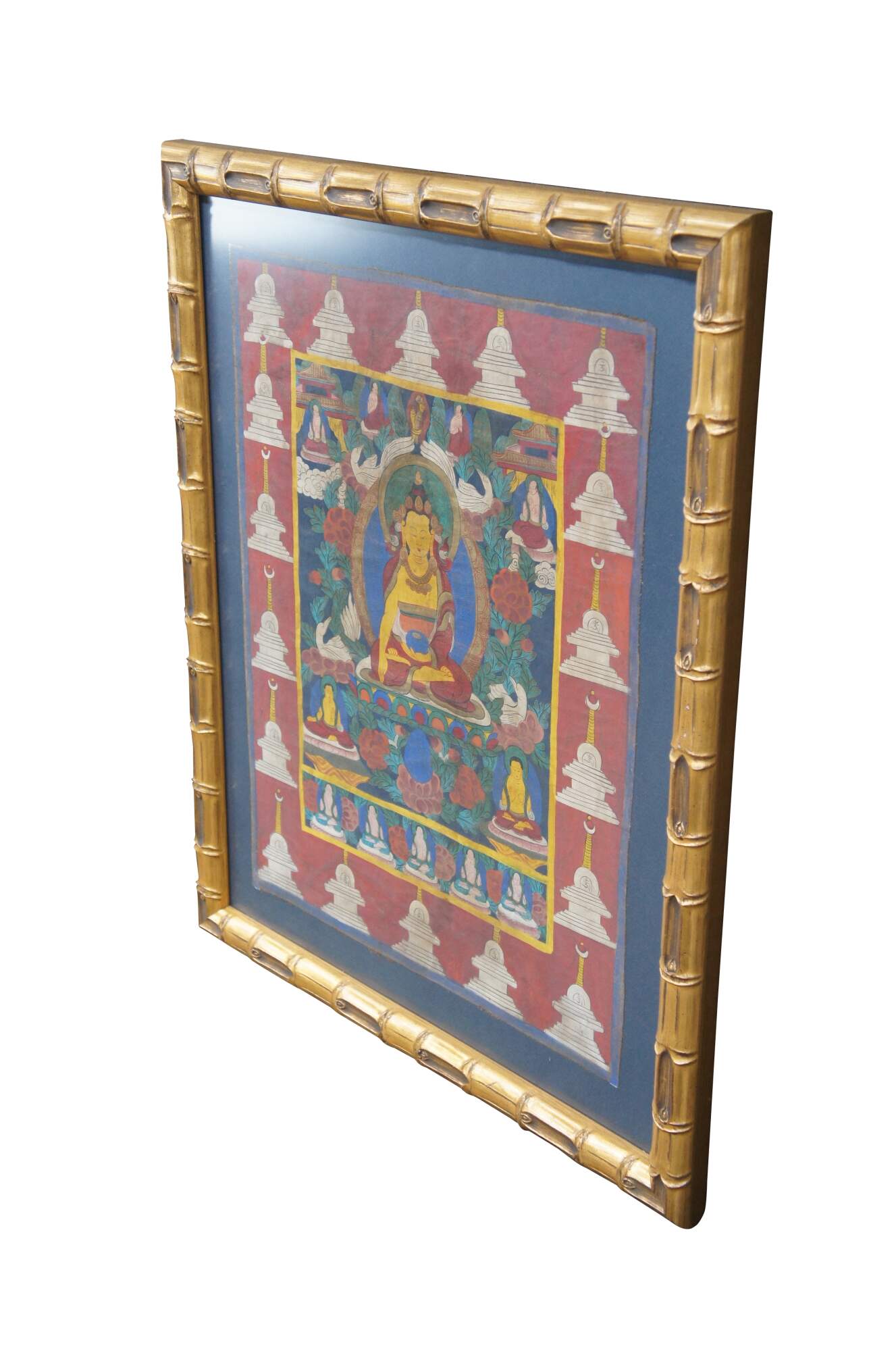 Hand Painted Tibetan Thangka from the last half of the 20th century. Features a central buddha surrounded by foliate, flowers, whooper swans and smaller buddha figures. The border is framed in Stupa's (Pagodas). Framed in wood with raised faux bamboo