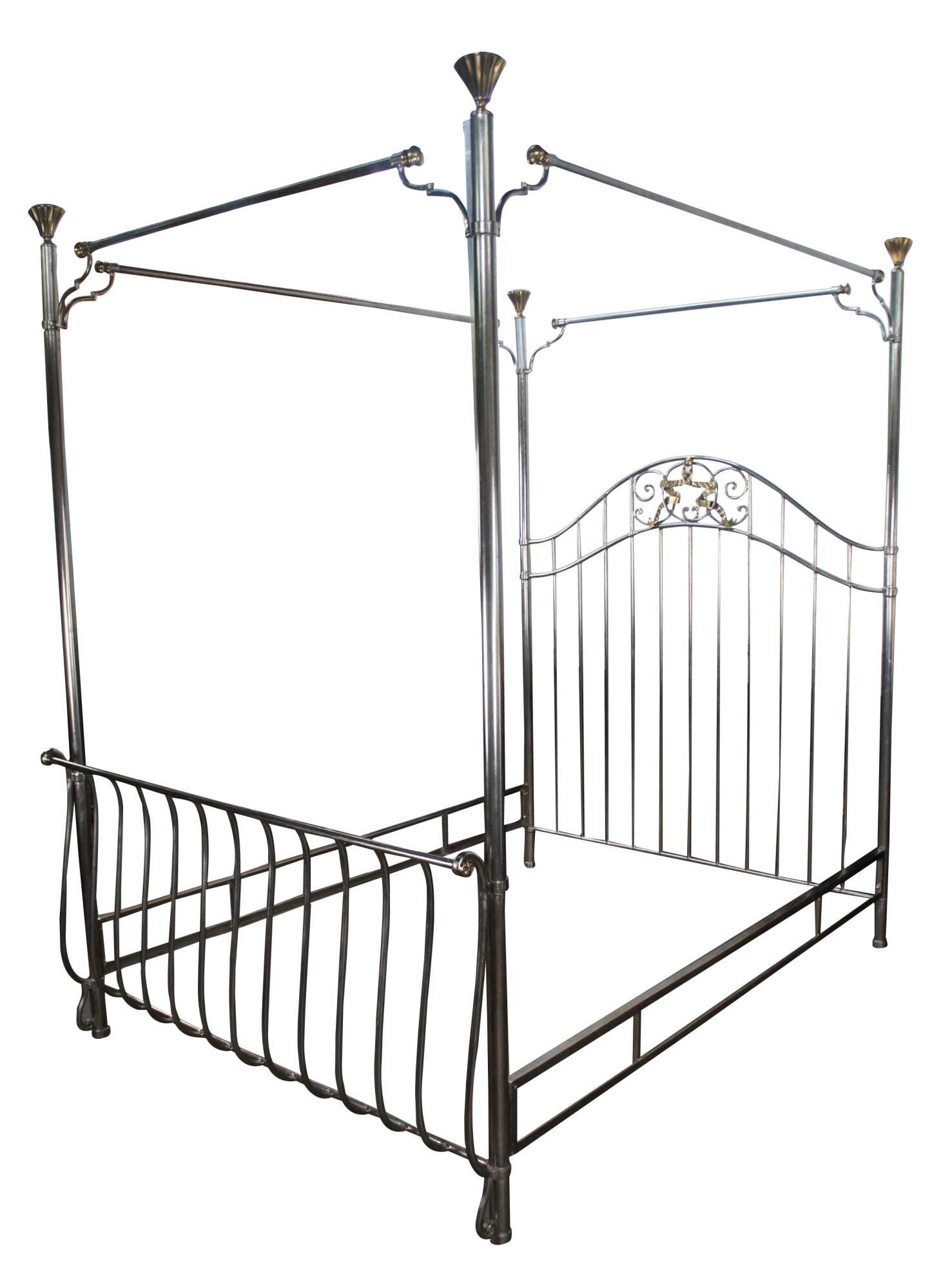 Maitland Smith Neoclassical style four poster Queen size canopy bed, circa 1990s. Made from metal with a silver and gold finish. Features a sleigh form along the front and camelback headboard with ornate scrolling and laurel wreath at the center.