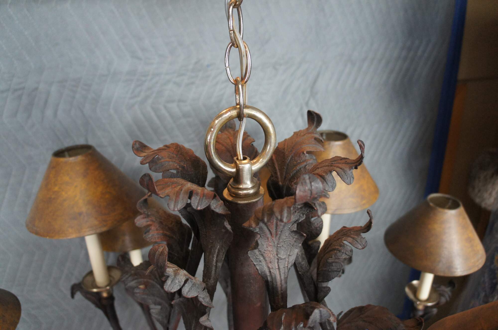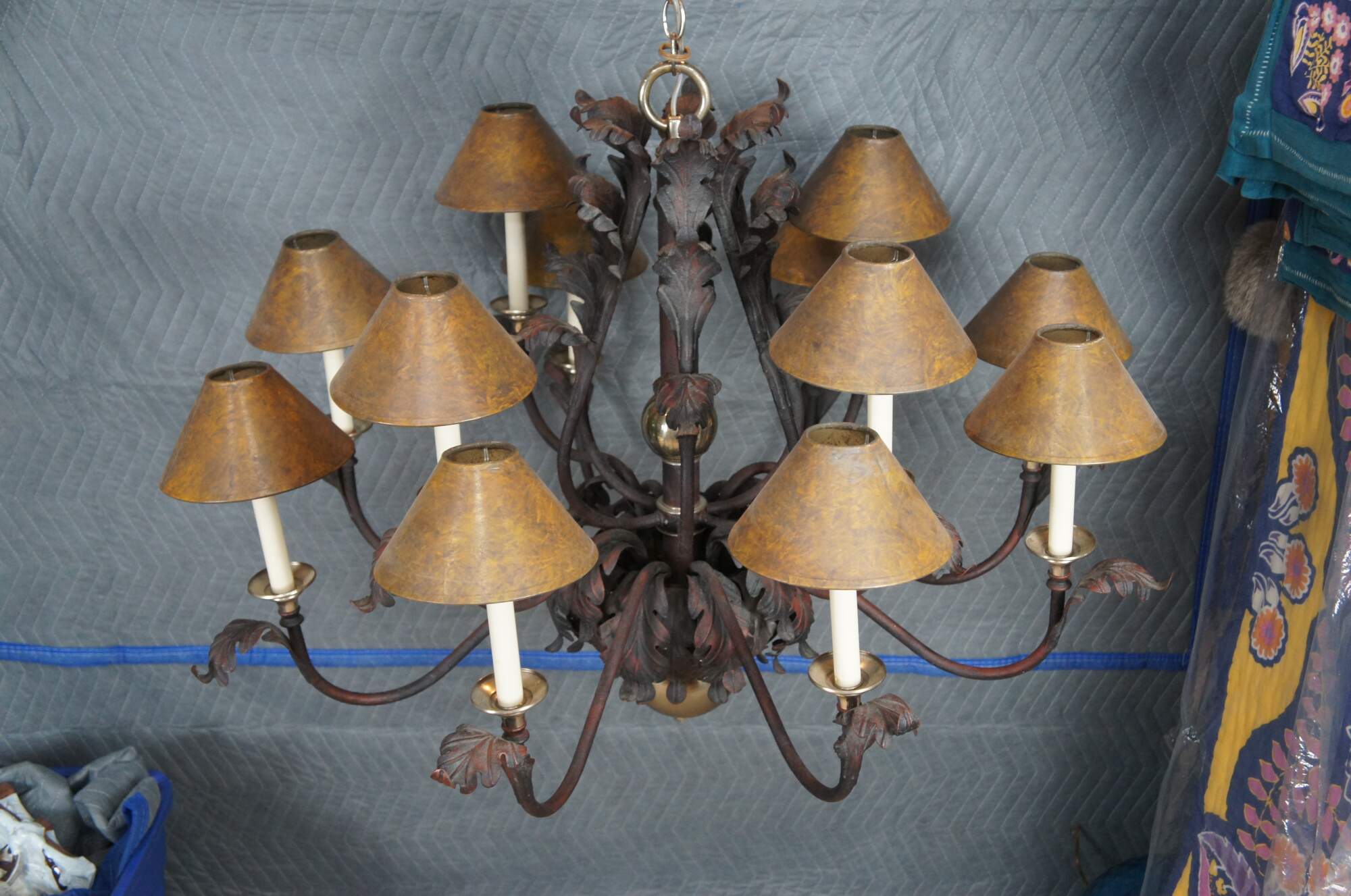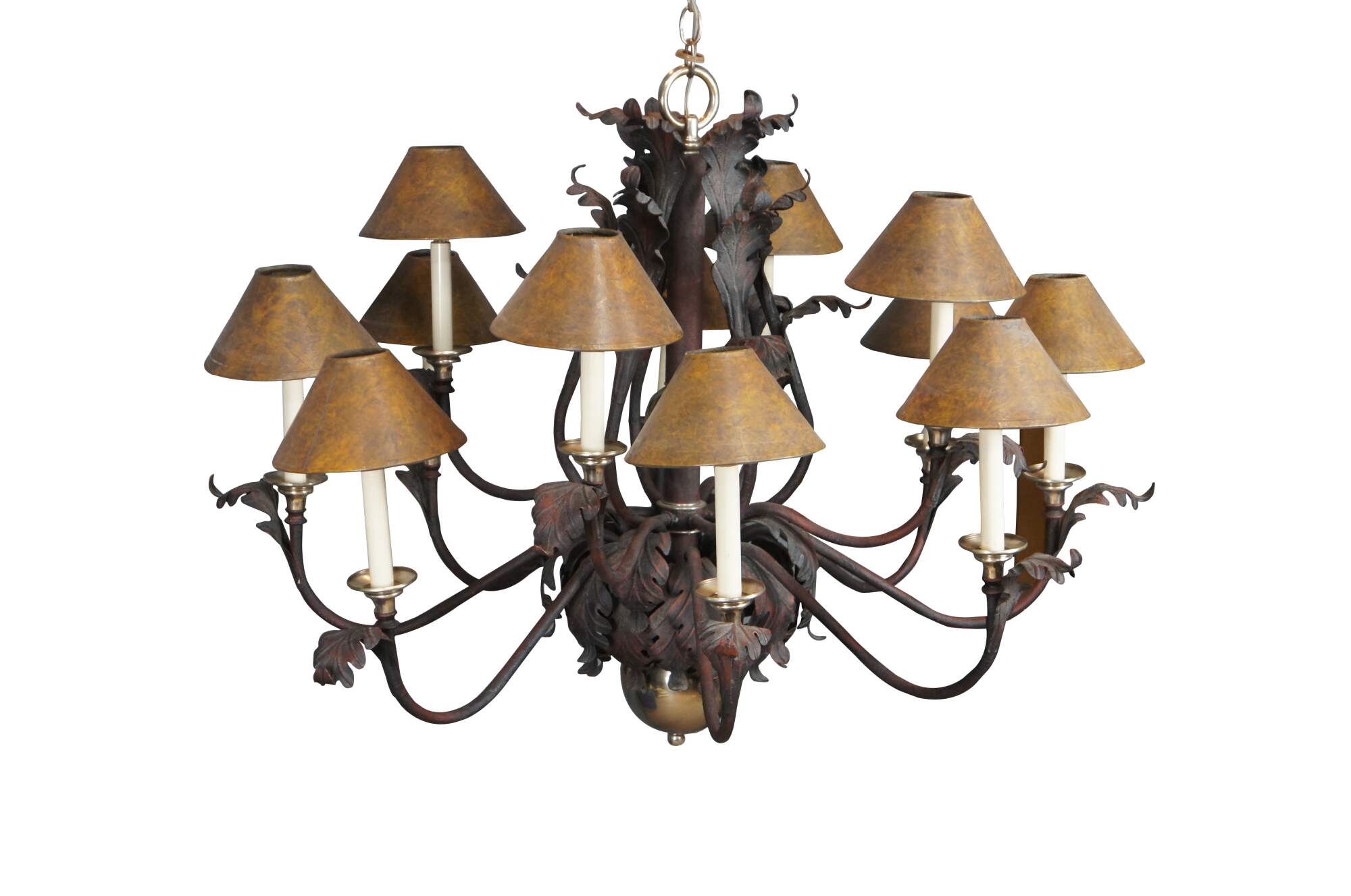 Vintage scrolled iron chandelier featuring French acanthus leaf design with twelve candlestick lights and shades, and brass accents..