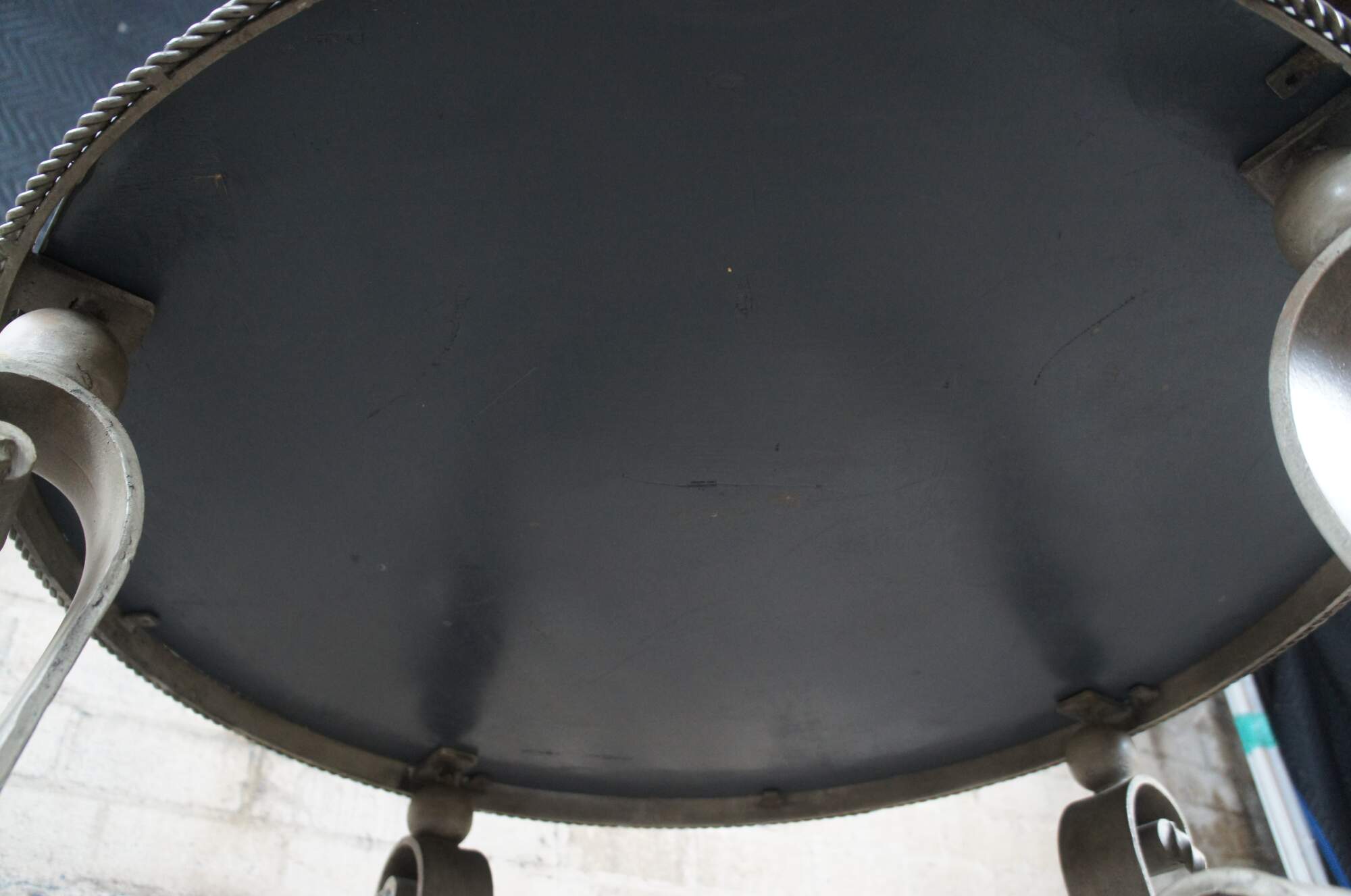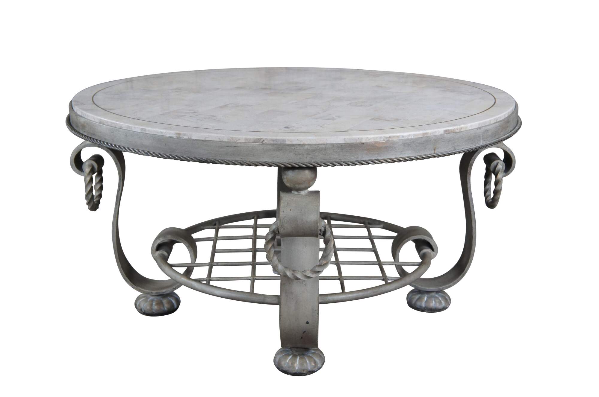 Vintage Maitland Smith coffee or cocktail table featuring round form with tessellated stone top supported by heavy tiered iron base with twisted and scrolled accents.