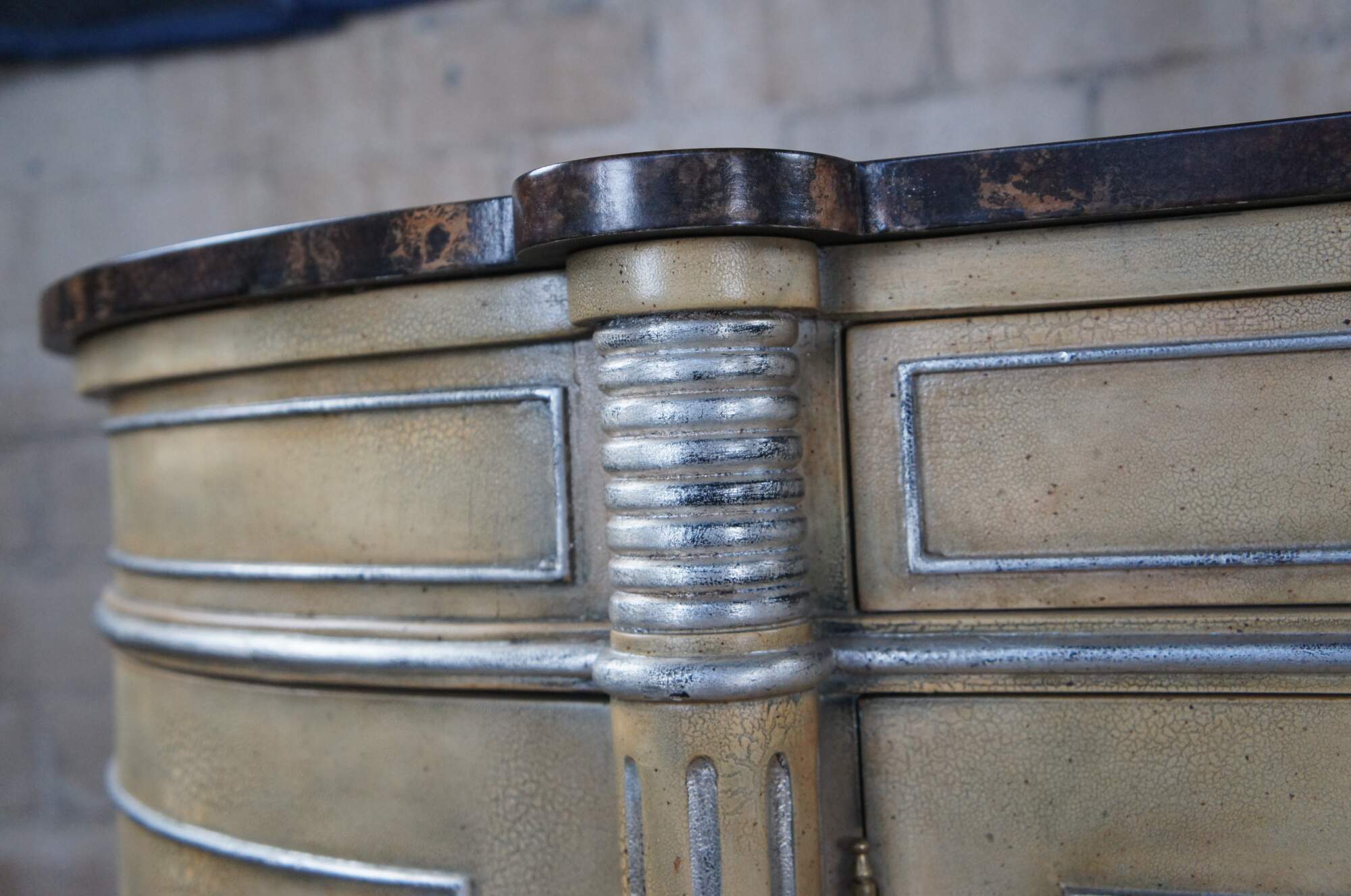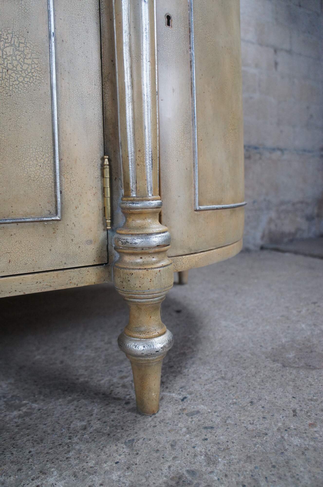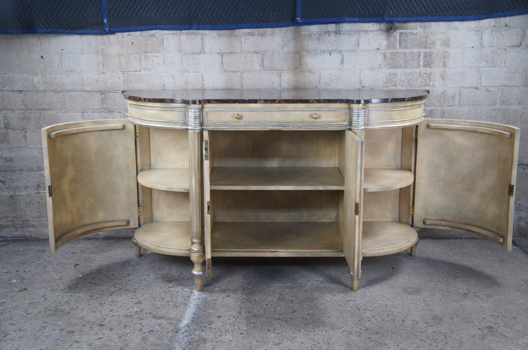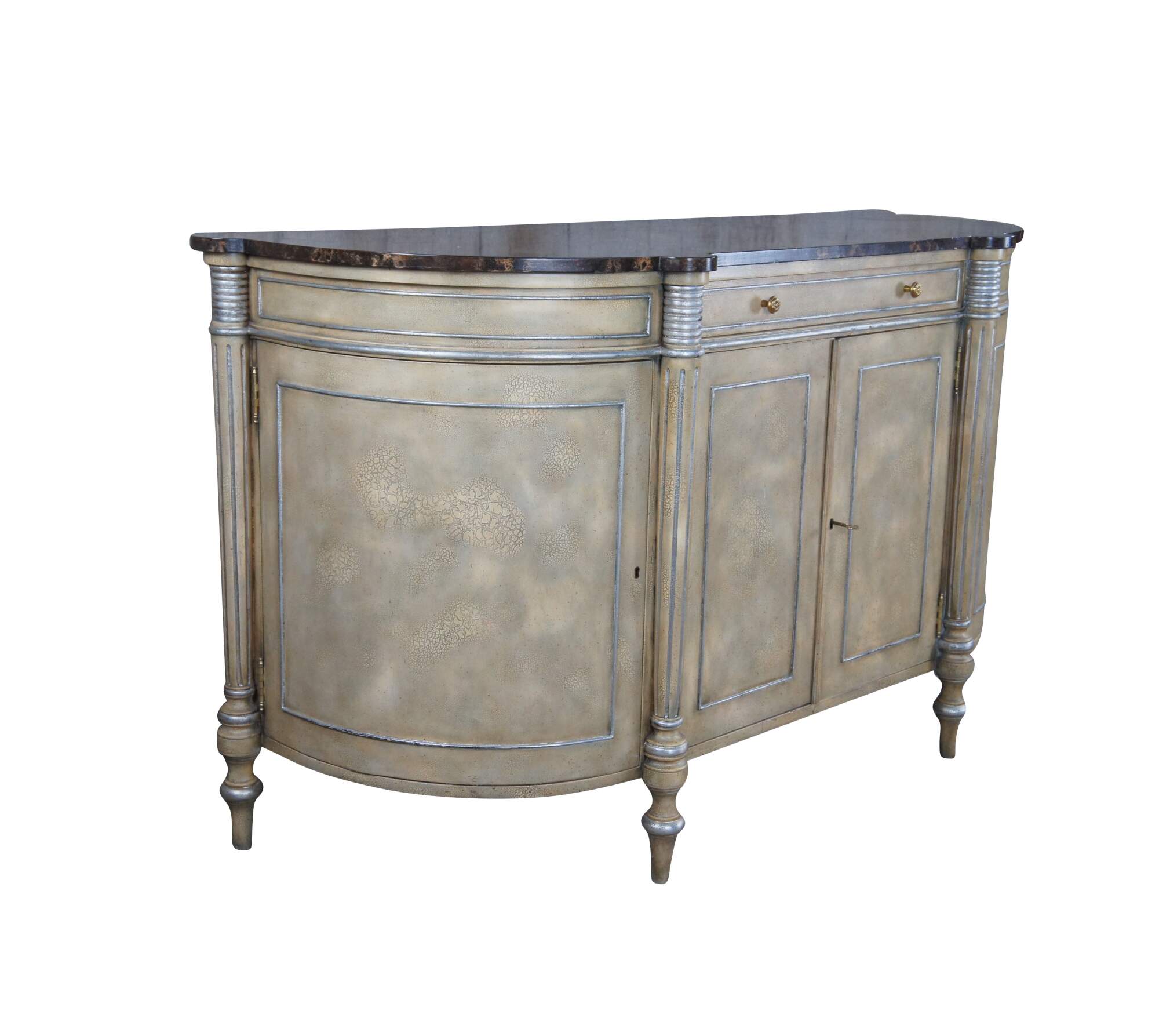 Maitland Smith French Louis XVI inspired sideboard, circa last quarter 20th century. Made from hardwood with a painted finish. Includes a faux marble top and silver leaf accents. Features a demilune or bowfront shape with a central drawer over lower cabinets with shelves. The cabinet is supported by four turned, fluted and ribbed columns leading to arrow feet. Marked Maitland Smith inside of top drawer.