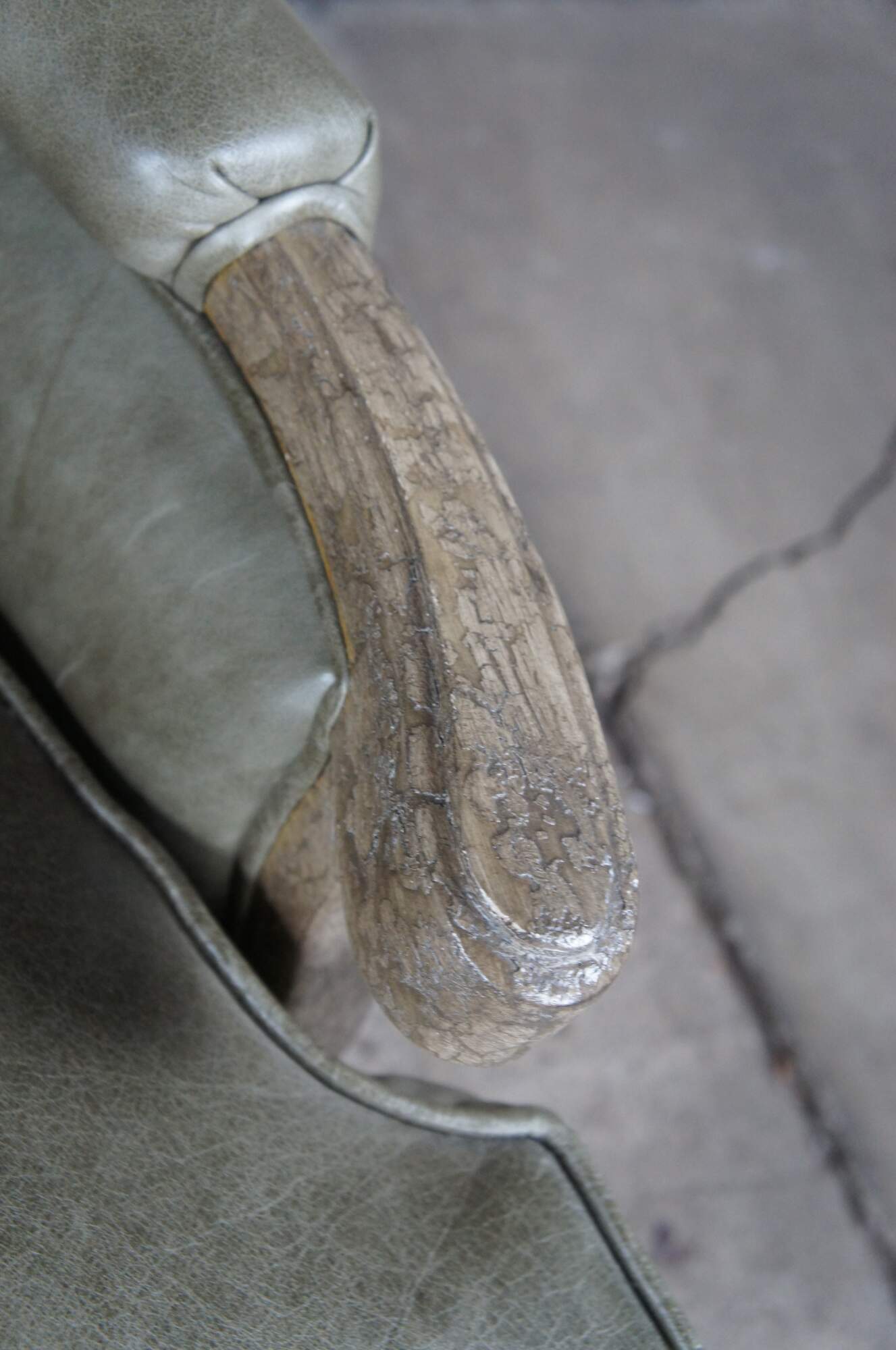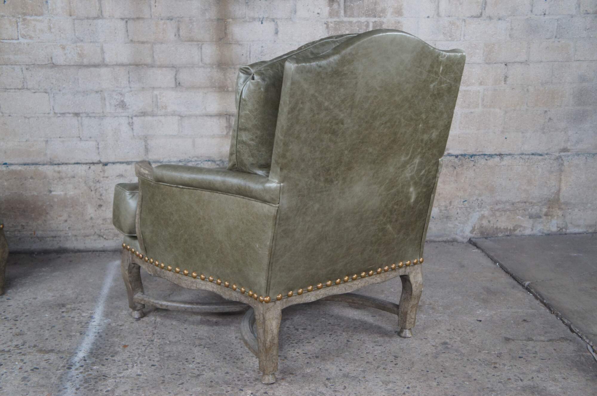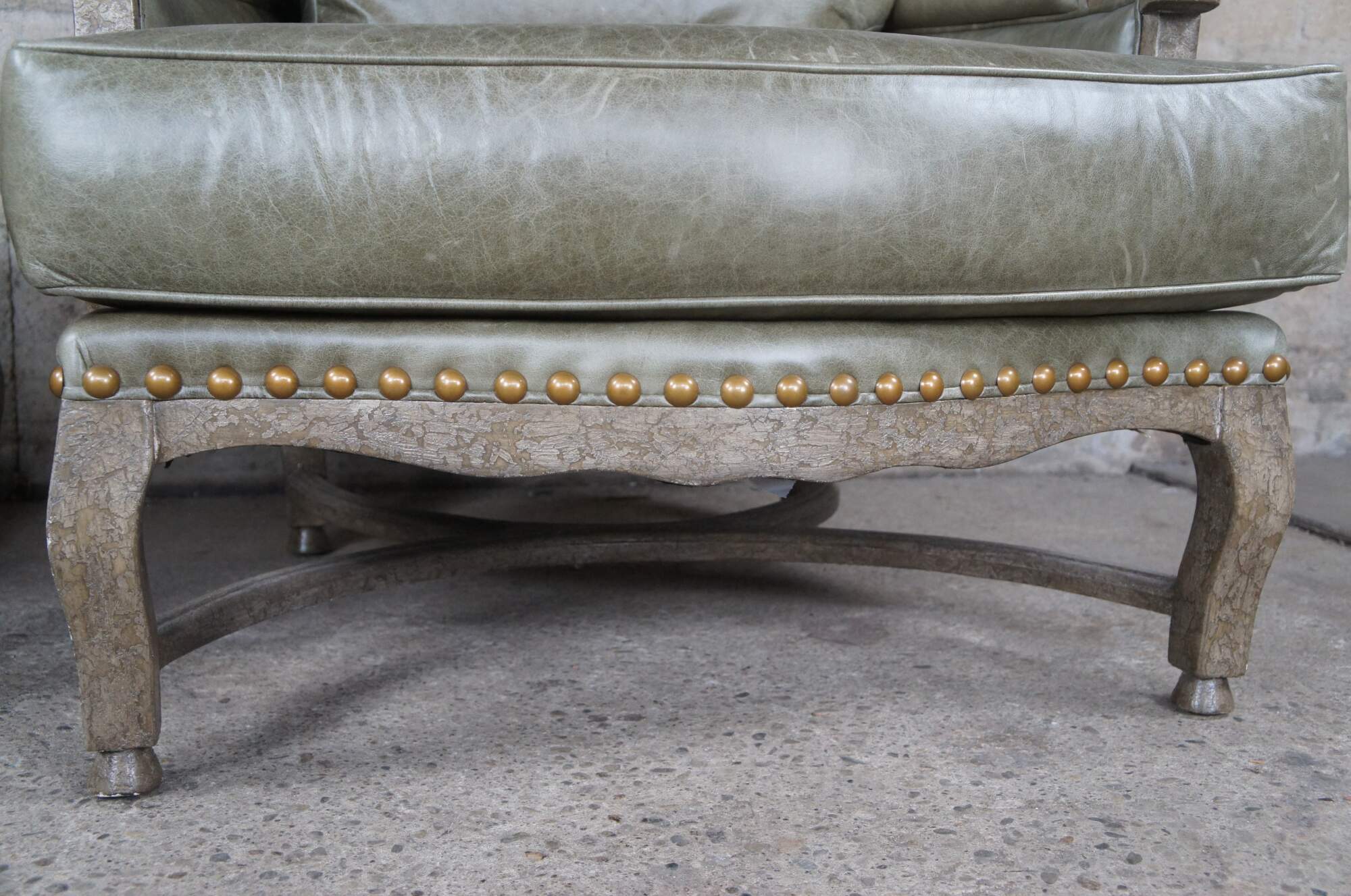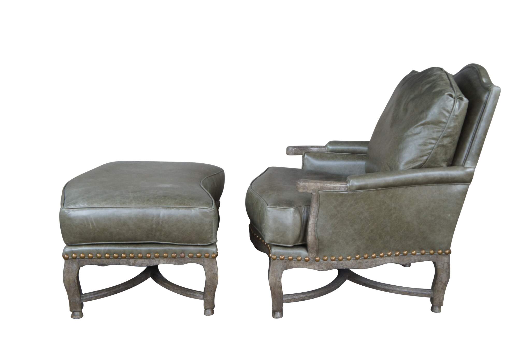 Vintage Dakota Bergere chair and ottoman by Hammer Fine Furniture. Featuring French styling with Tuscan Field Green Leather and Brixton Crackle finish frame with nailhead trim. Made for Joseph Interiors of North Palm Beach Florida.