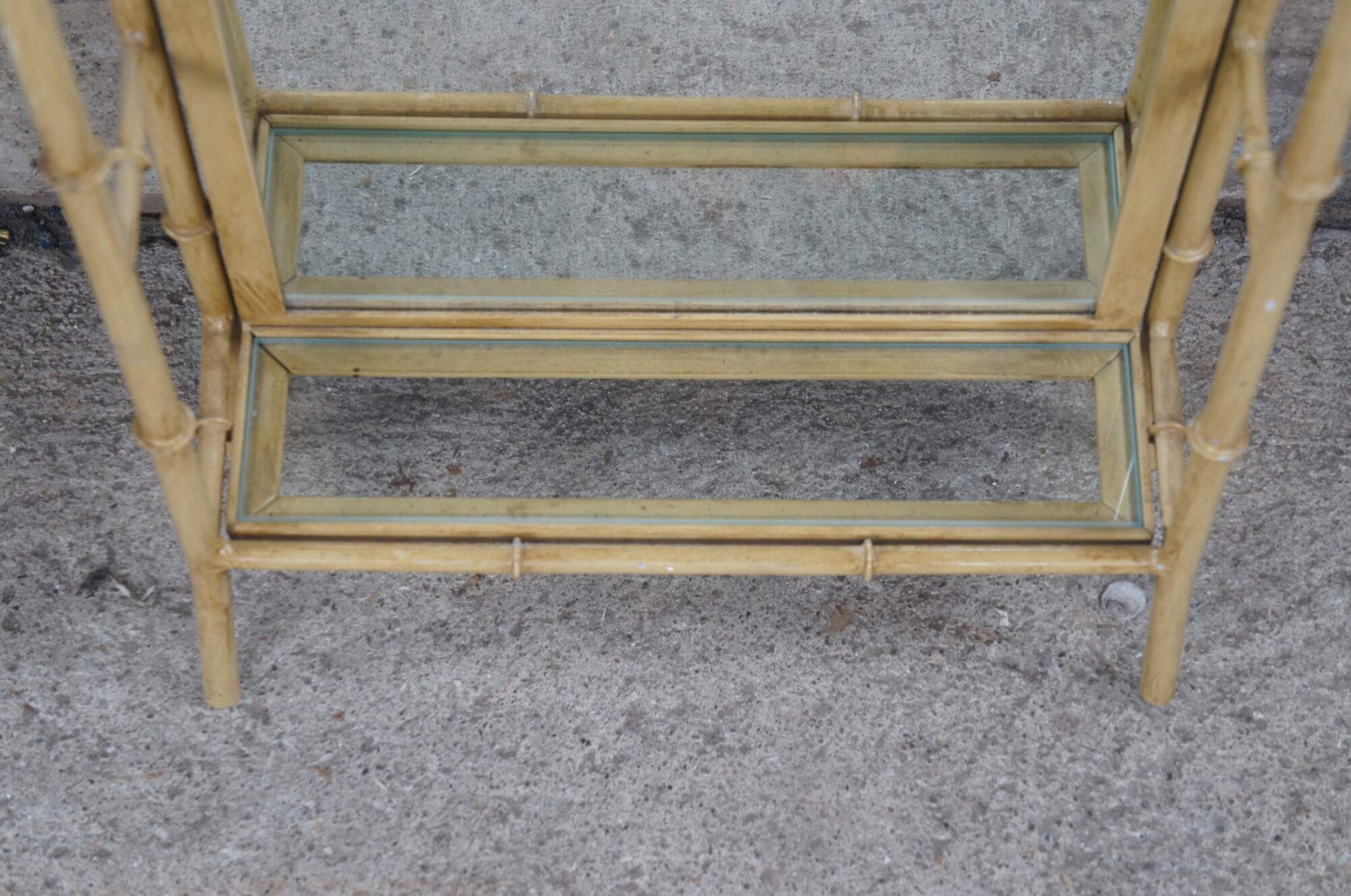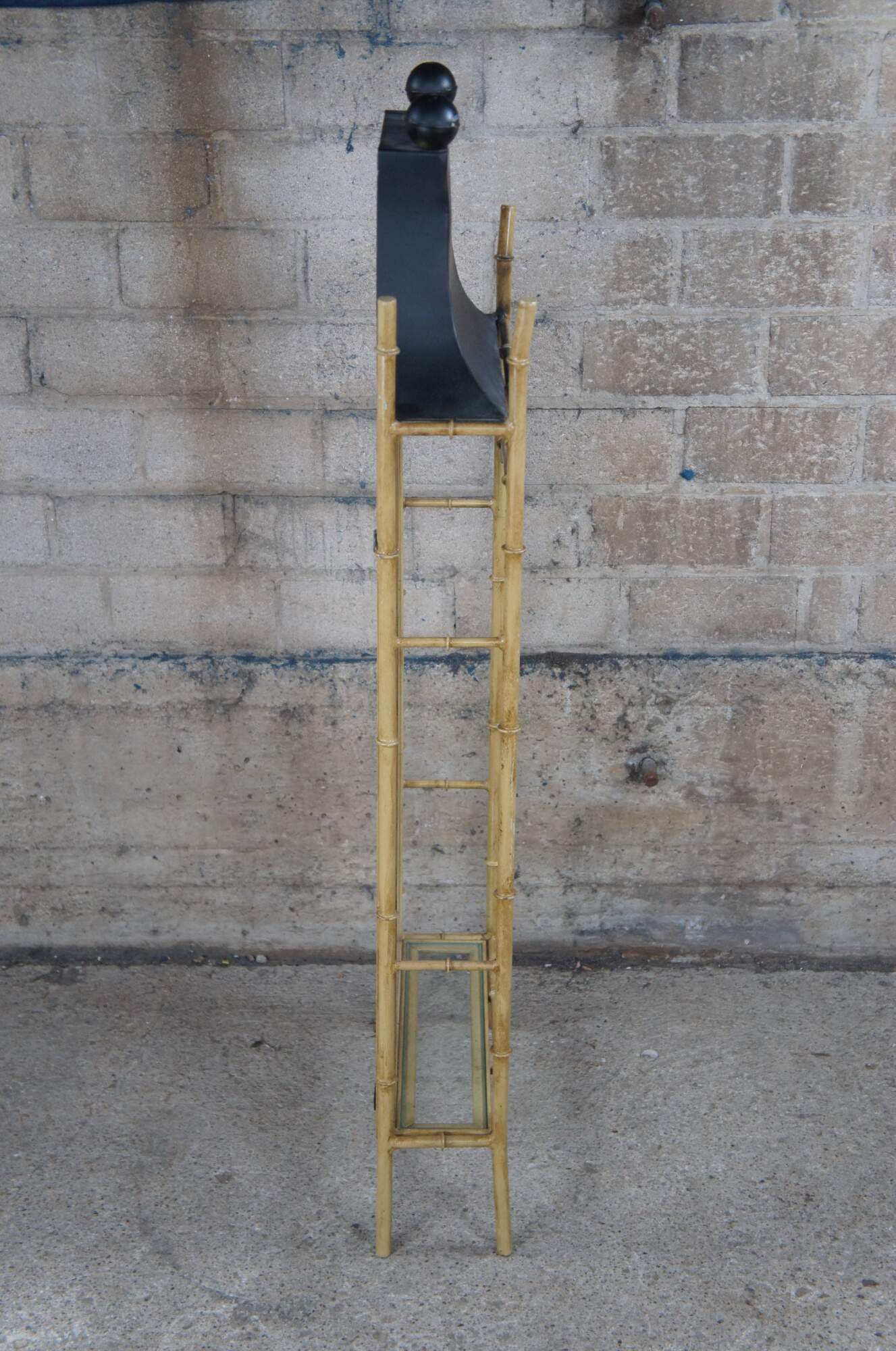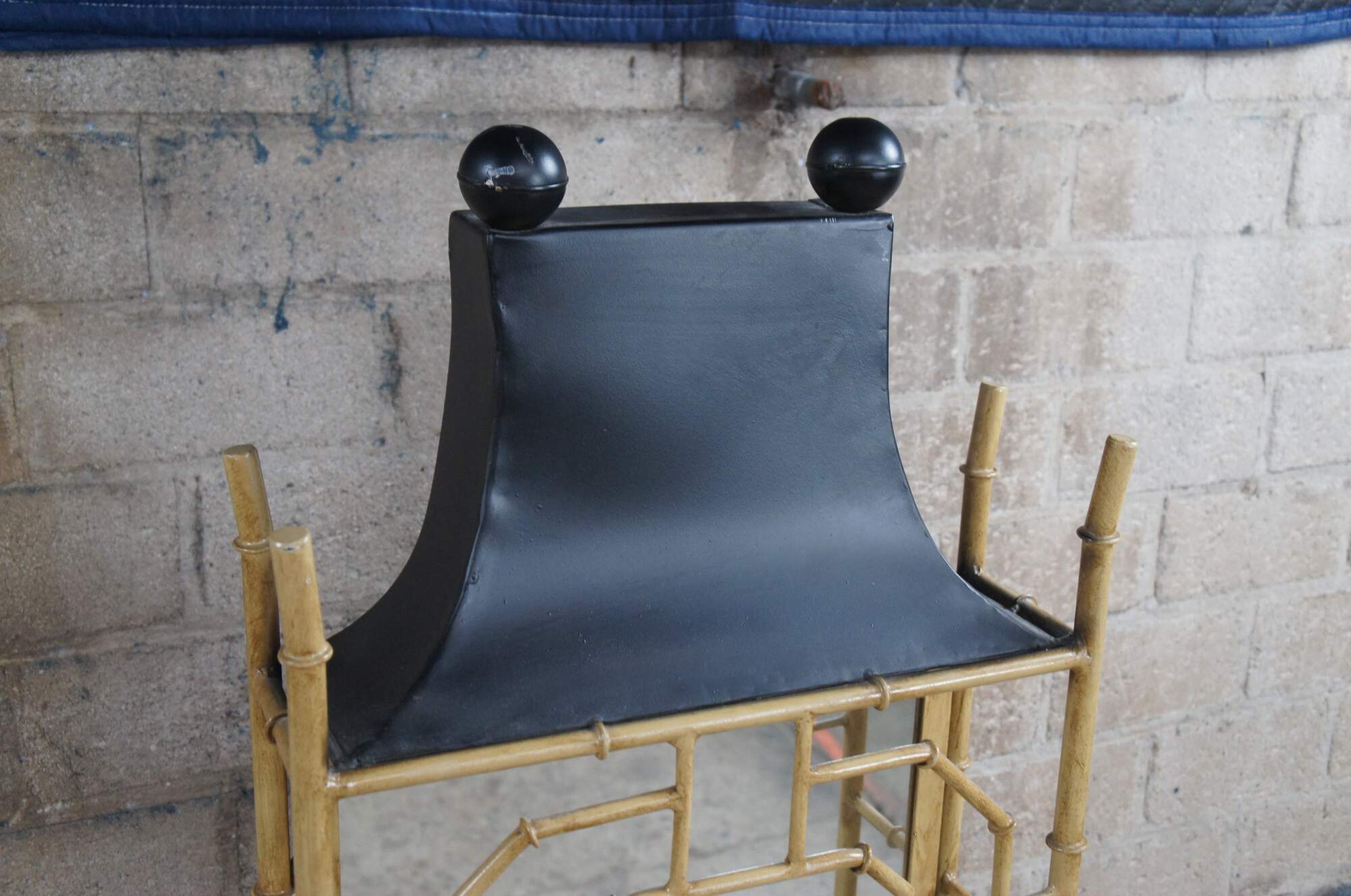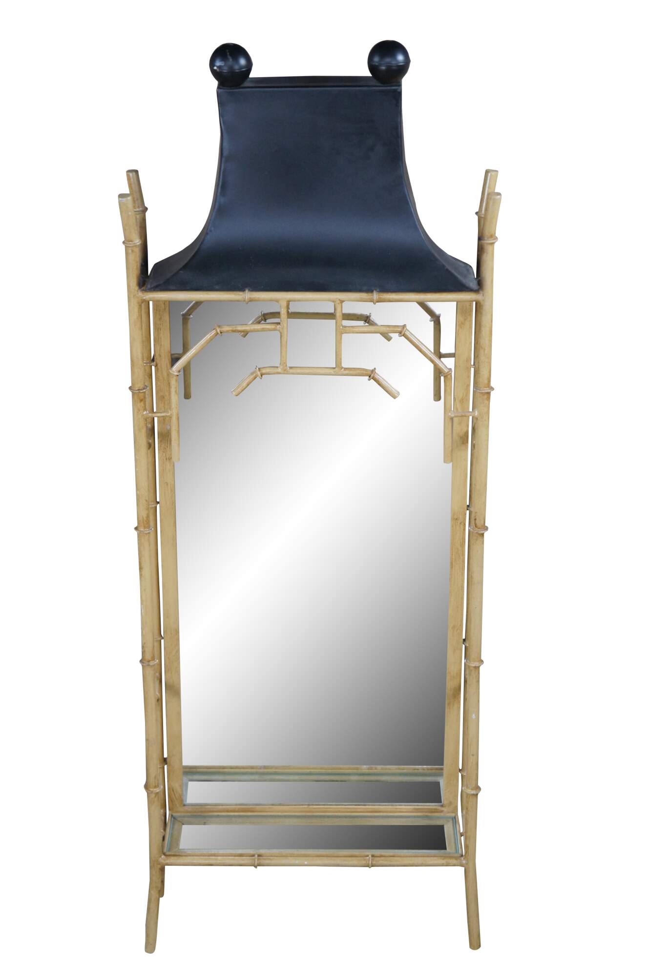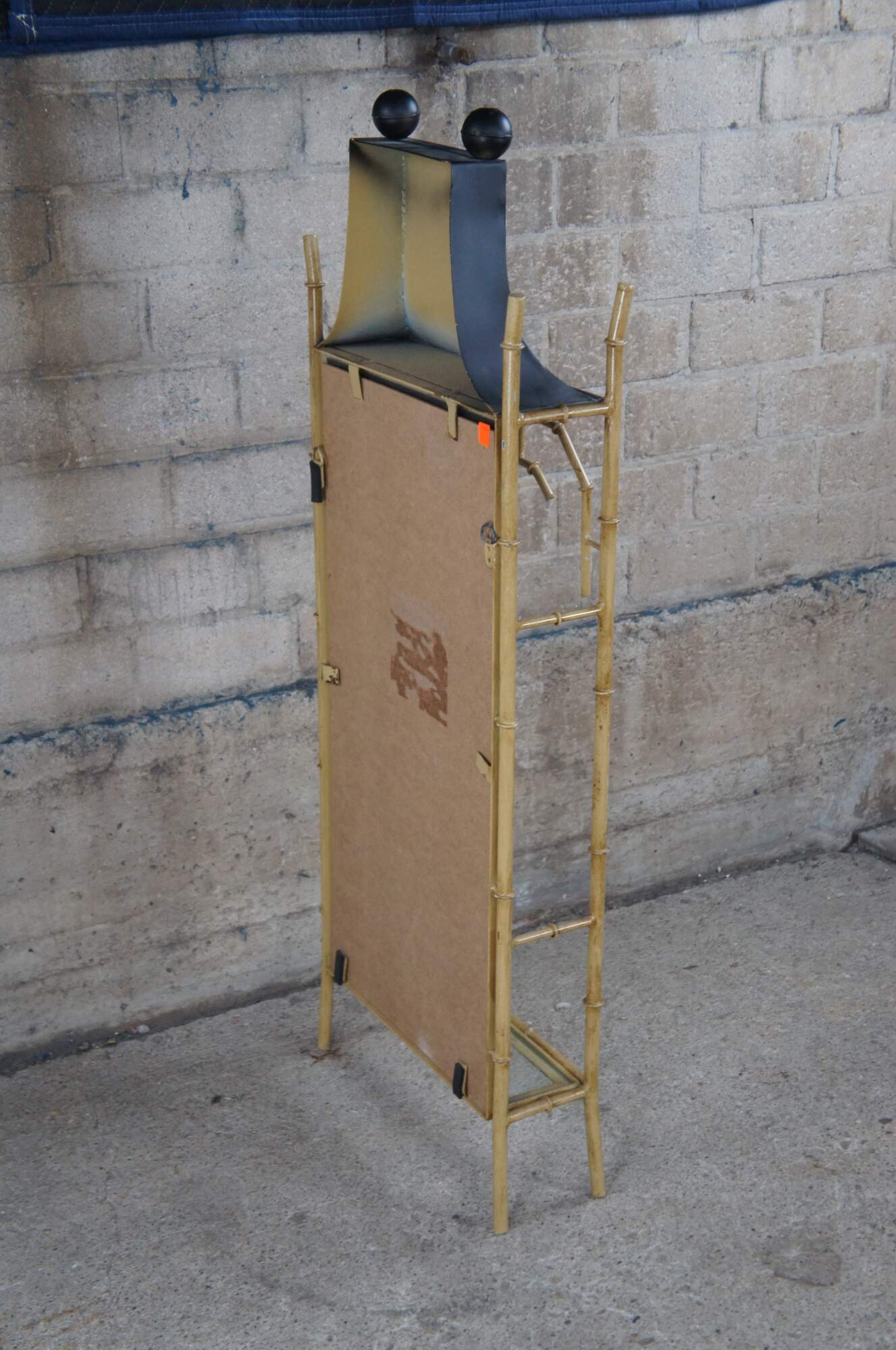 Vintage Chinese Chinoiserie mirrored wall shelf. Made of metal featuring Pagoda / altar form with mirrored back and glass shelf.