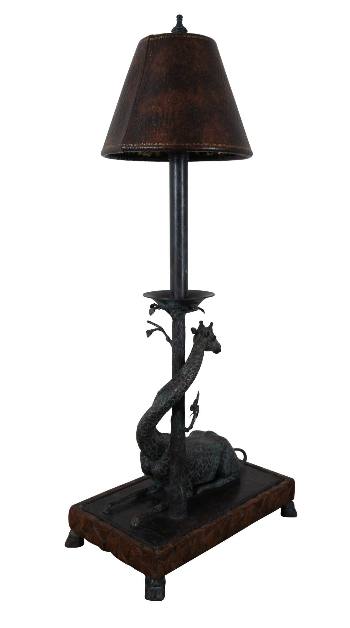 Maitland Smith table lamp, made of bronze with factory distressed patina / verdigris. Rectangular base supported by hoof feet, decorated with a coconut shell mosaic echoing the pattern of giraffe hide. On the base lays a reclining giraffe with its neck curled around the base of a tree, which becomes a candlestick topped with an urn shaped finial. Includes brown pebbled leather shade. Marked 143 on base. Hand Made in the Philippines.
