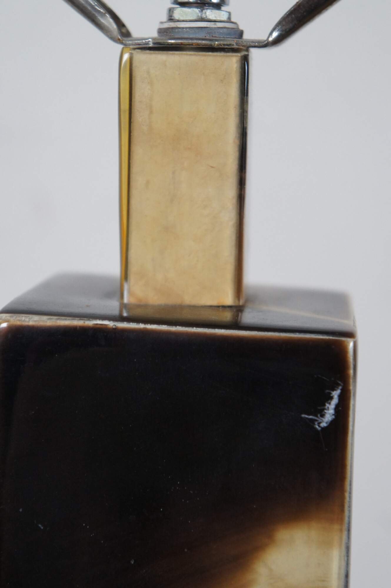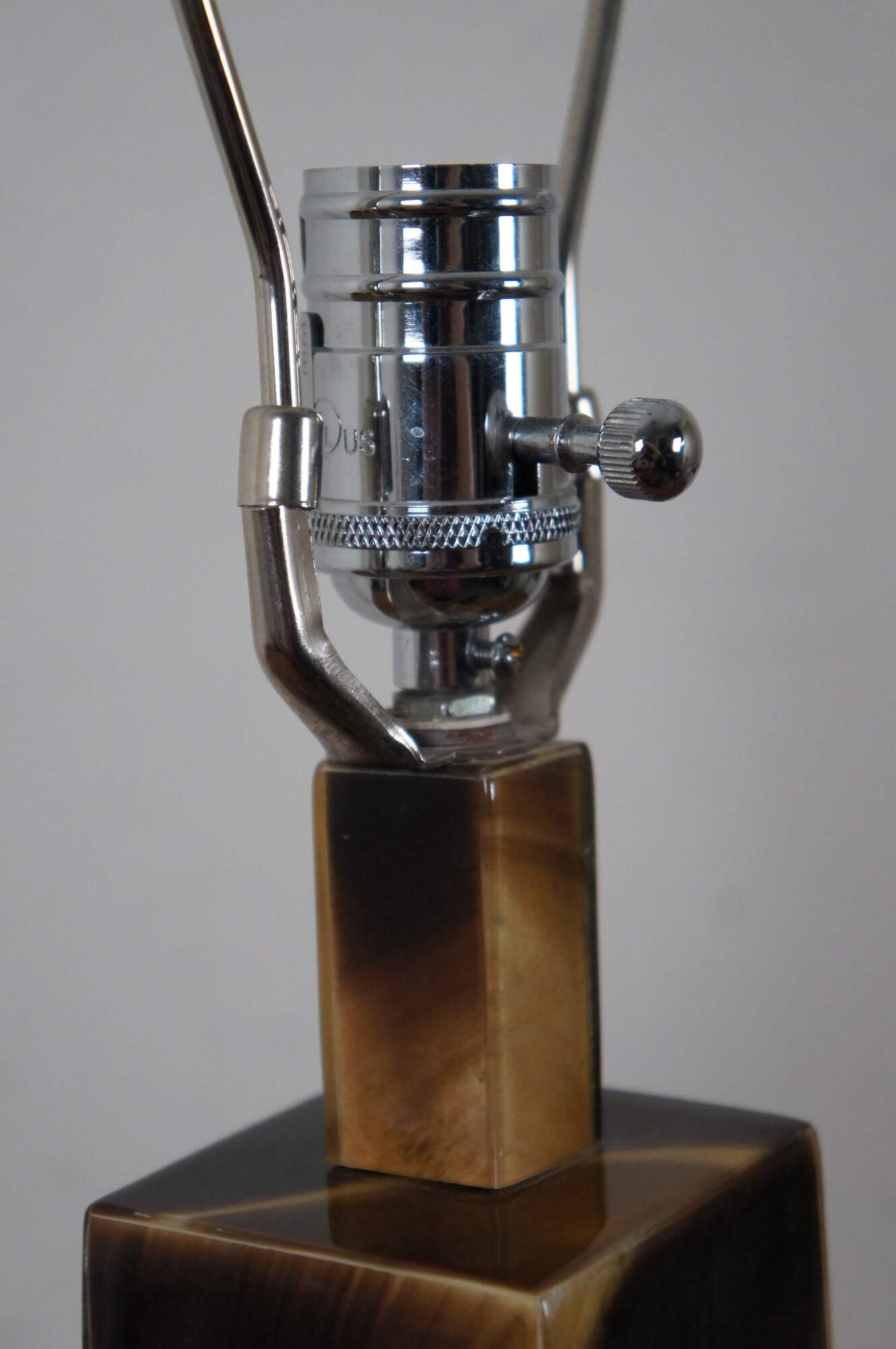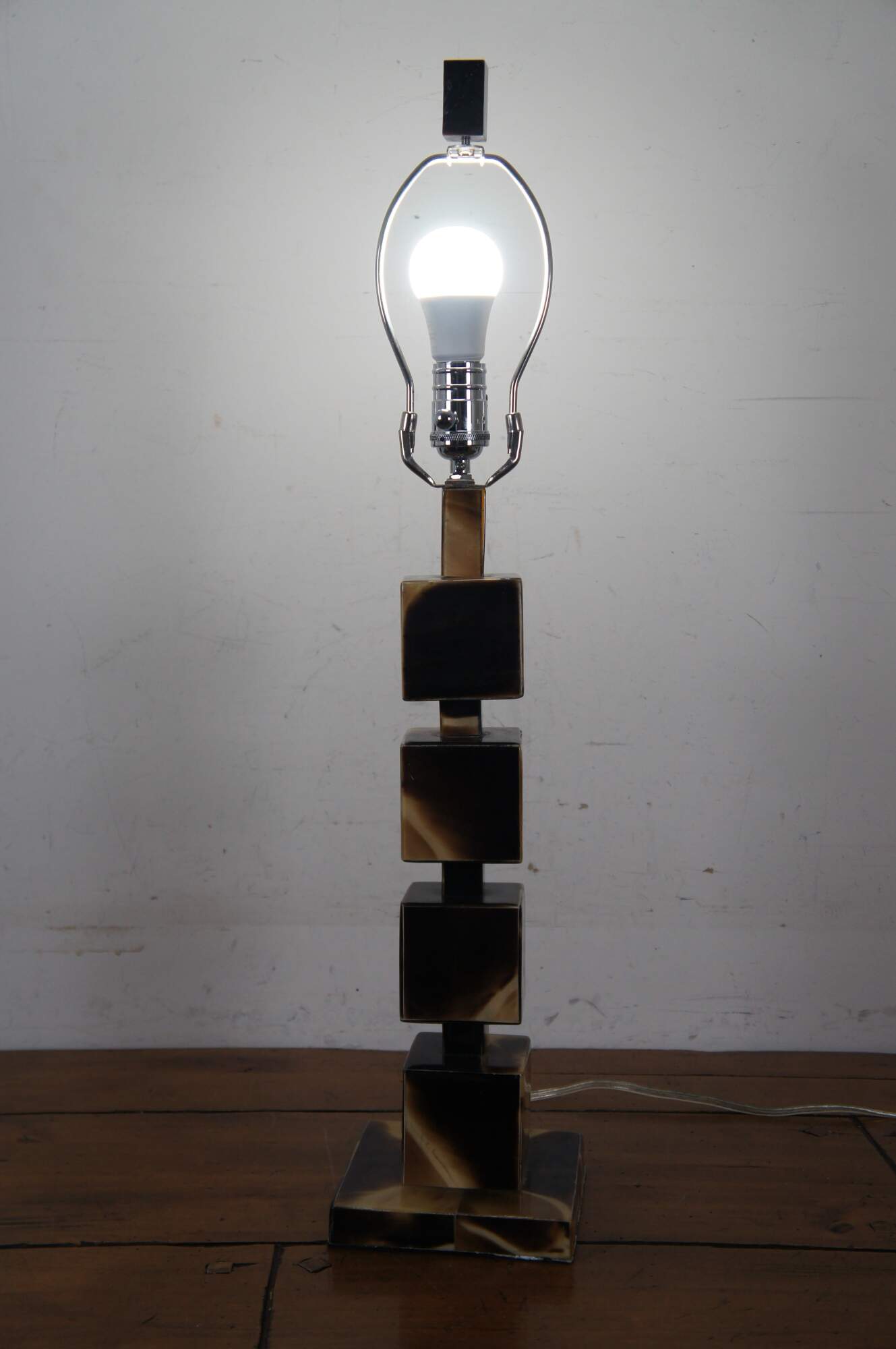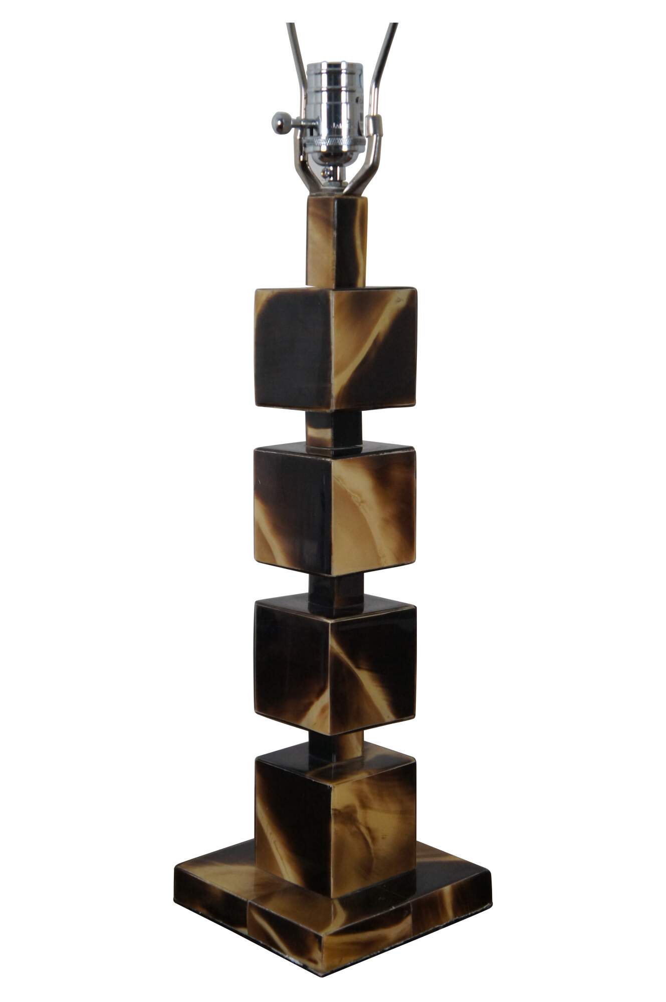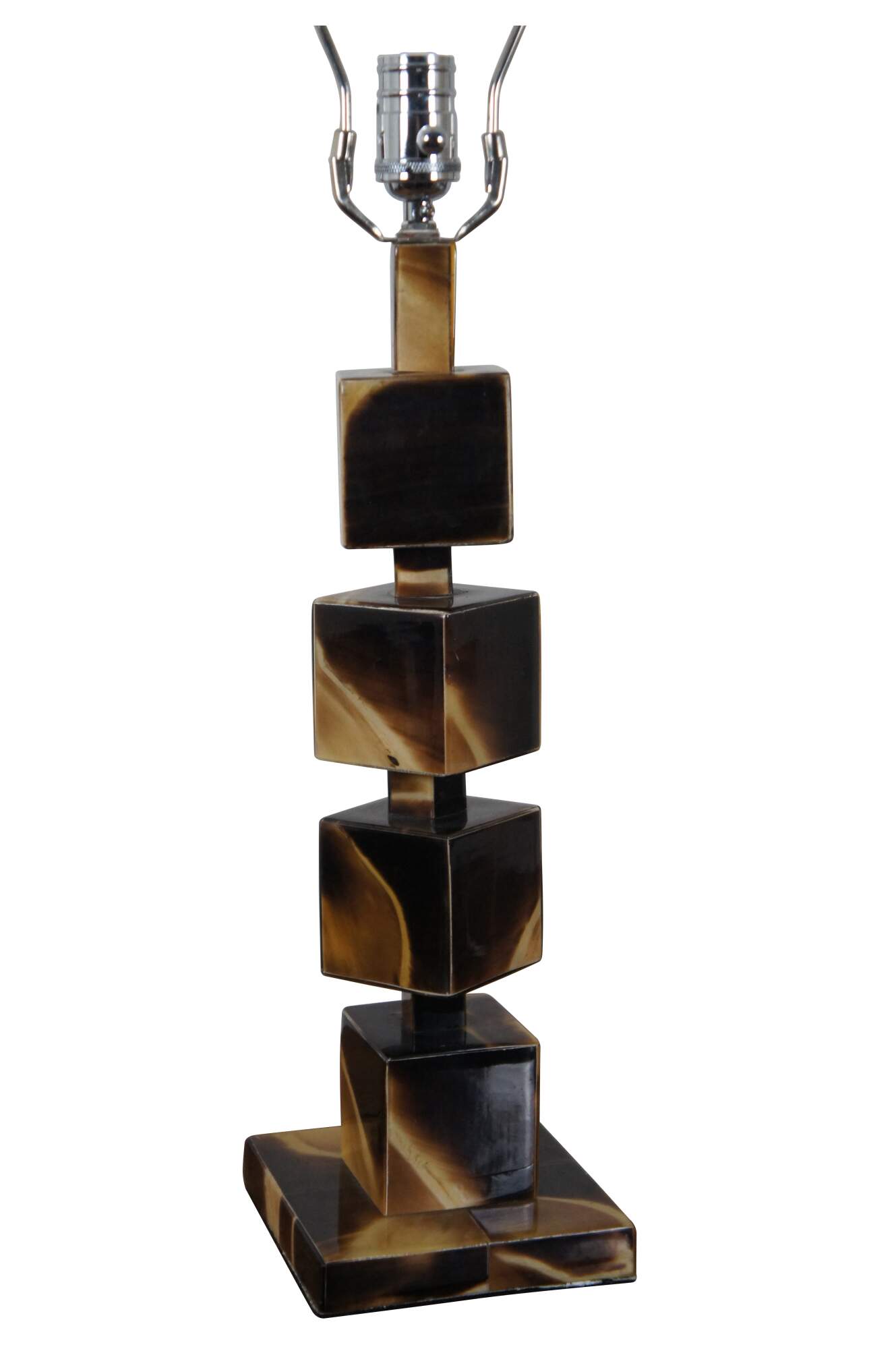 Vintage Jamie Young acrylic horn geometric table lamp featuring a stack of five cubes / blocks on a square base. Includes harp and rectangular black finial.