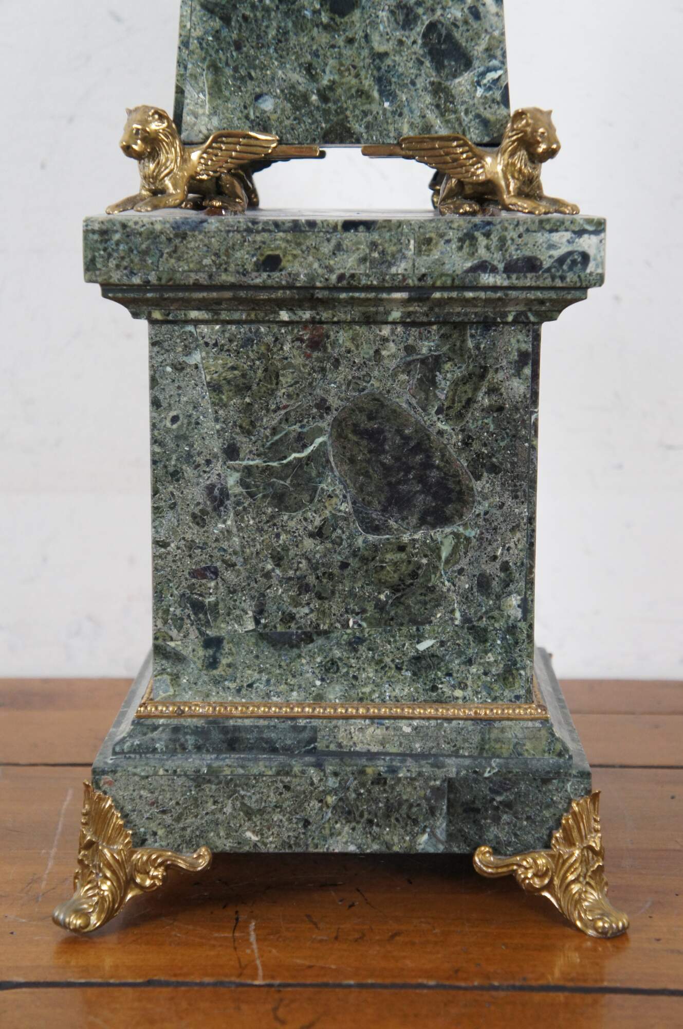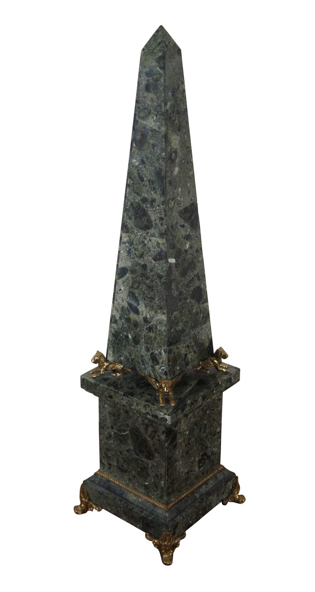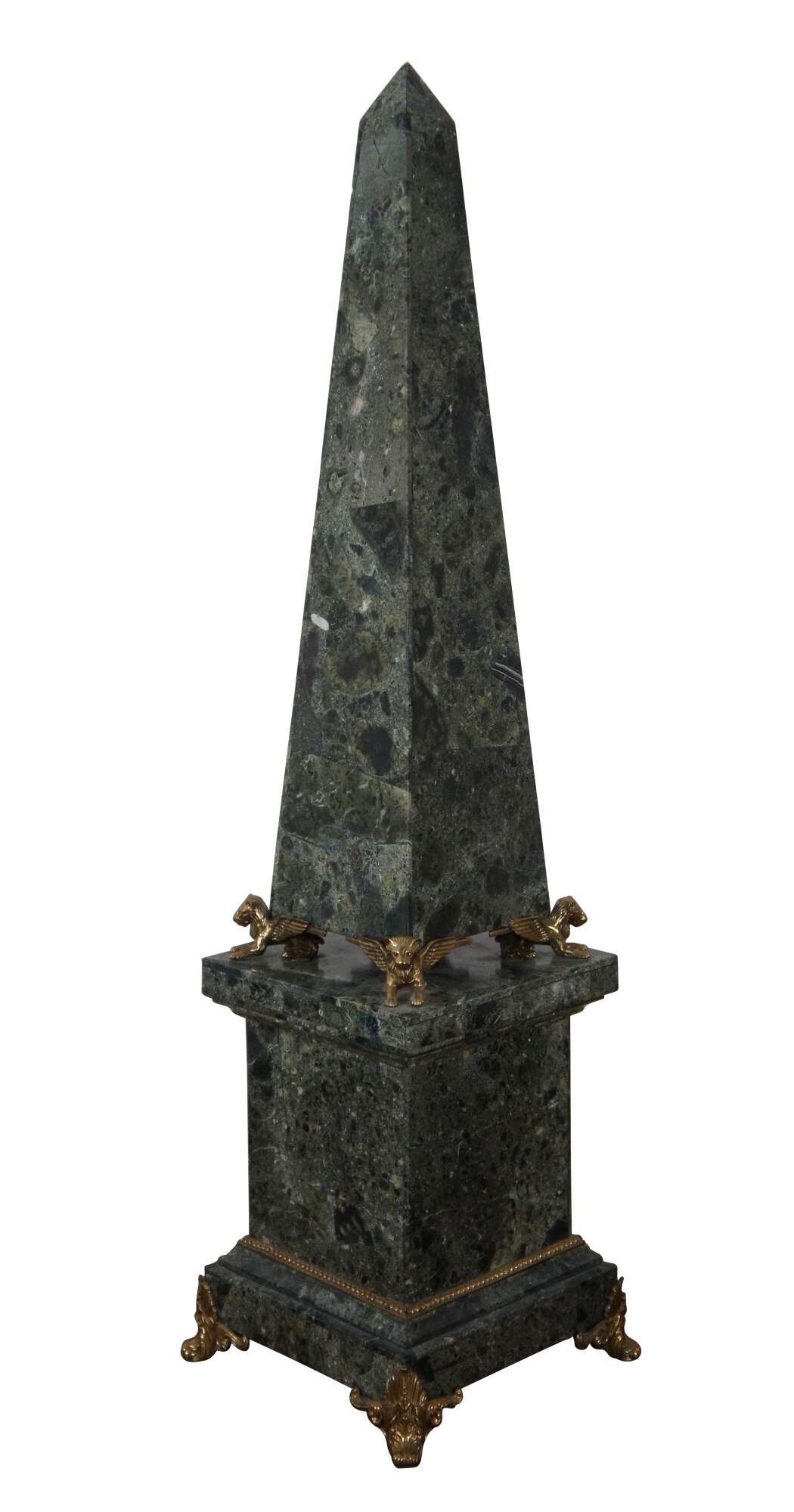 Large vintage Maitland Smith tessilated marble stone obelisk sculpture, standing on the backs of four brass winged lions, which in turn lay atop a square pedestal on scalloped brass feet. Marked 199 on base. Hand Made in the Philippines.