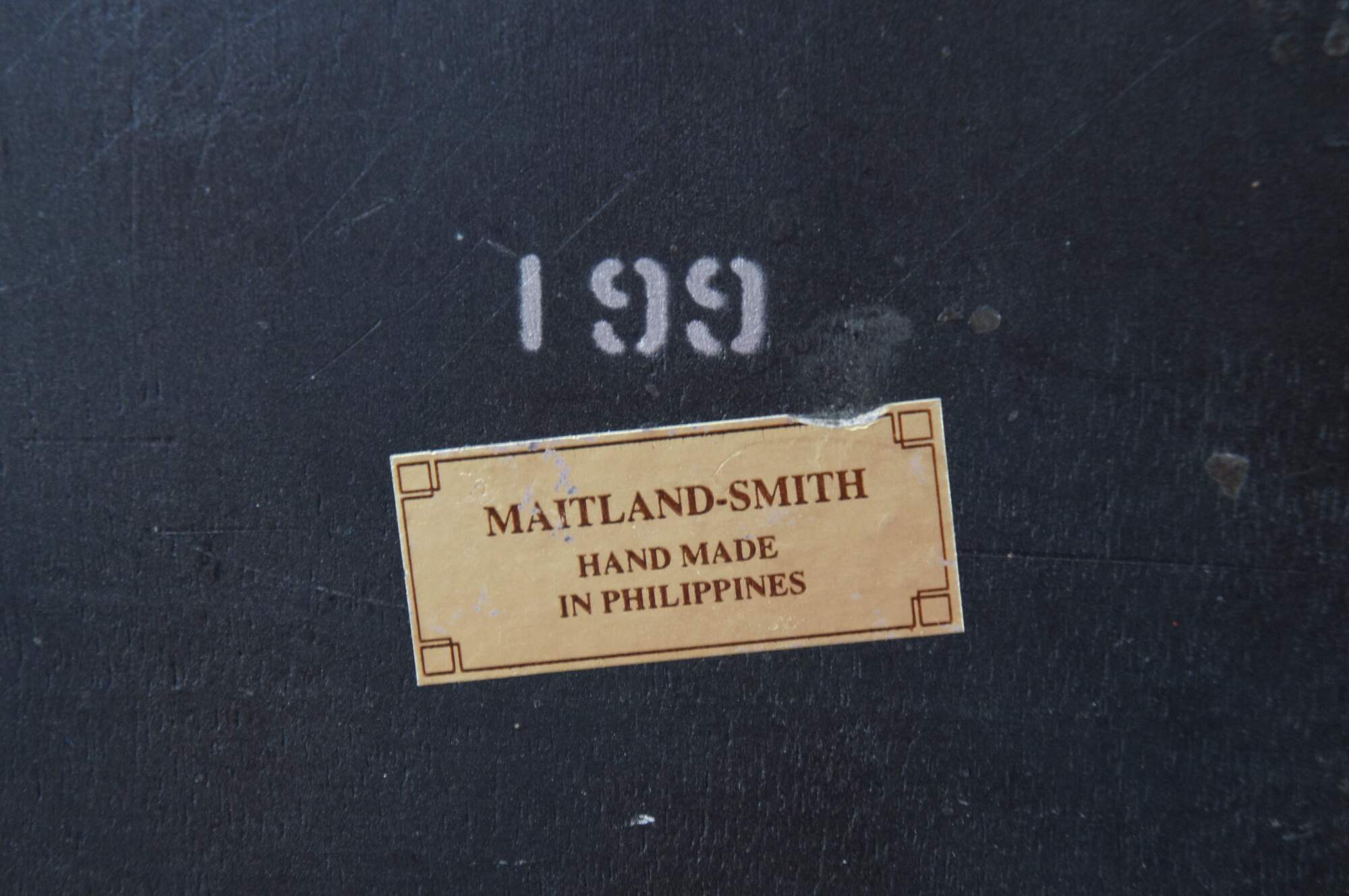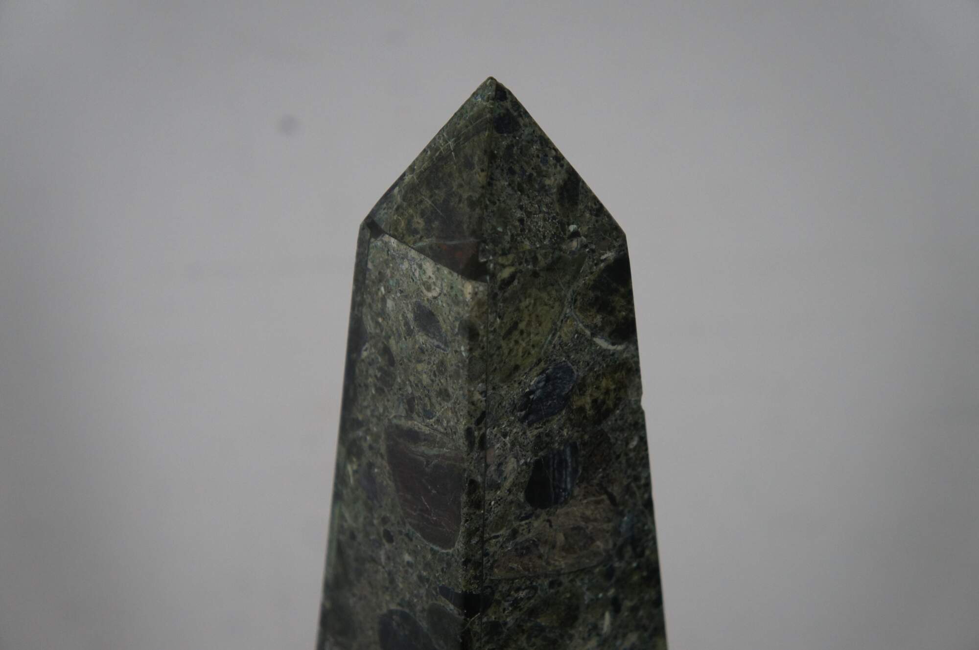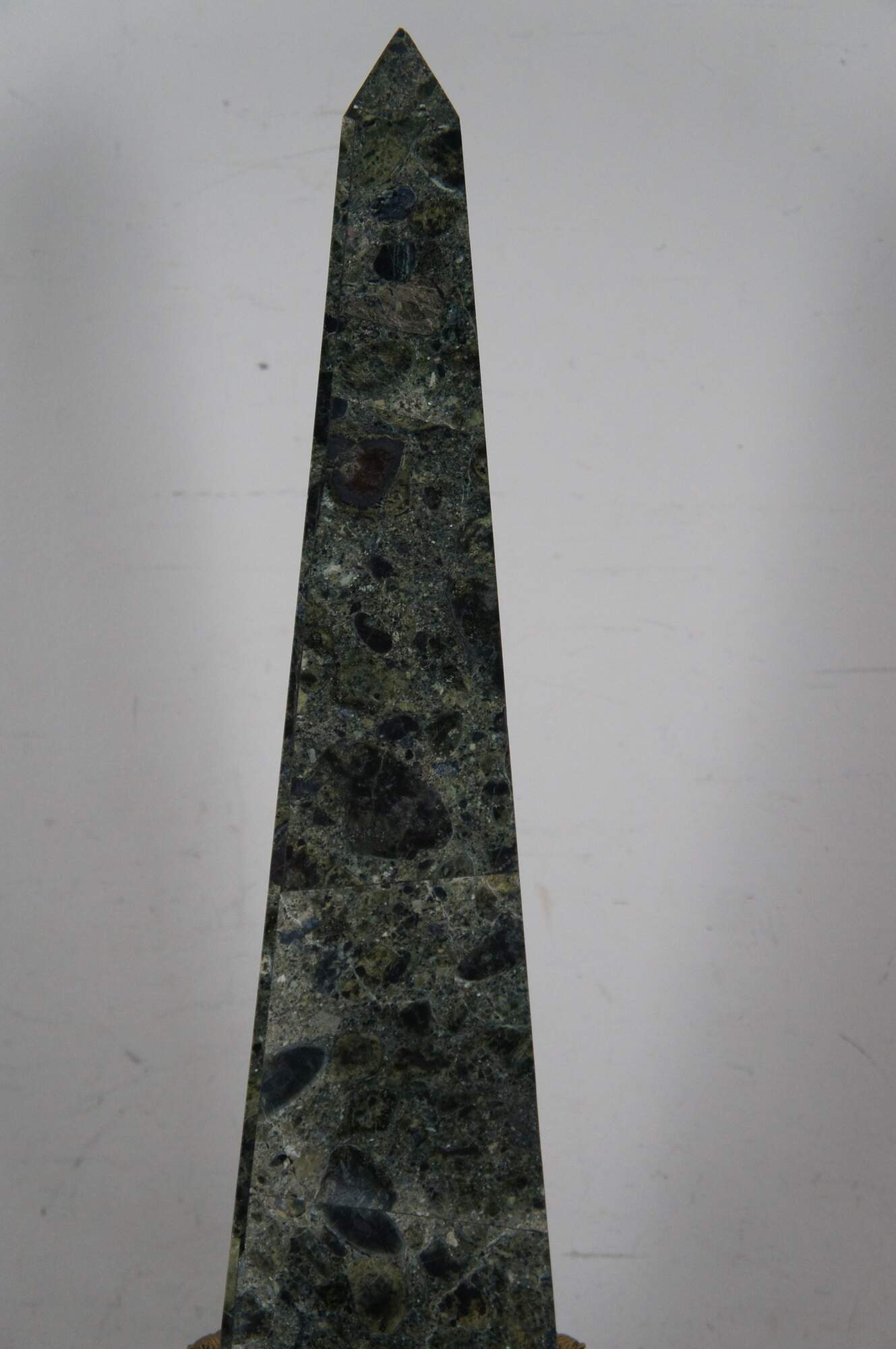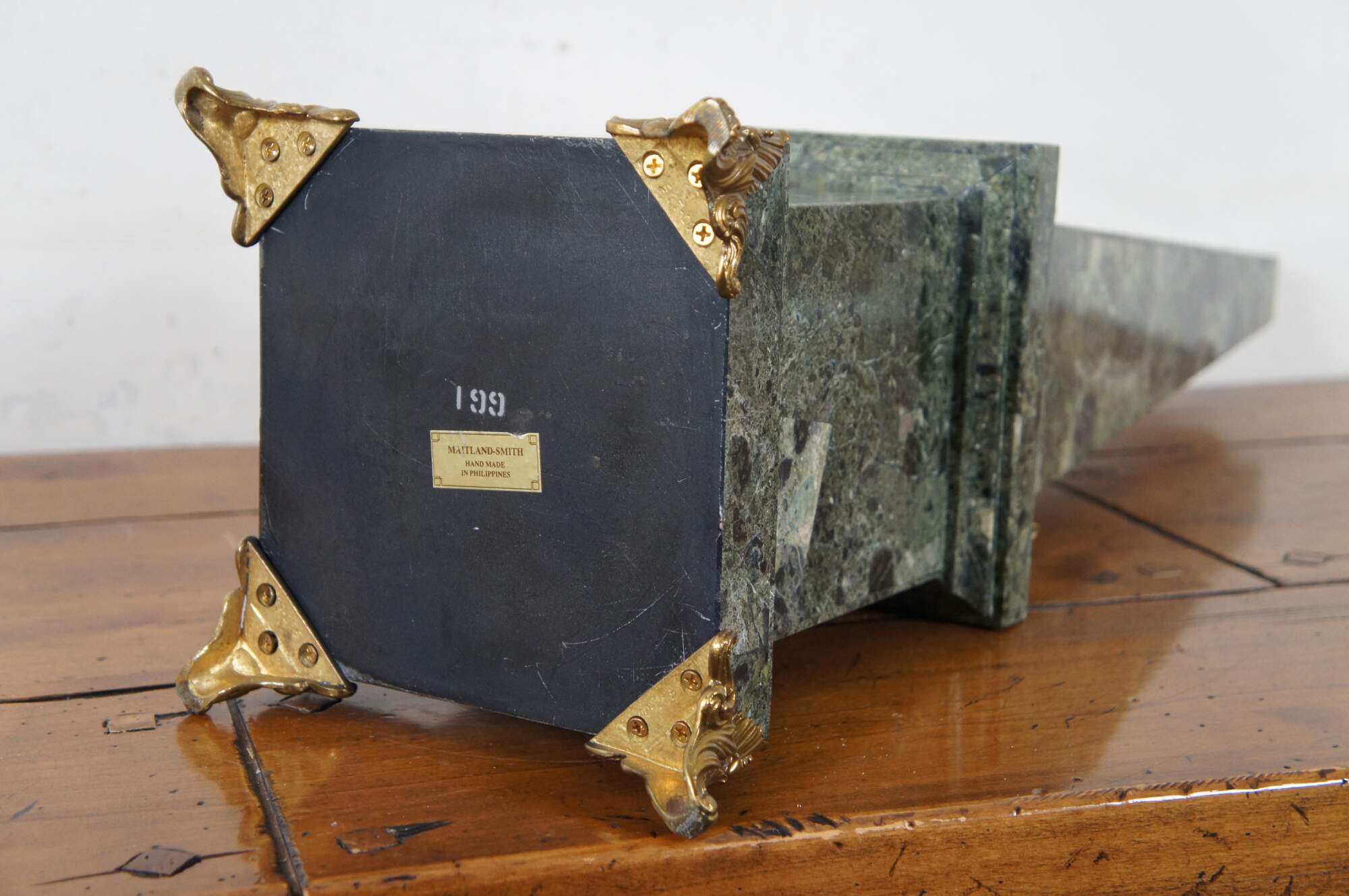 Large vintage Maitland Smith tessilated marble stone obelisk sculpture, standing on the backs of four brass winged lions, which in turn lay atop a square pedestal on scalloped brass feet. Marked 199 on base. Hand Made in the Philippines.