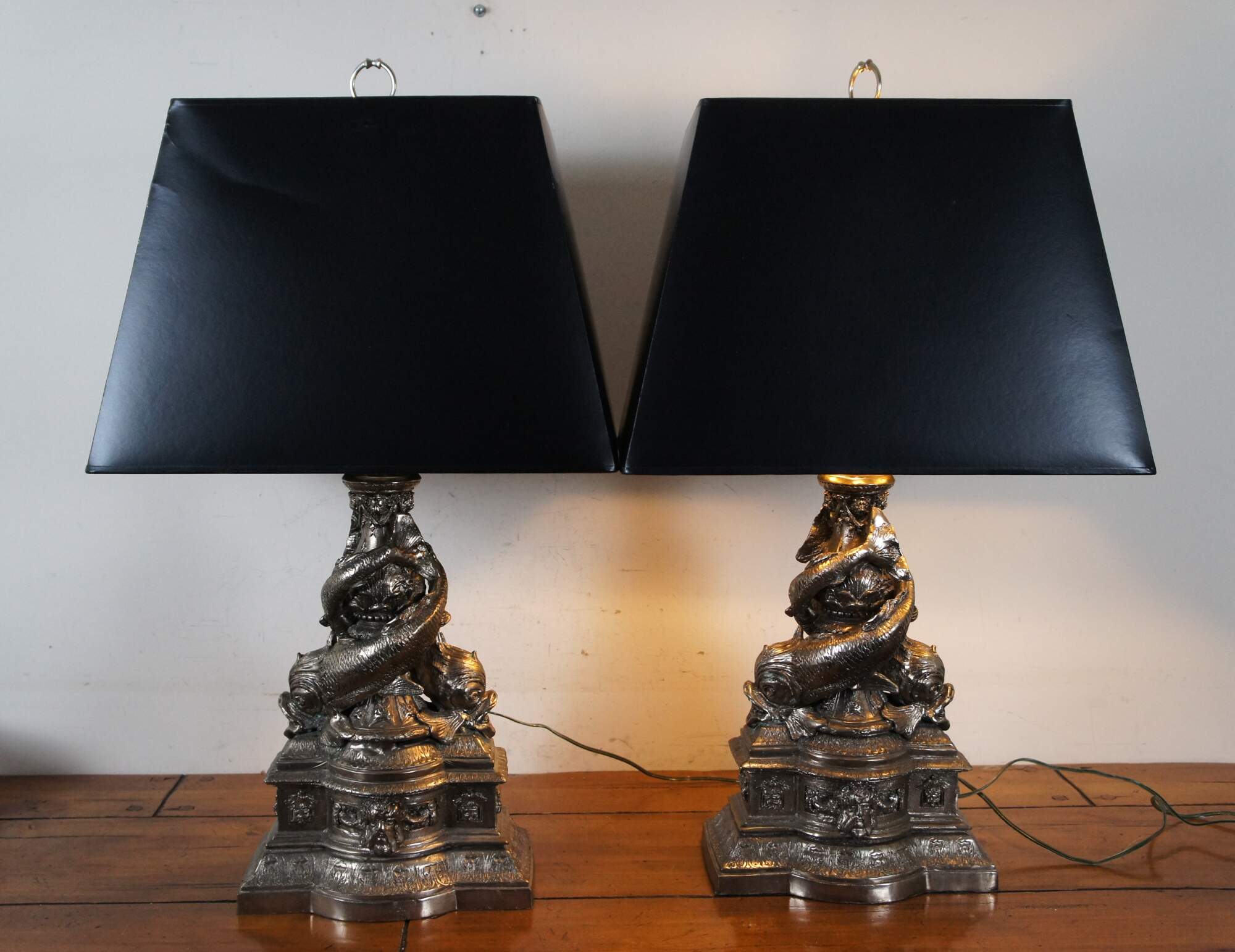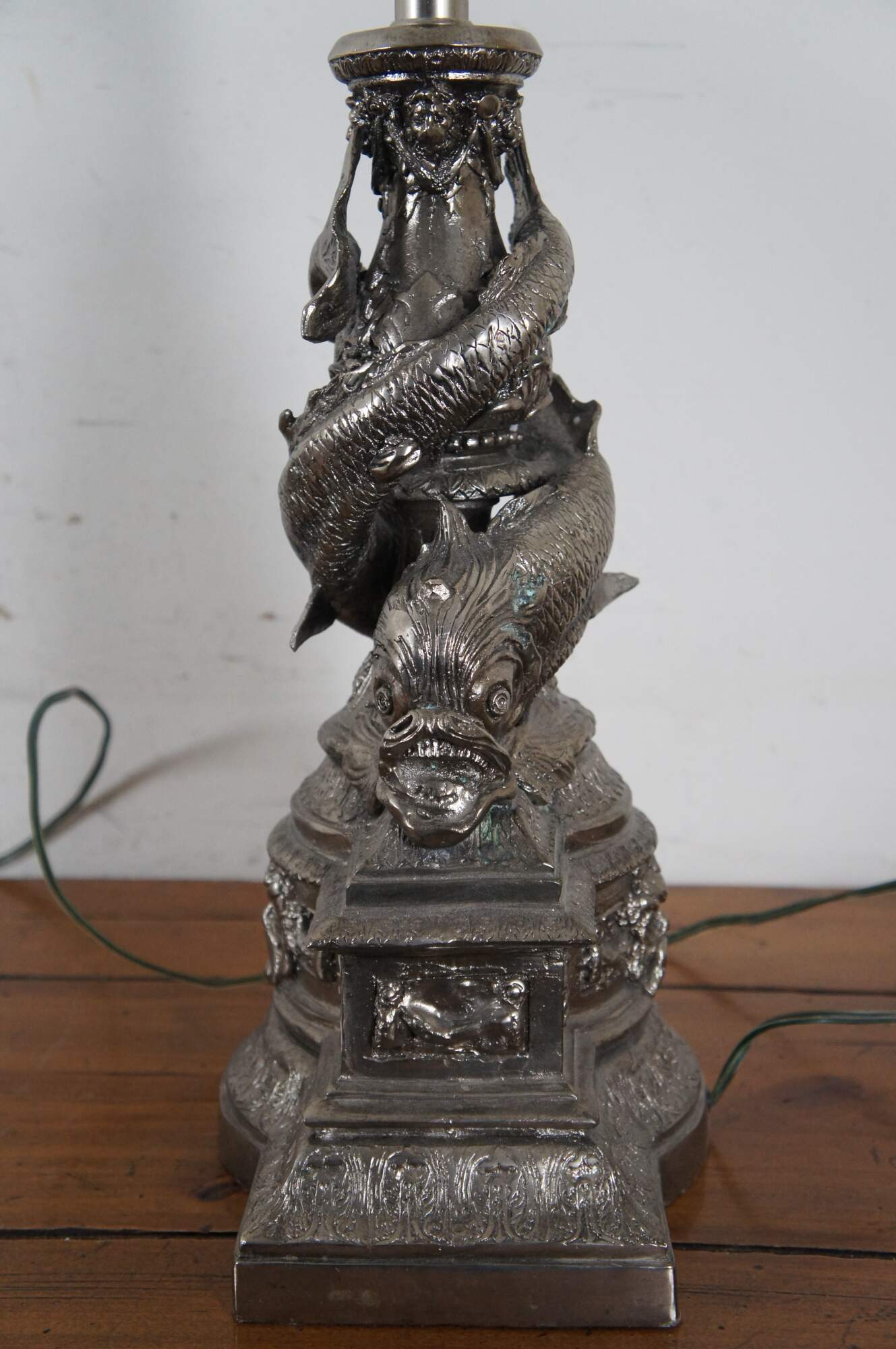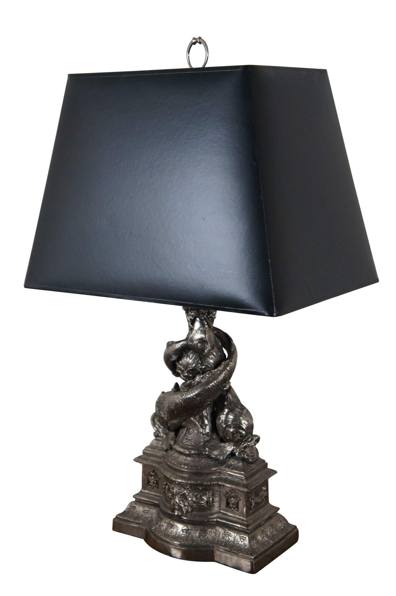 Rare vintage Maitland Smith table lamps, made of heavy cast metal with a bright silver finish, showing a Neoclassical style pedestal like the base of a fountain accented with the face of a bearded man with a cadeuceus at each corner, below a vase shaped pillar, around which twists a pair of fish / delphins / dolphins. Includes rectangular black shades with foiled interiors and ring shaped finials.