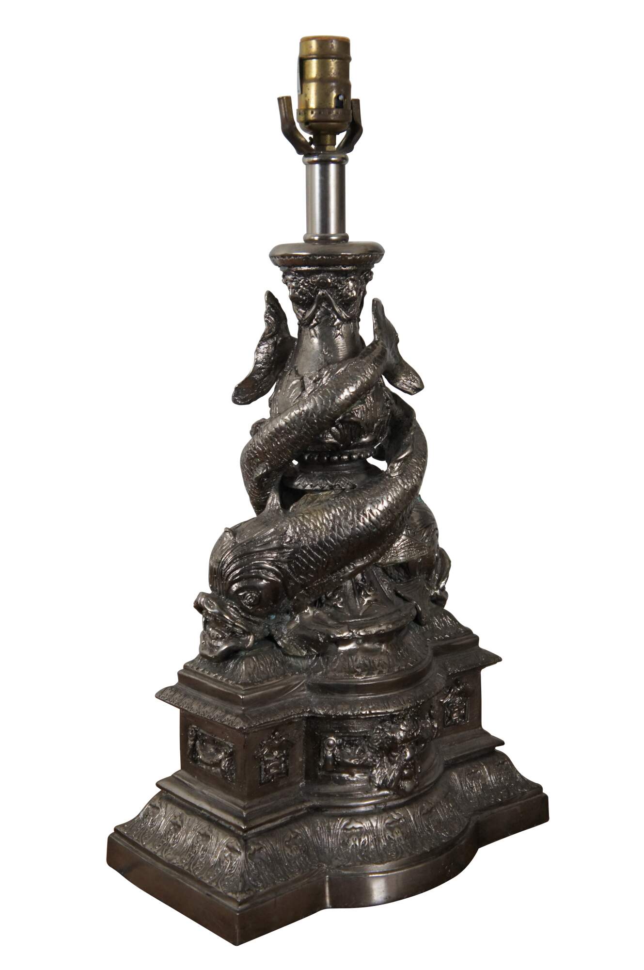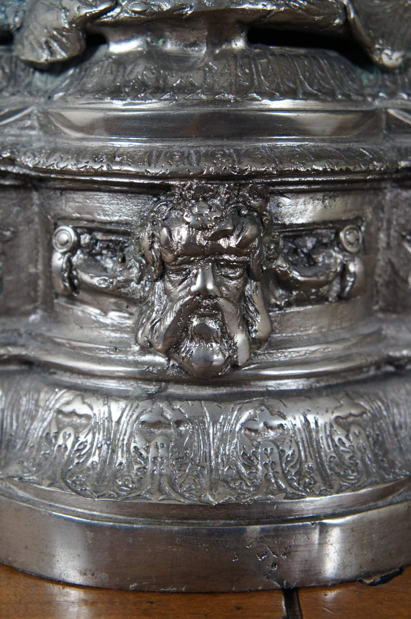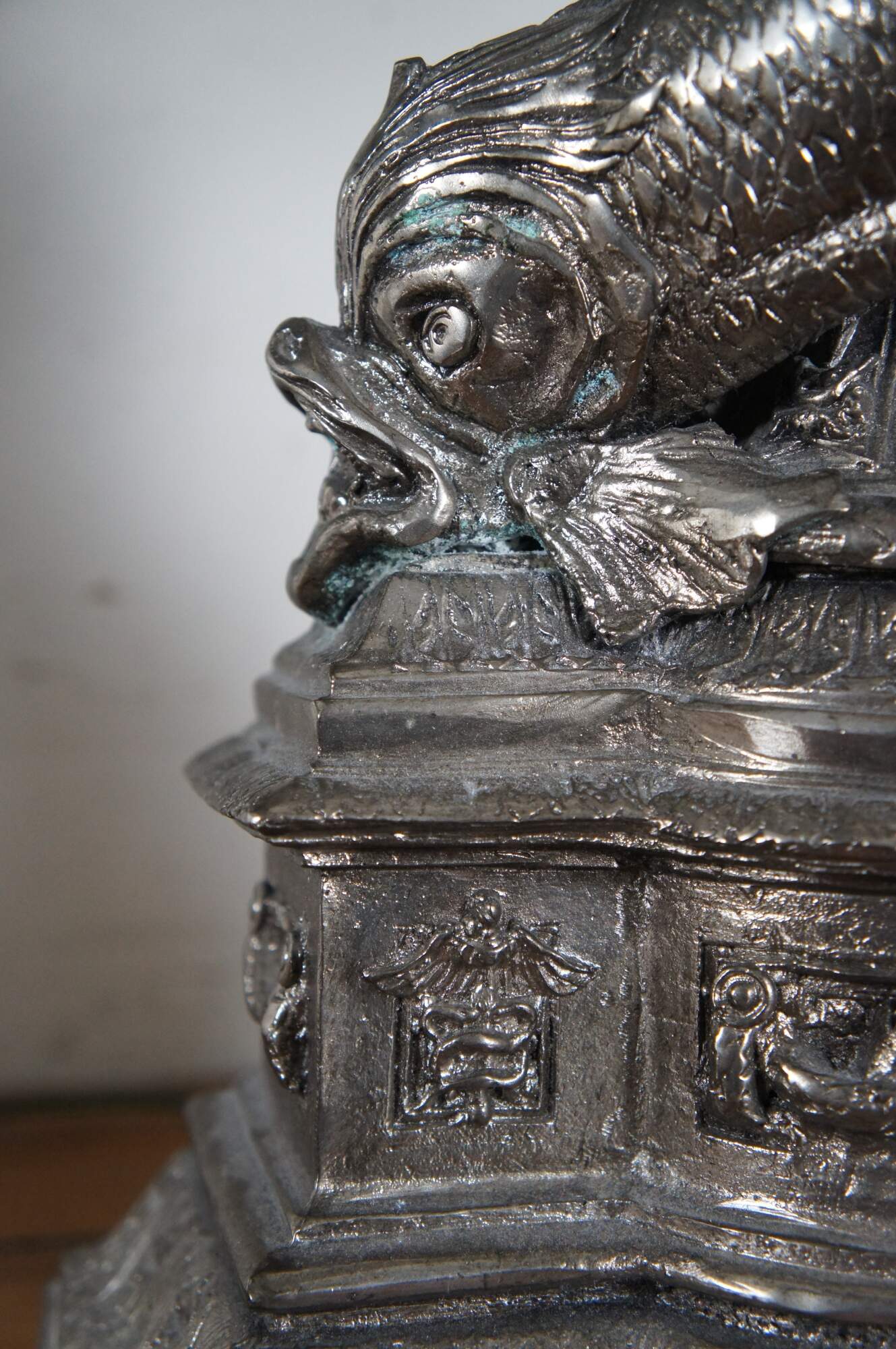 Rare vintage Maitland Smith table lamps, made of heavy cast metal with a bright silver finish, showing a Neoclassical style pedestal like the base of a fountain accented with the face of a bearded man with a cadeuceus at each corner, below a vase shaped pillar, around which twists a pair of fish / delphins / dolphins. Includes rectangular black shades with foiled interiors and ring shaped finials.