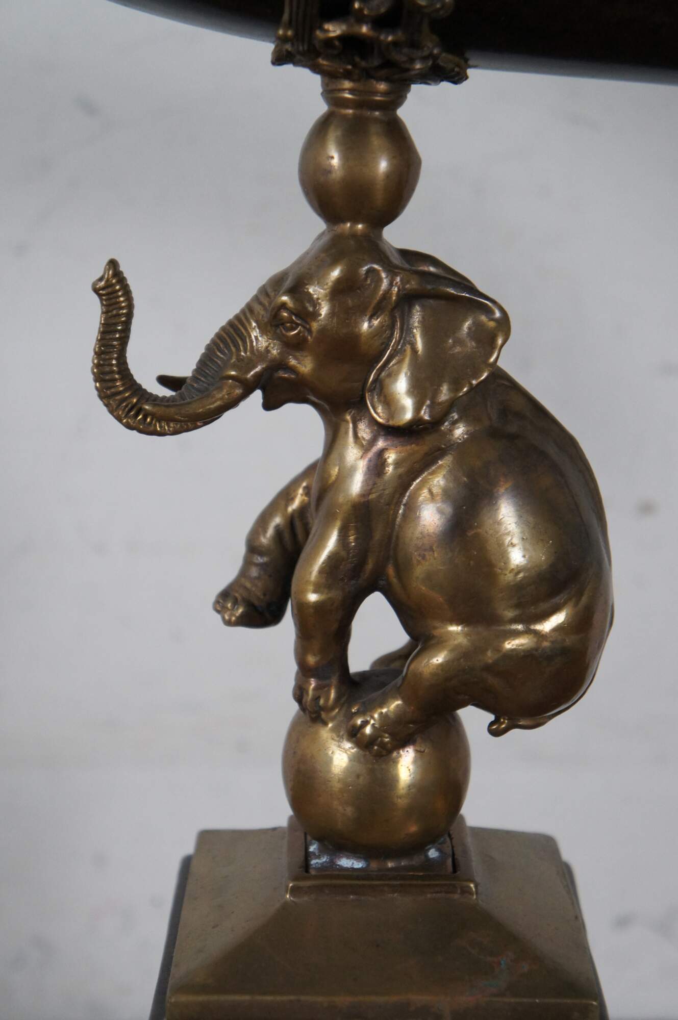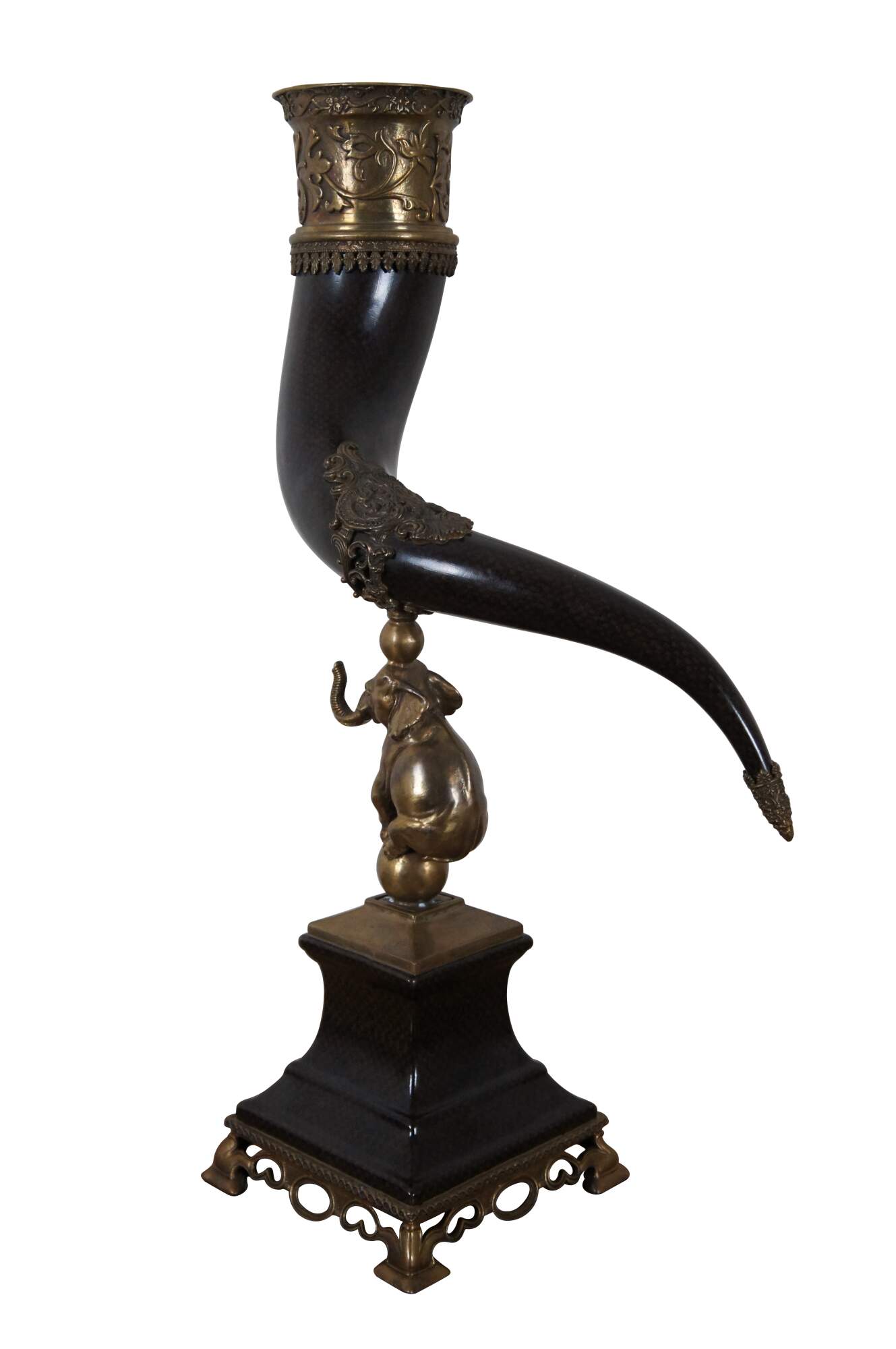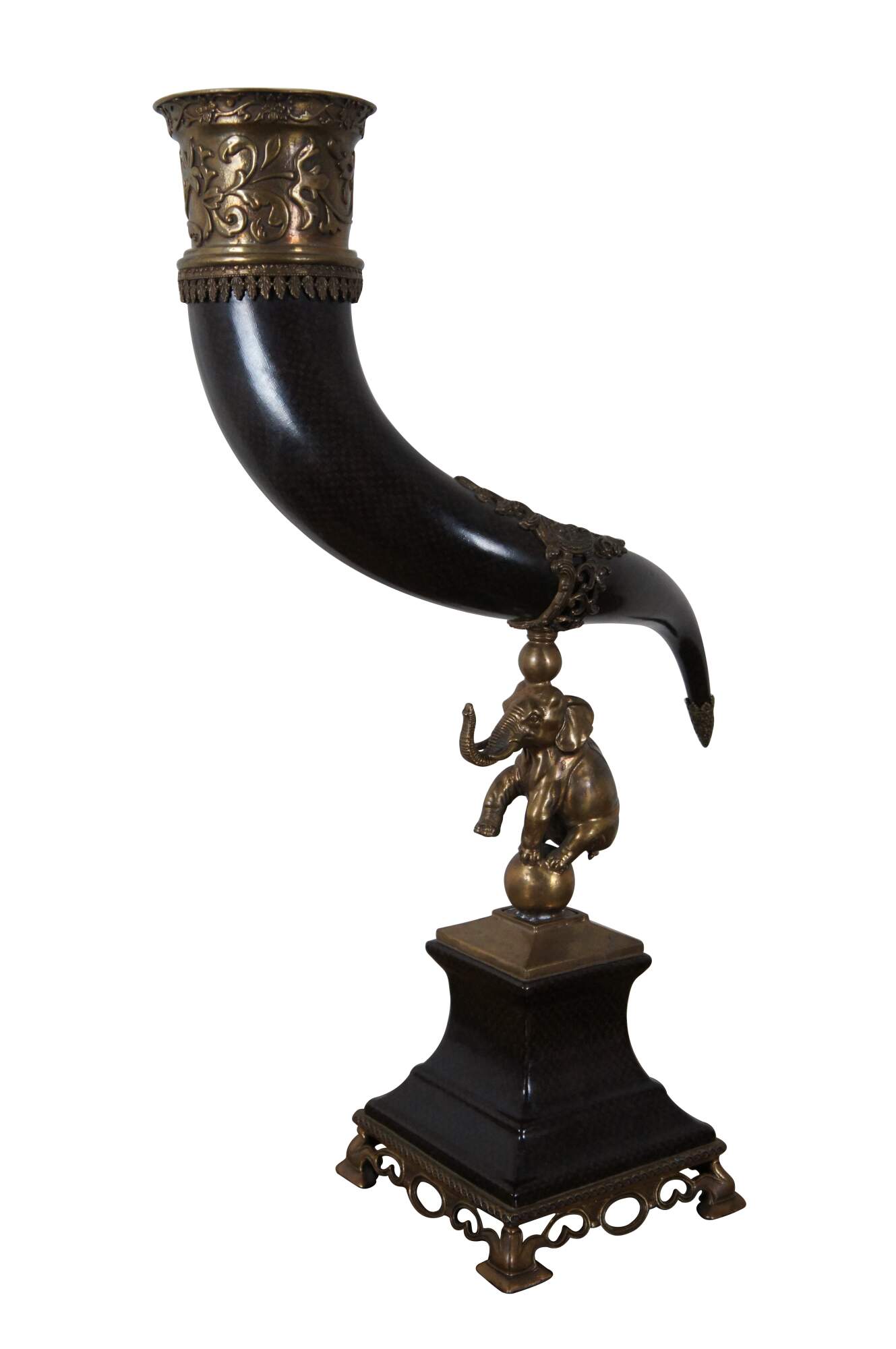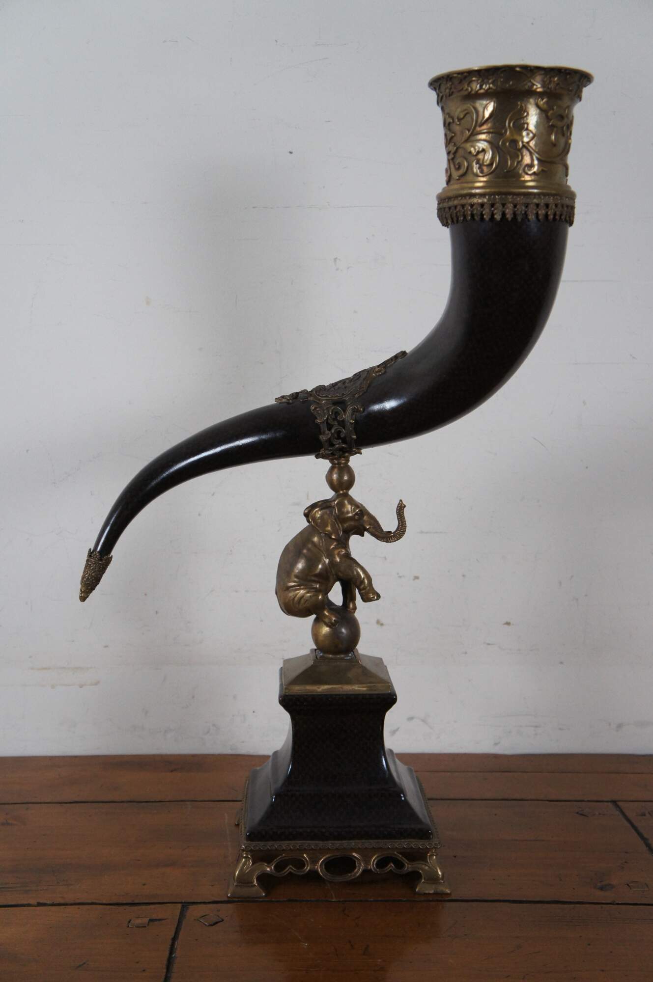 Ornamental hunt theme drinking horn / centerpiece trophy / cornucopia epergne / flower vase featuring a tapered pedestal base with brass capped feet and circus Elephant balancing a porcelain horn or tusk. Stamped on base, Item No. 4052-C4A. Castilian Imports, India.