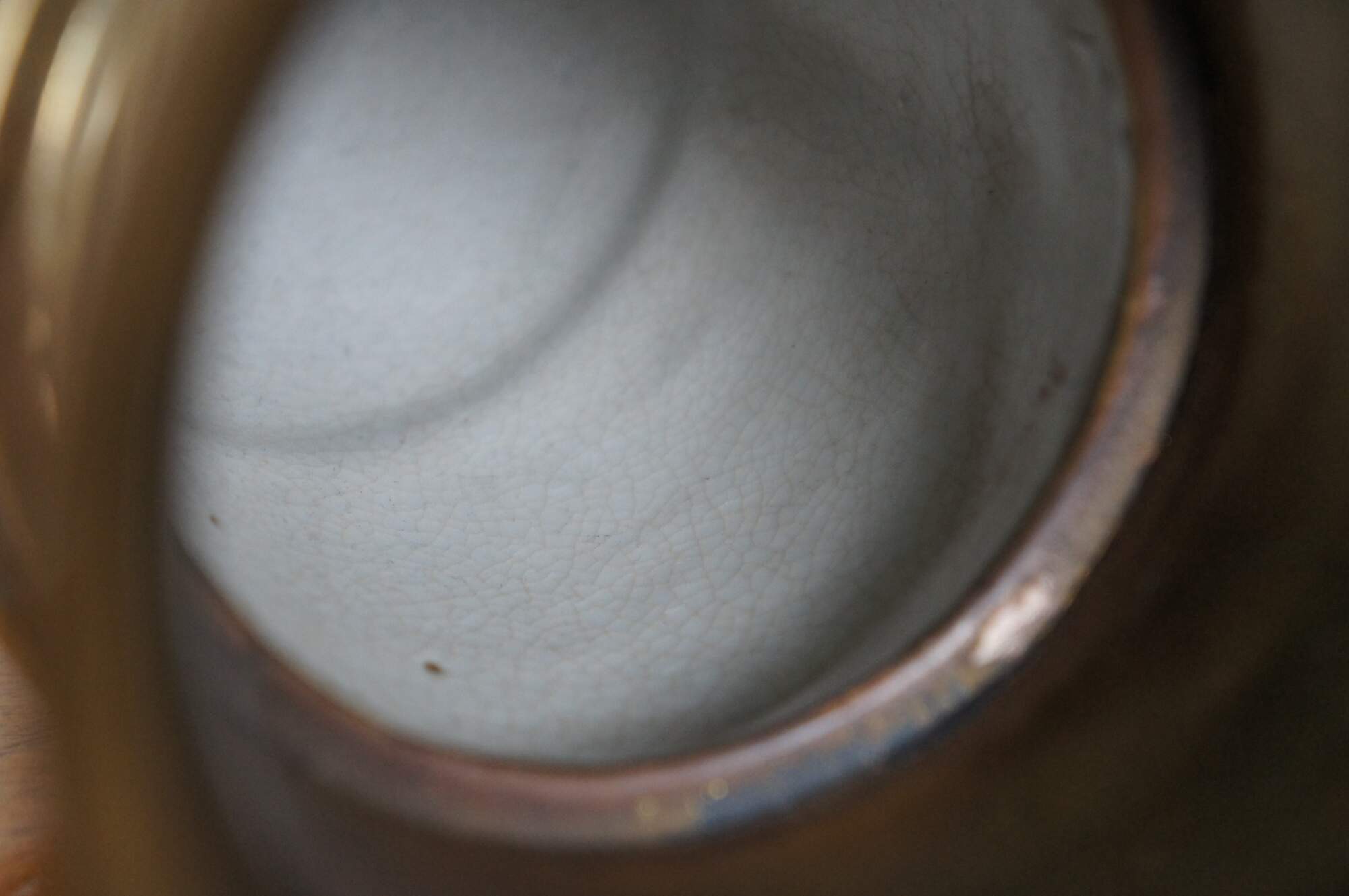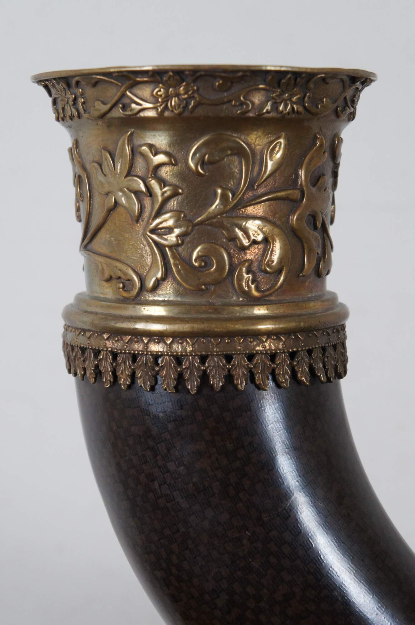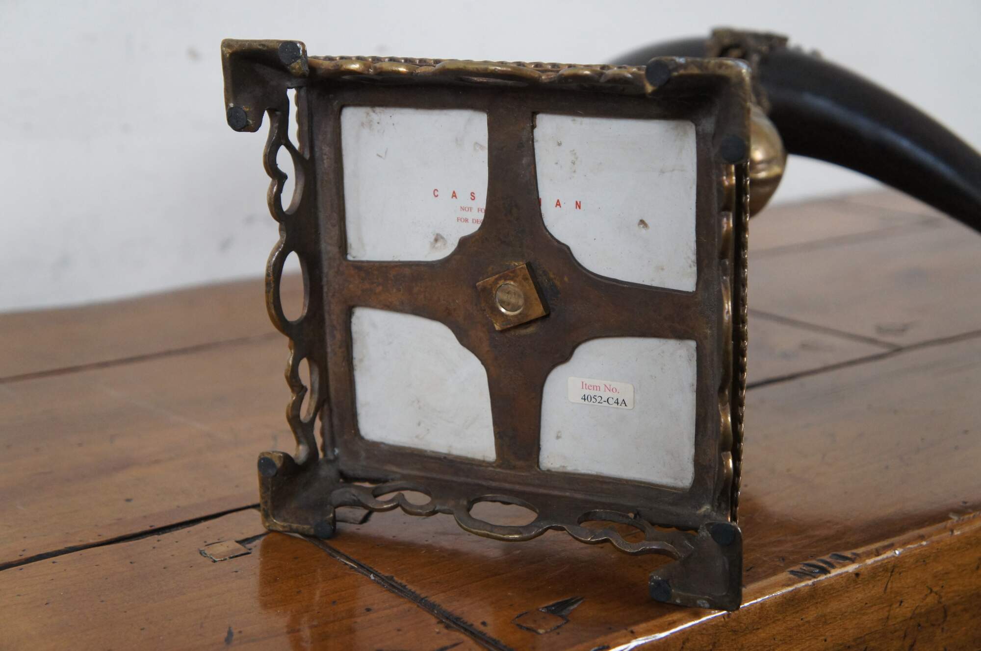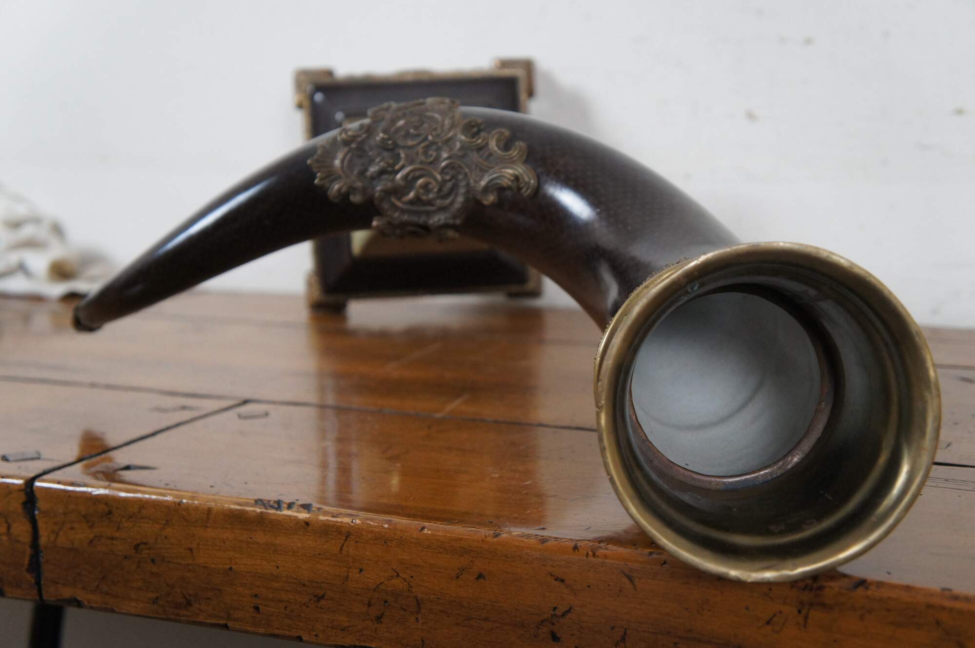 Ornamental hunt theme drinking horn / centerpiece trophy / cornucopia epergne / flower vase featuring a tapered pedestal base with brass capped feet and circus Elephant balancing a porcelain horn or tusk. Stamped on base, Item No. 4052-C4A. Castilian Imports, India.