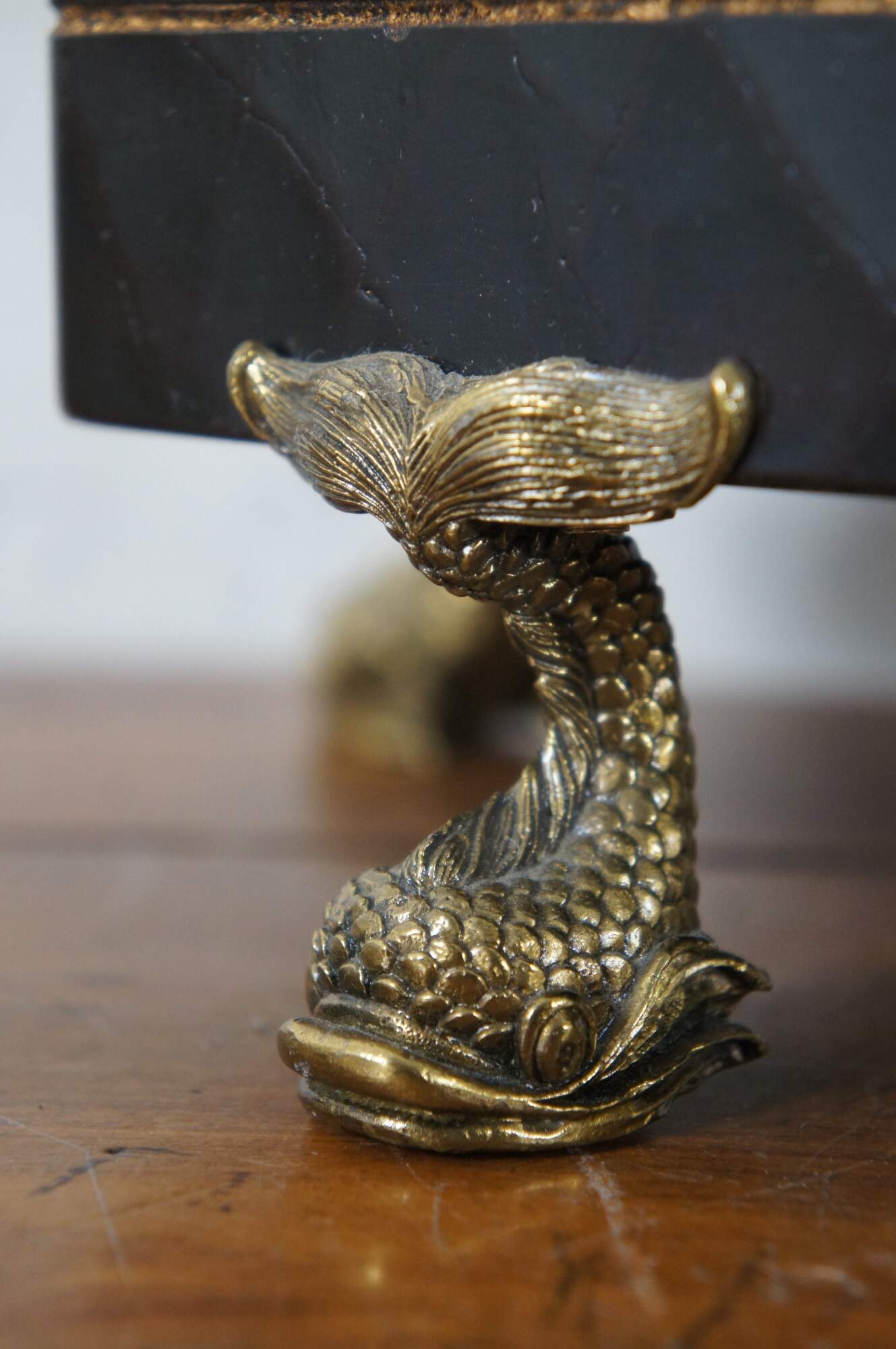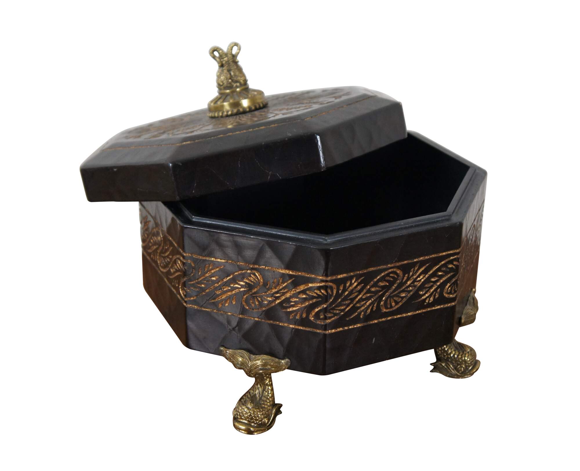 Vintage octagonal keepsake box, finished in black lacquer with engraved foliate designs painted with gold, supported by four gold / brass delphin / dolphin / fish shaped feet, and a matching double delphin finial on the lid.
