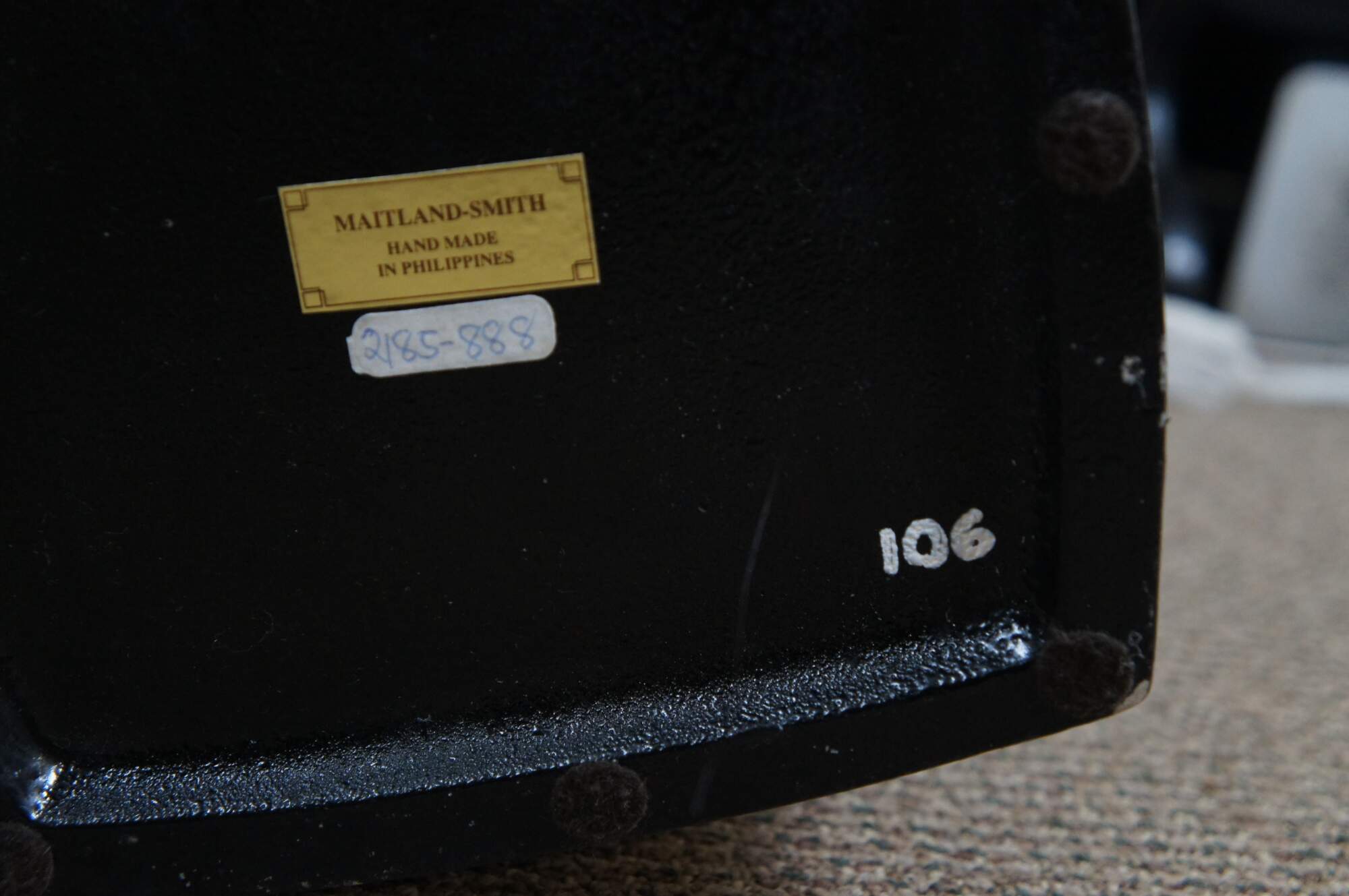 Late 20th century Maitland Smith floor vase featuring a traditional chinese famille form squared off vase shape and faux scallop shell knocker with ring handles, painted in copper. Made of porcelain / ceramic with a lacquered / enameled surface in black, cream and copper resembling marble. Marked on base with number 106. Hand written sticker marked 2185-888. Hand Made in the Philippines.