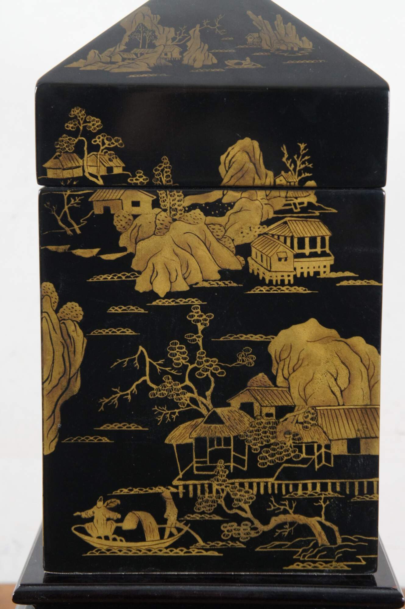 Late 20th century black lacquer box with a rectangular body and pyramid shaped lid topped with a golden pineapple finial. Painted in gold with Asian water / landscapes with boats, pagodas, and figures. Paired with a black lacquer stand.