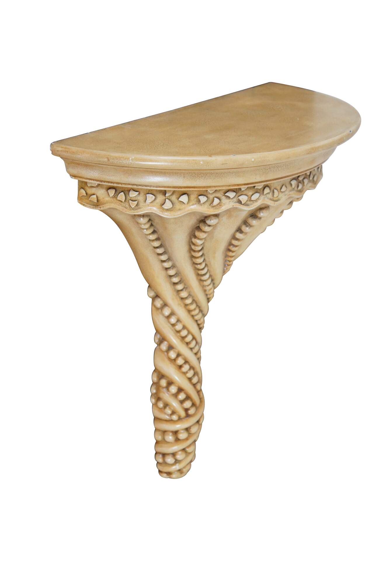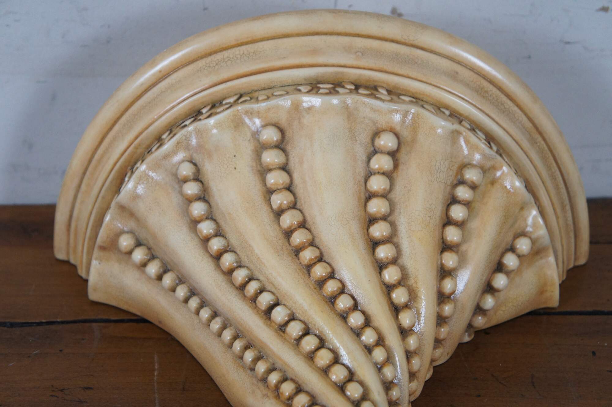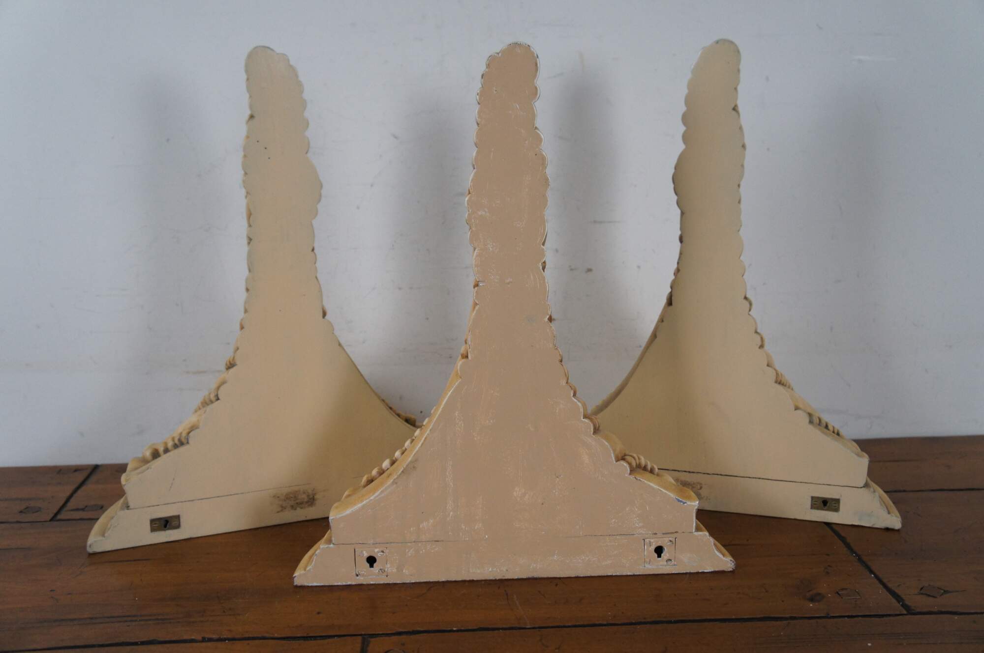 Set of three vintage wall sconce shelves featuring a Coastal Boho or Neoclassical inspired design, with semi circular tops and tapered / pointed bases ringed with swirling strings of beads. Off-white in color, factory distressed to resemble antique stone or plaster. Supported by two brackets on the back upper edge.