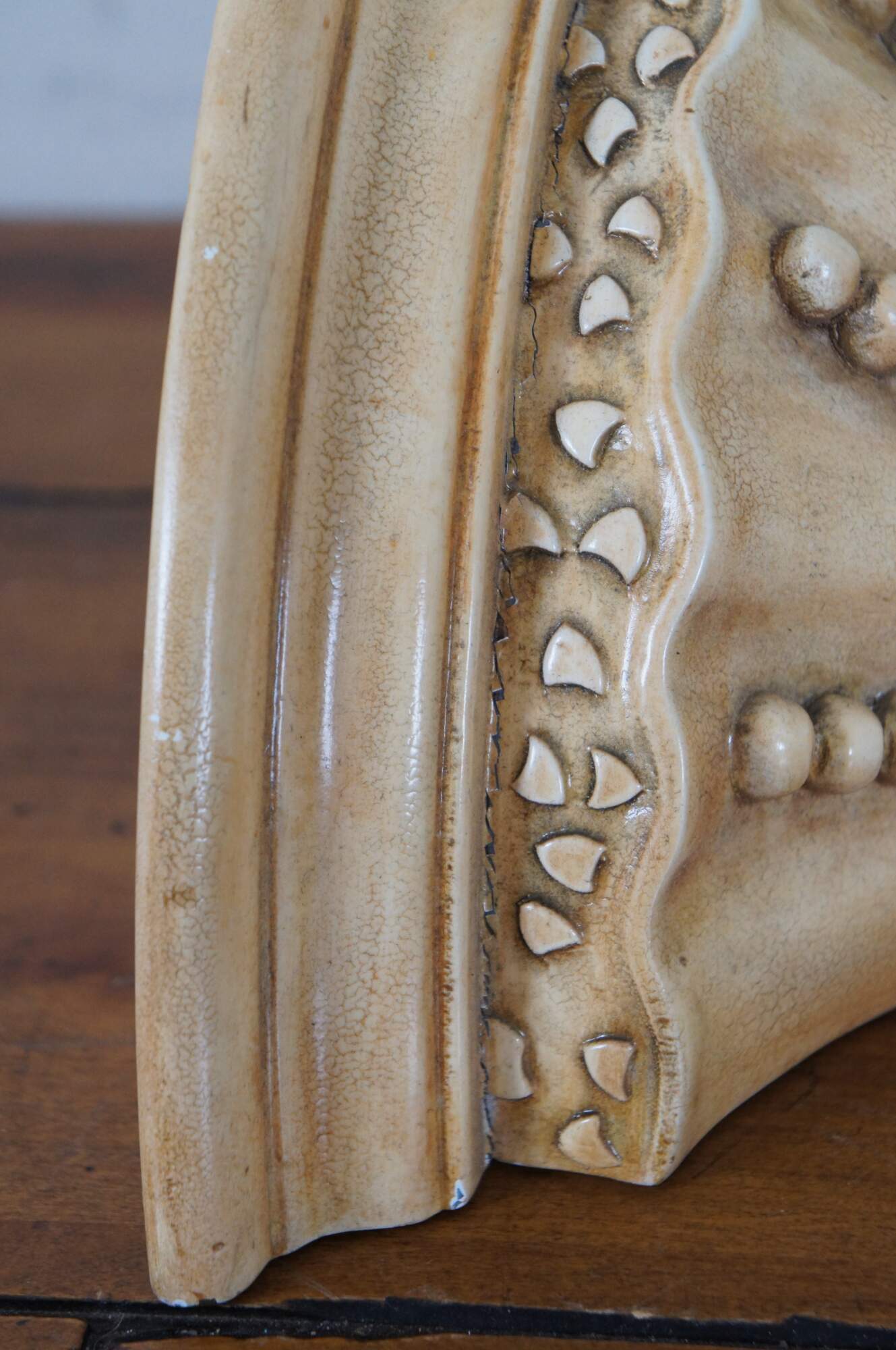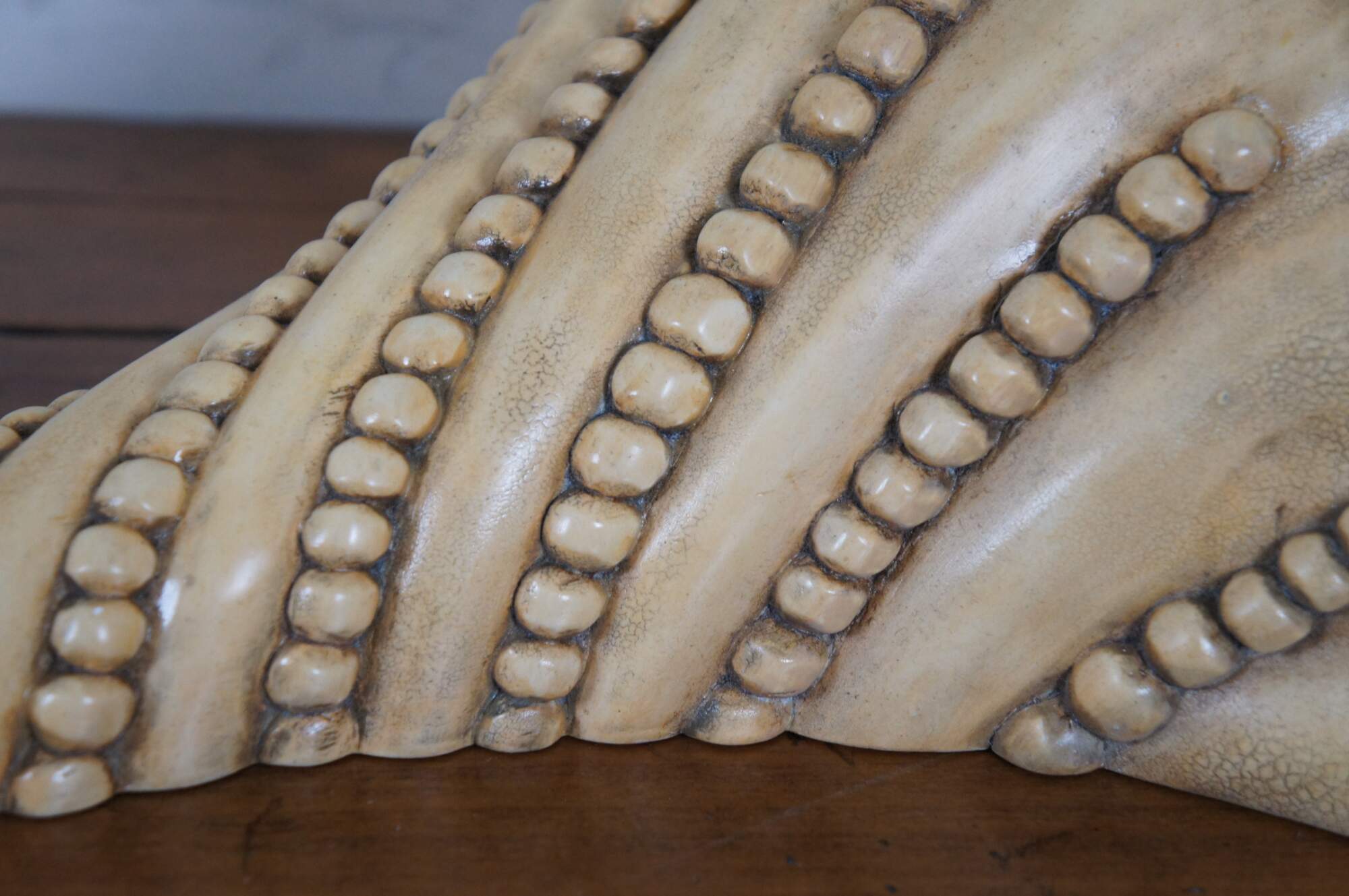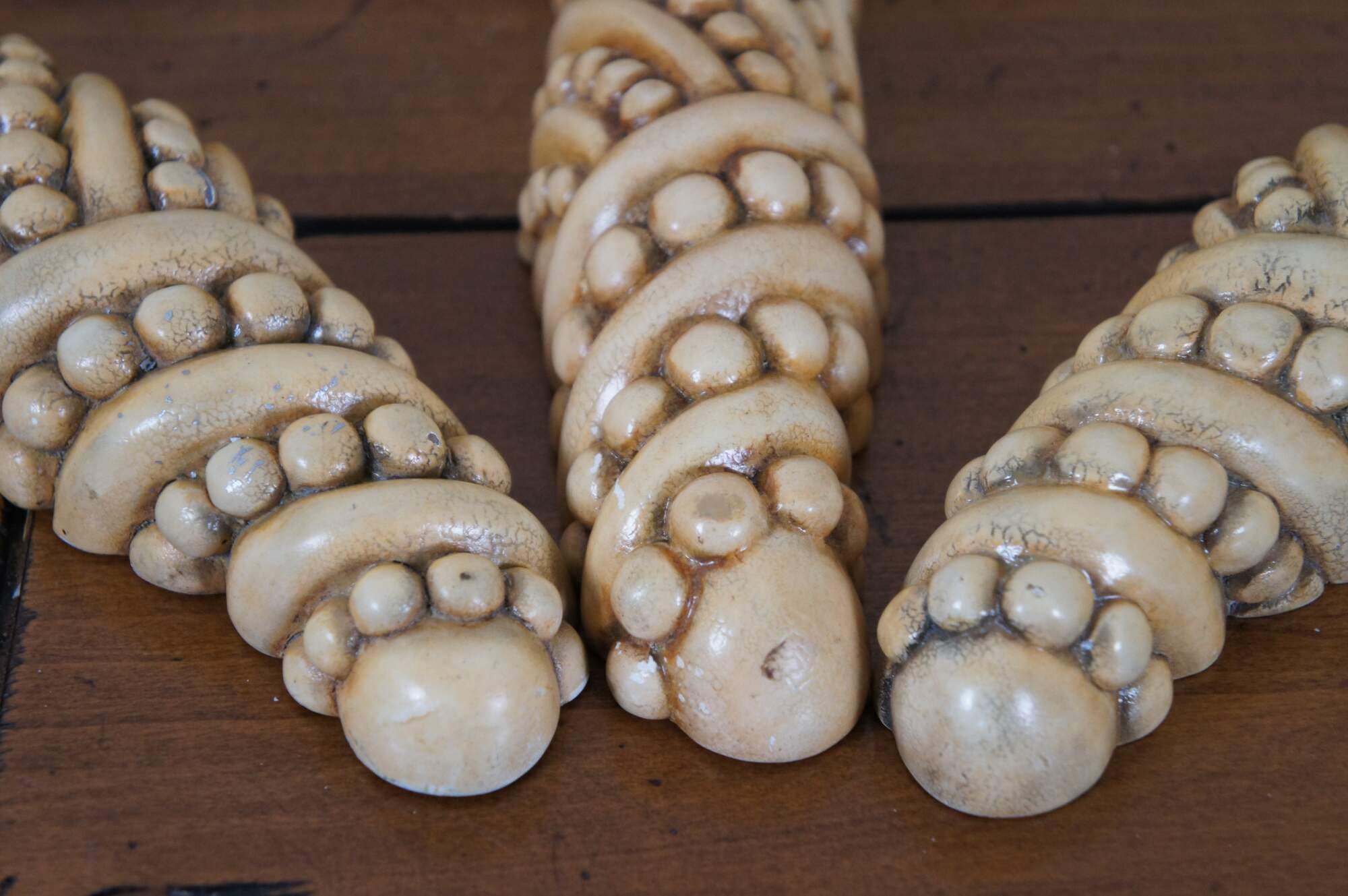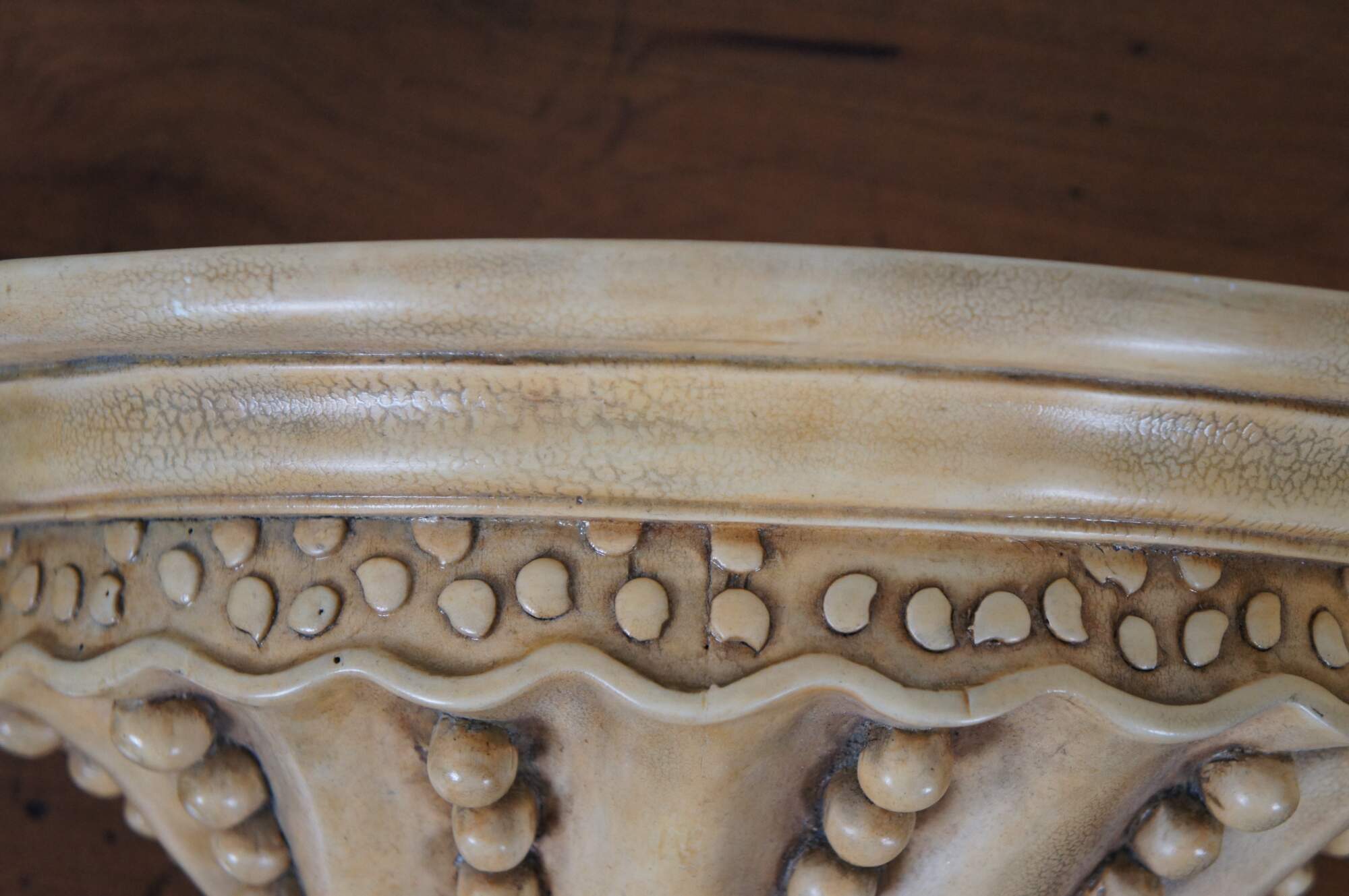 Set of three vintage wall sconce shelves featuring a Coastal Boho or Neoclassical inspired design, with semi circular tops and tapered / pointed bases ringed with swirling strings of beads. Off-white in color, factory distressed to resemble antique stone or plaster. Supported by two brackets on the back upper edge.