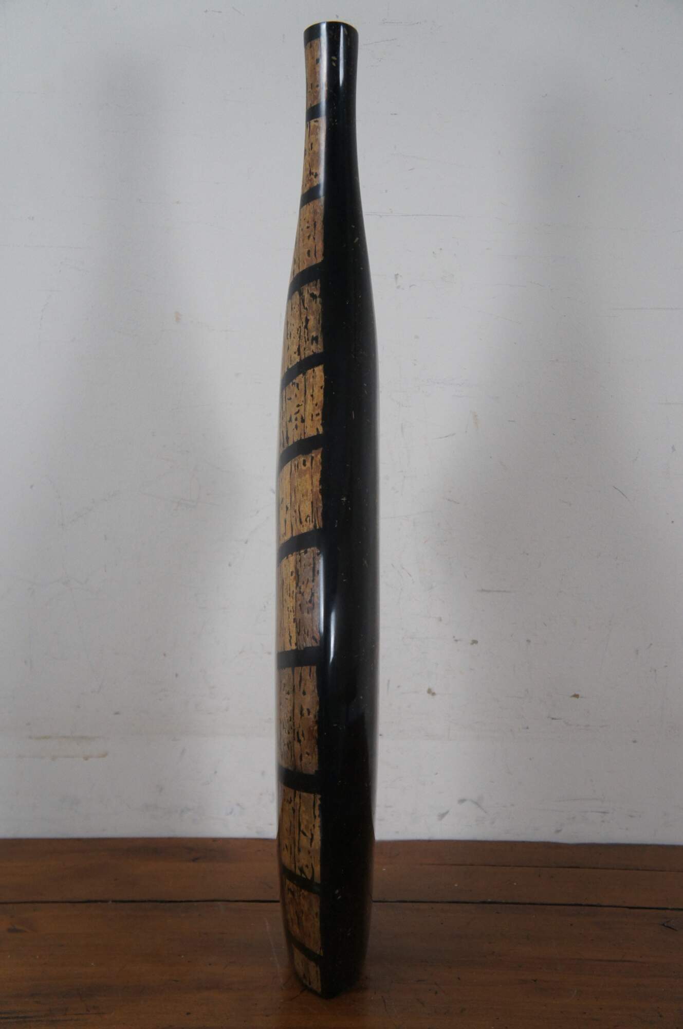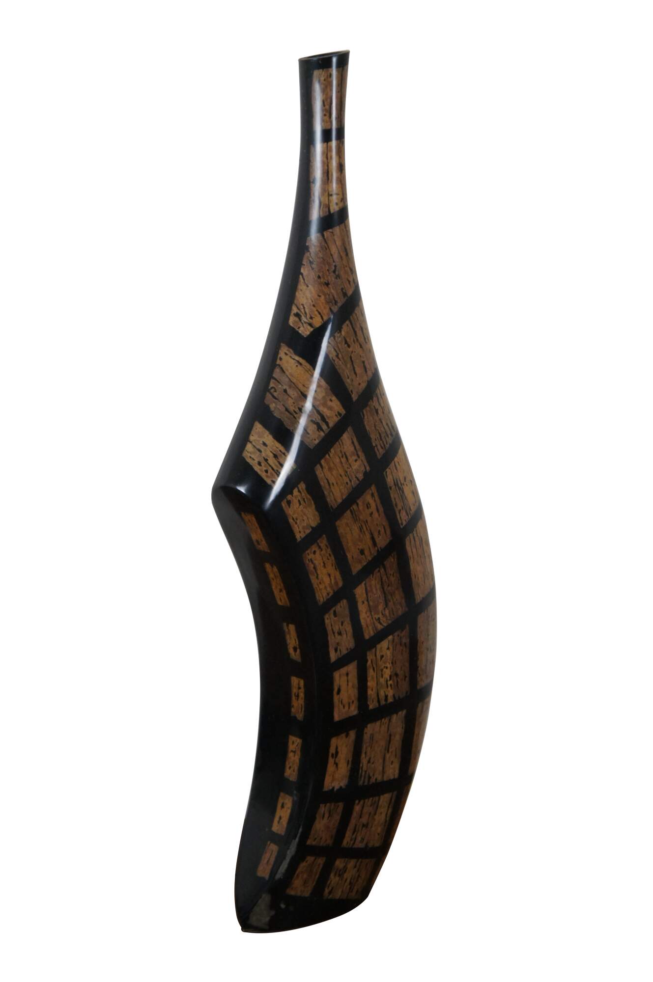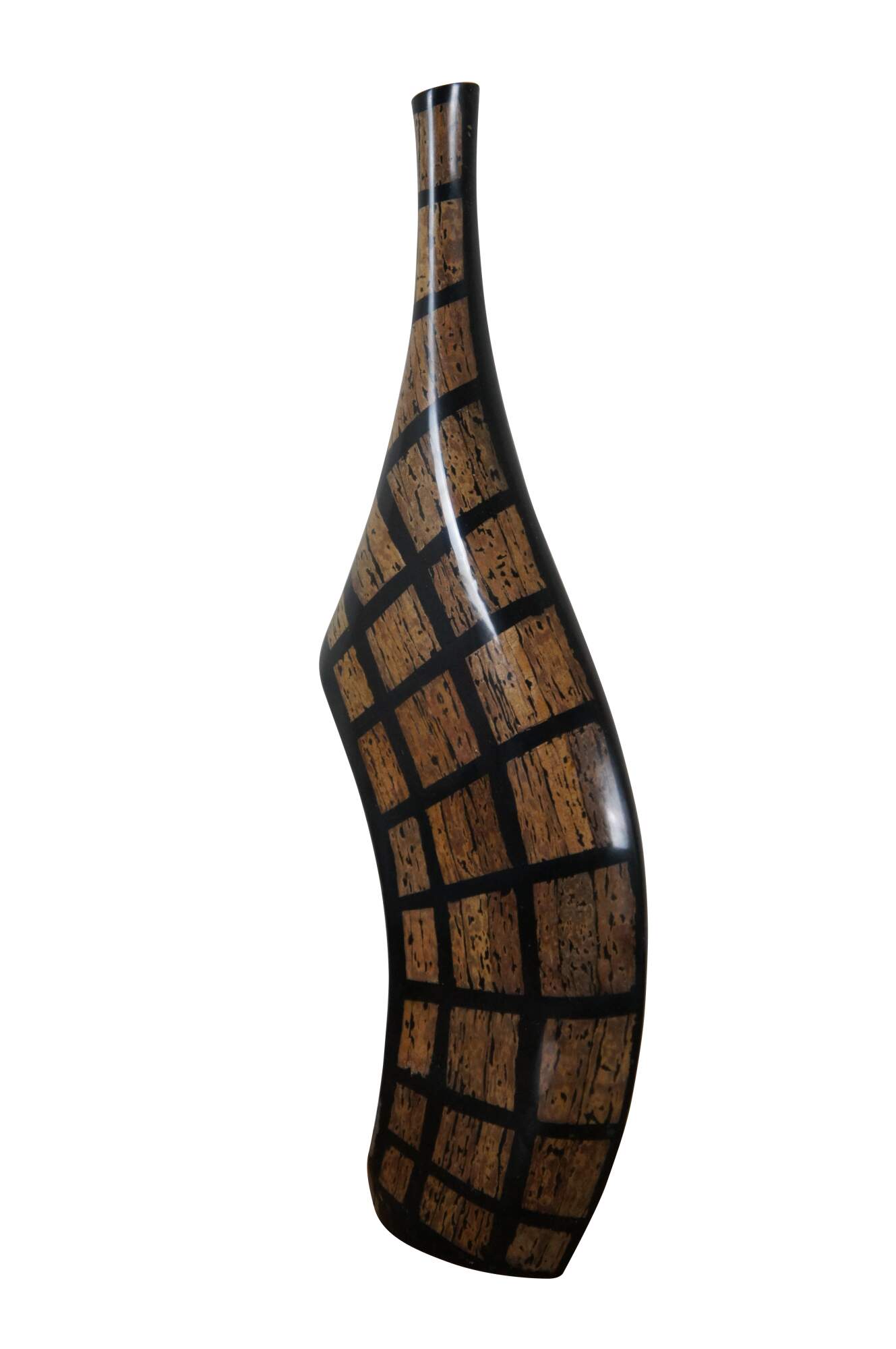 Vintage resin and lacquer floor vase with a unique modern sculptural form that features a swirling grid of coconut shell / tree bark / wood grain textured squares. Made in the Philippines.