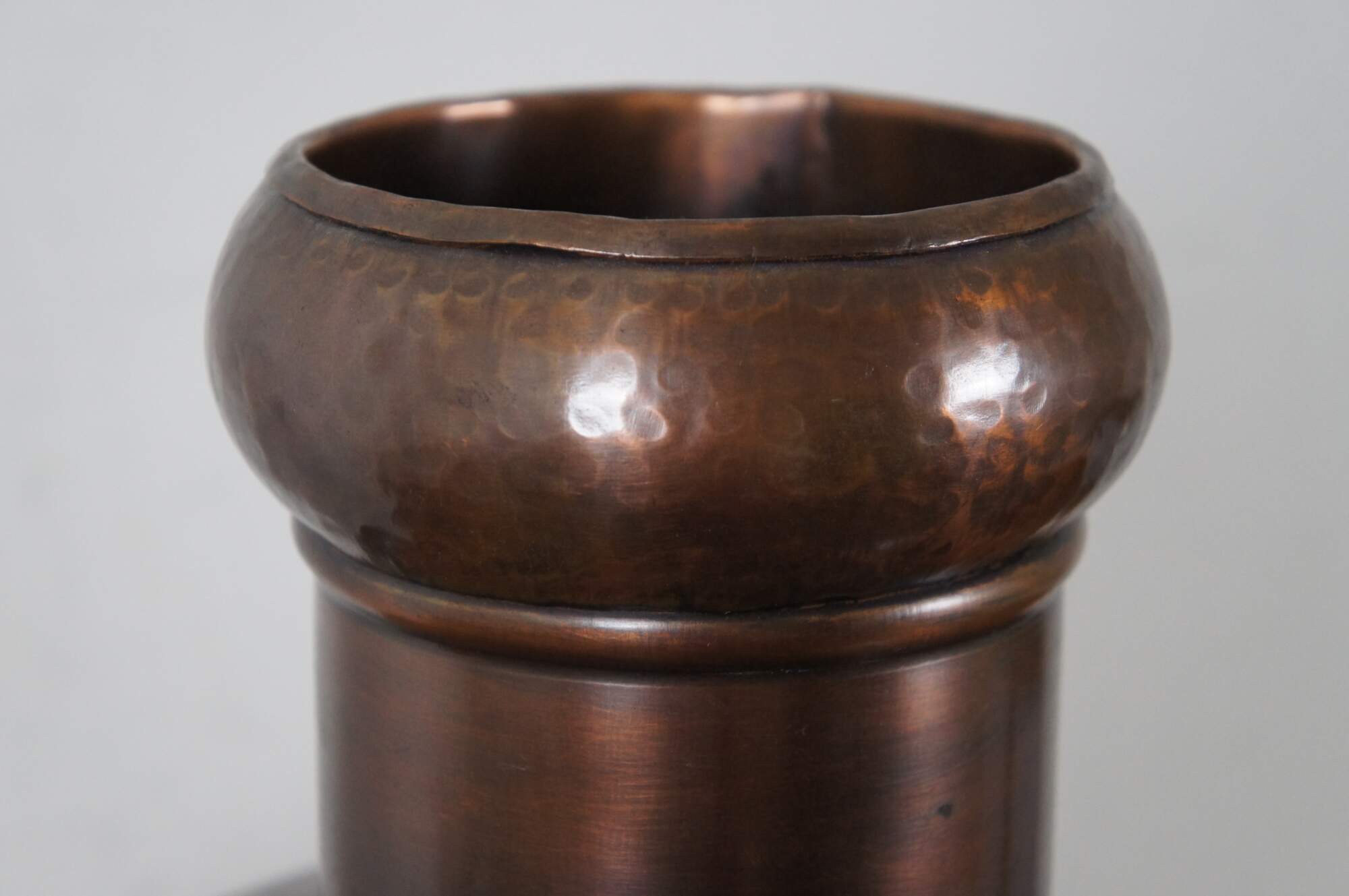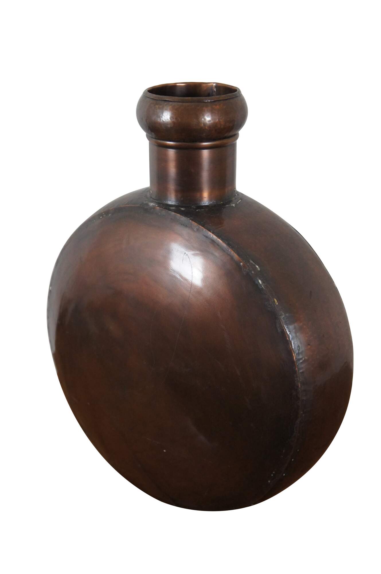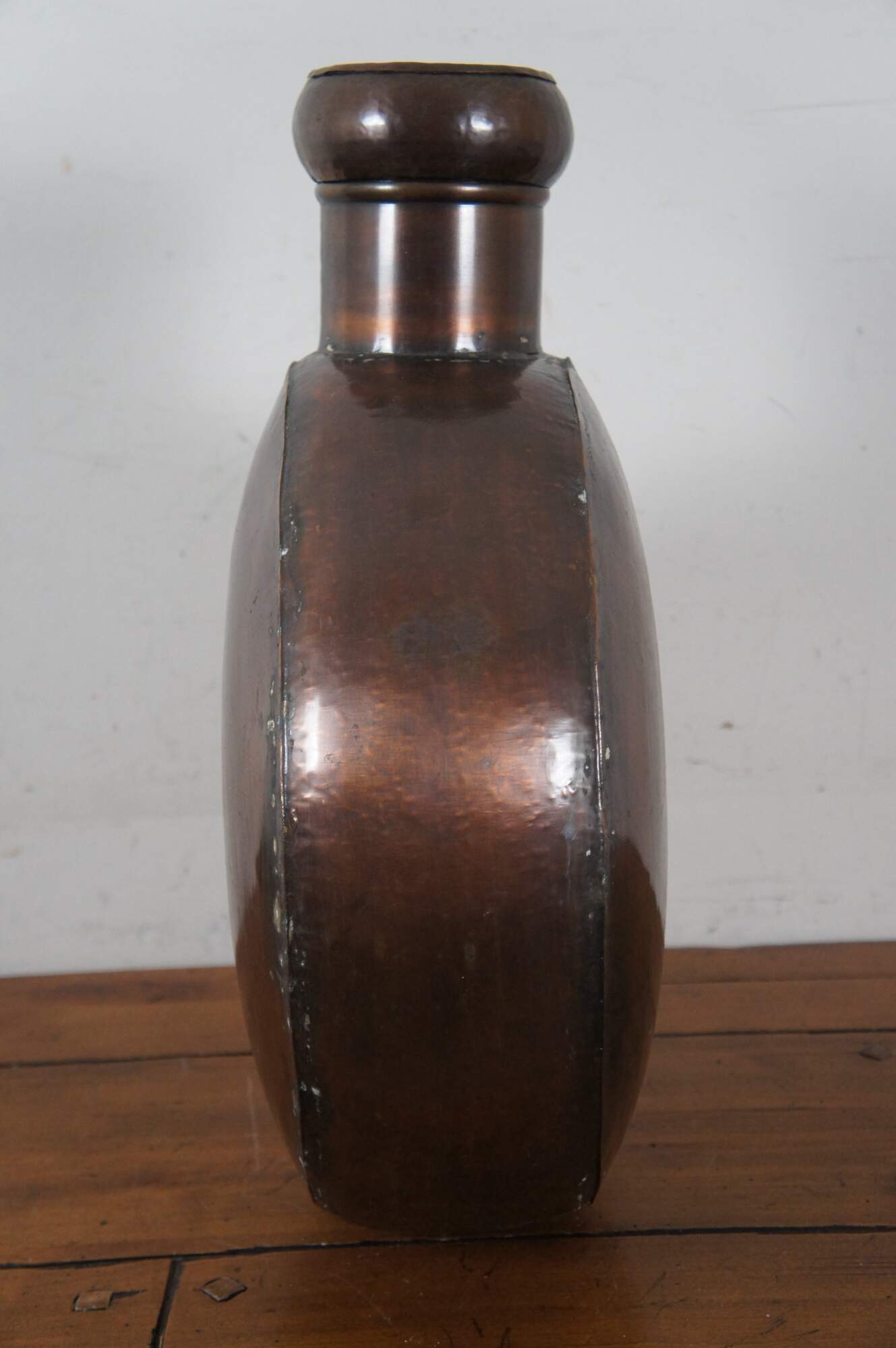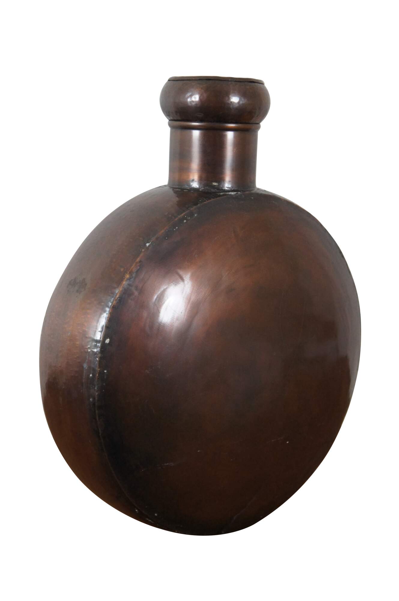 Vintage large scale copper flask / canteen with a round body and hammered rim. No stopper. No makers mark.