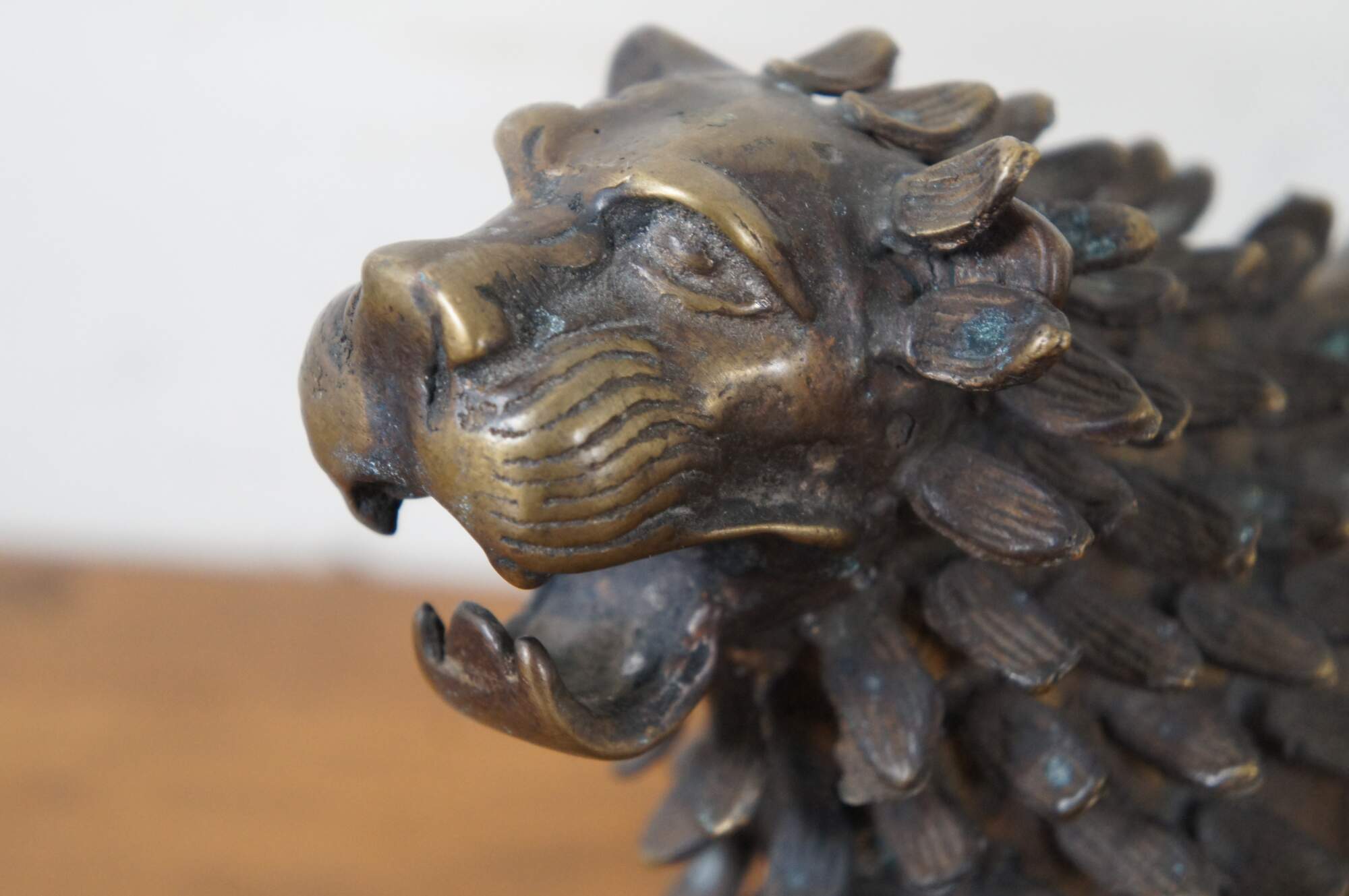 Pair of bronze mythological guardian lion / fu / foo dog figurines with pine cone like manes and snakes for tails. The style and stance are nearly identical to the Chimera of Arezzo – an ancient Etruscan sculpture – however these figures are missing the original goat’s head emerging from the lion’s side.