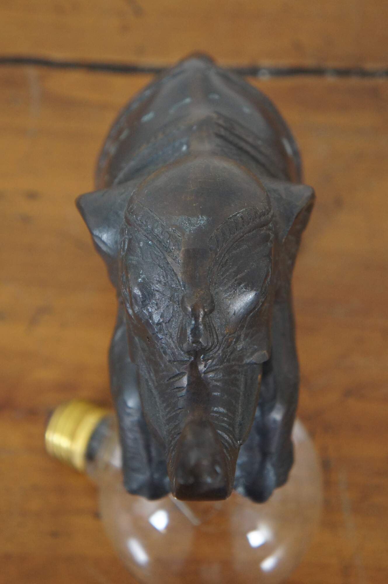 Late 20th century bronze figurine in the shape of an Indian elephant, dressed in tasseled cap and saddle blanket, ready for a circus performance. Bottoms of all feet padded with felt and angled to indicate he should be perched against another object, such as a ball.