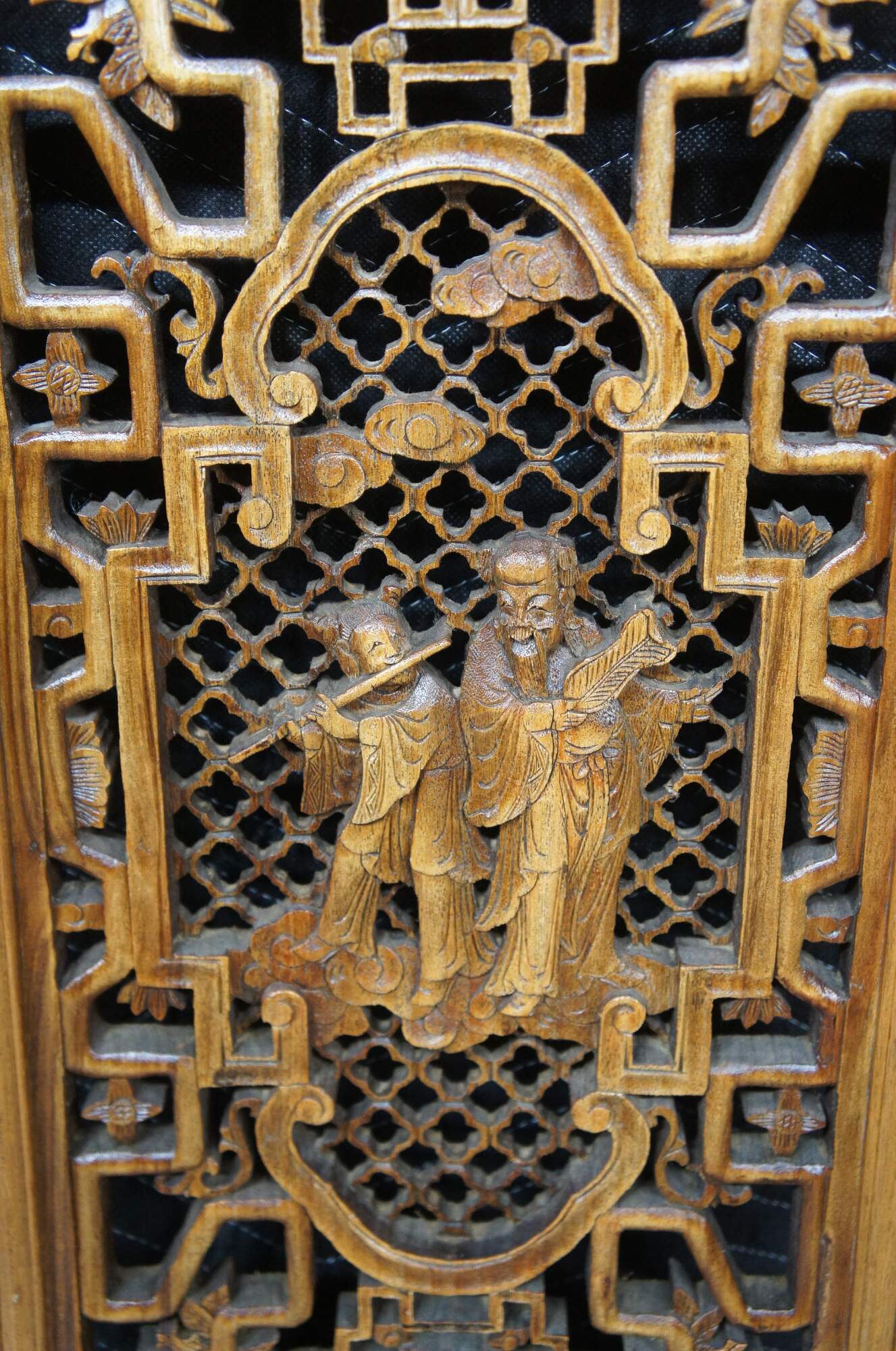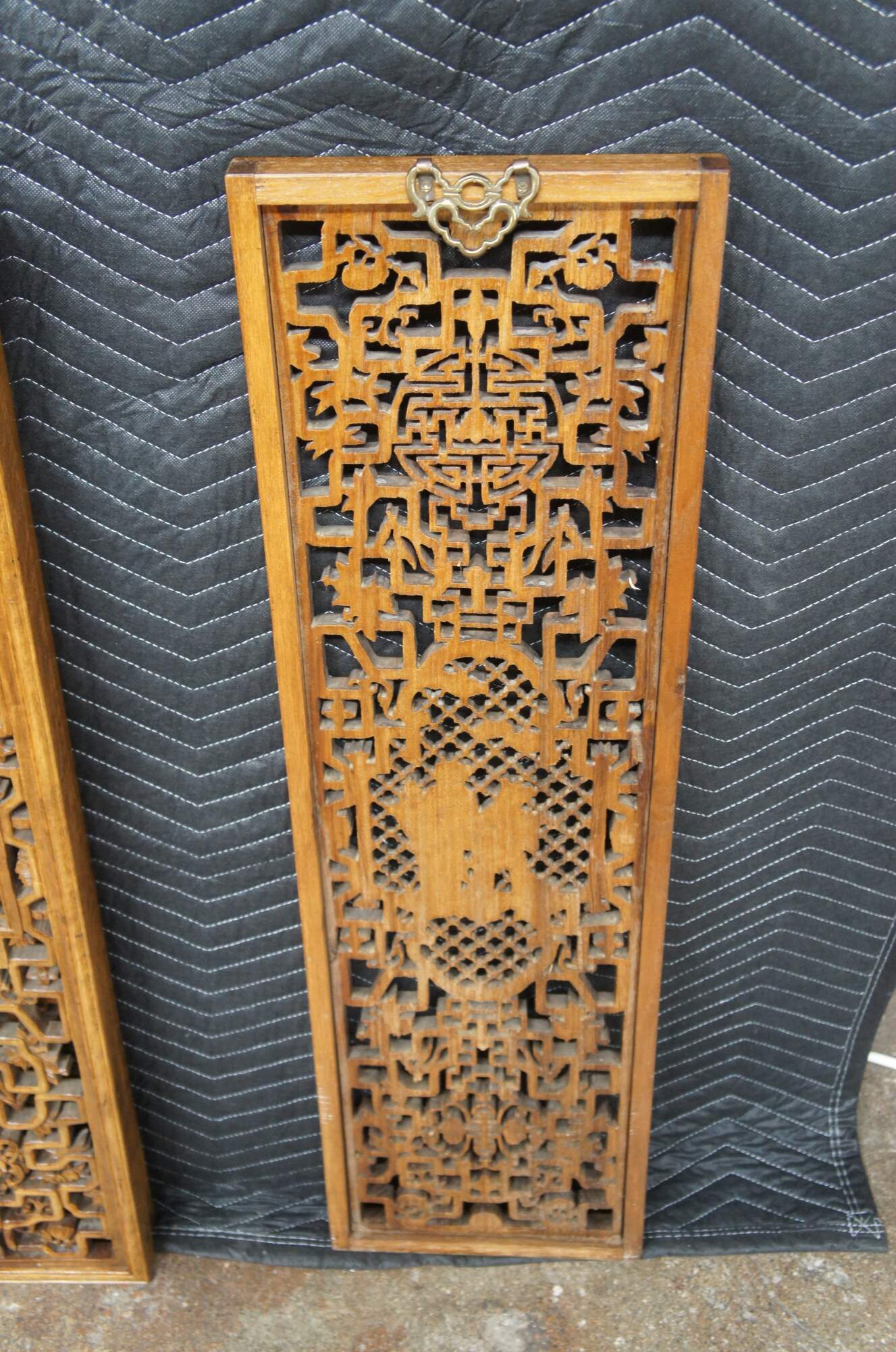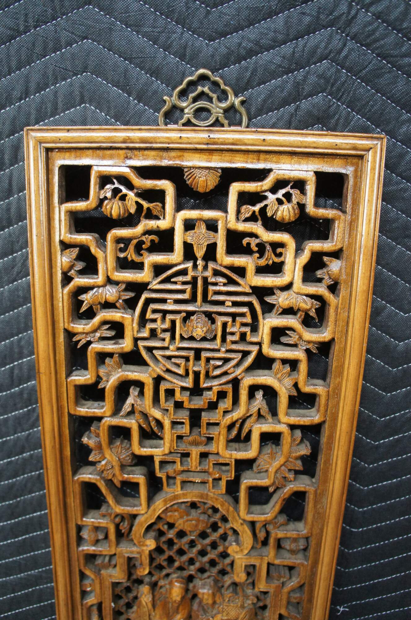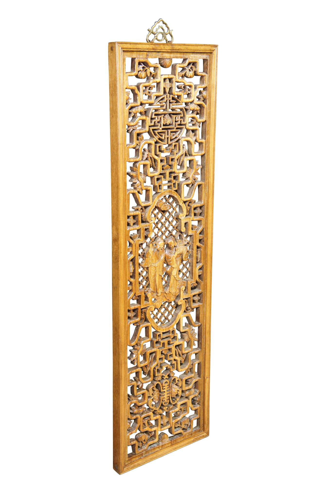 4 Vintage Chinese hardwood Qing Dynasty inspired carved panels. Features a pierced and scrolled detail with foliate, Chinese Greek key and immortal figures with lattice backing. Hangs via brass handle along the top.